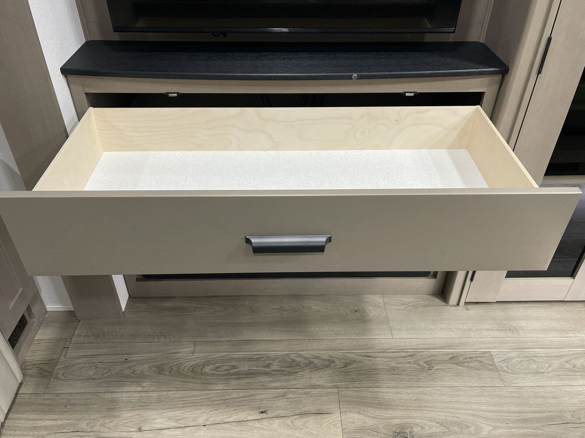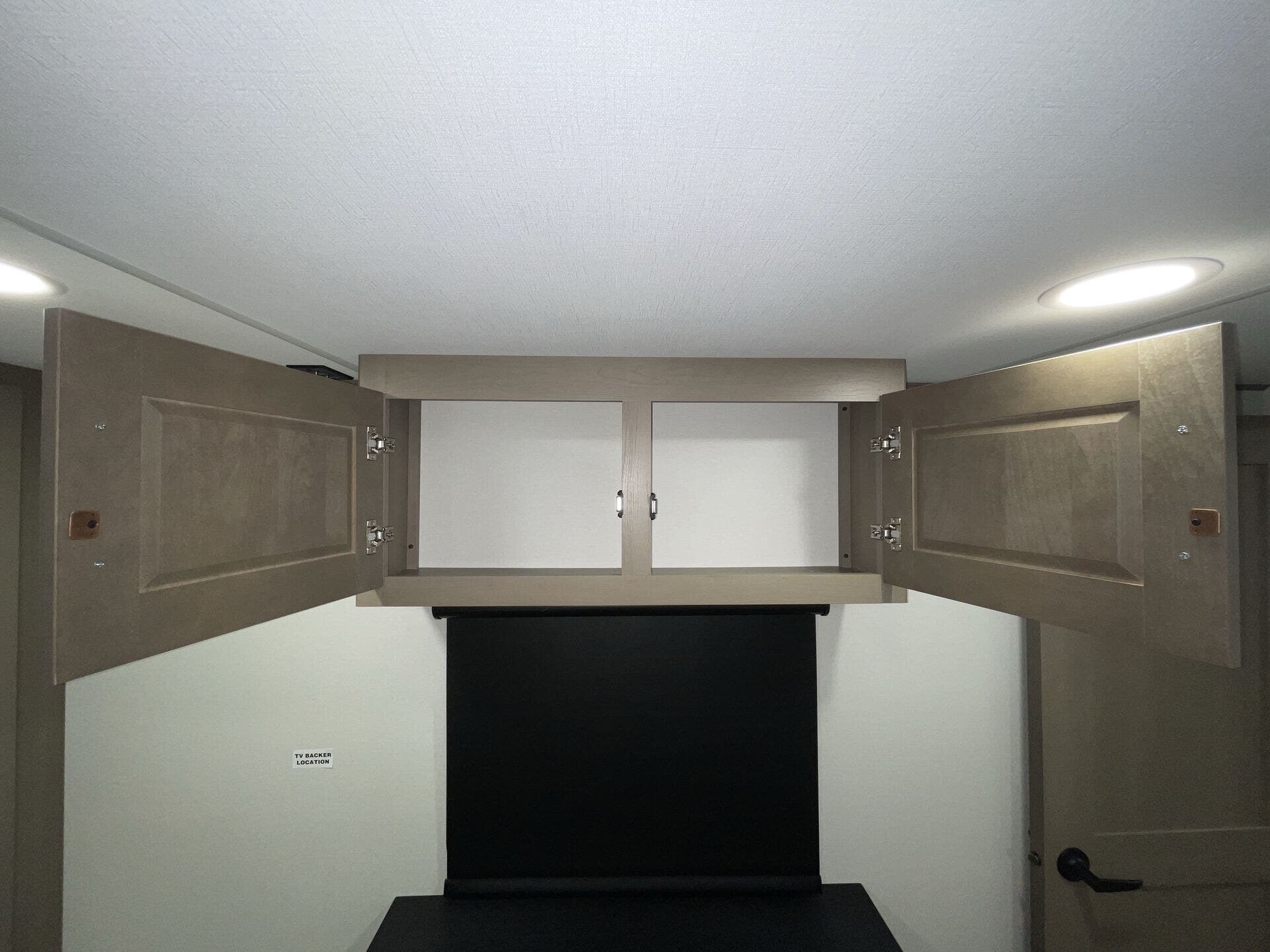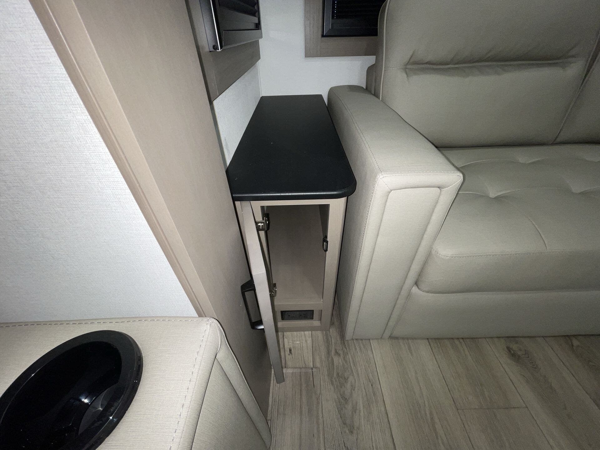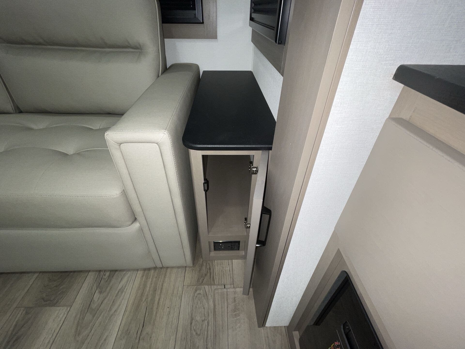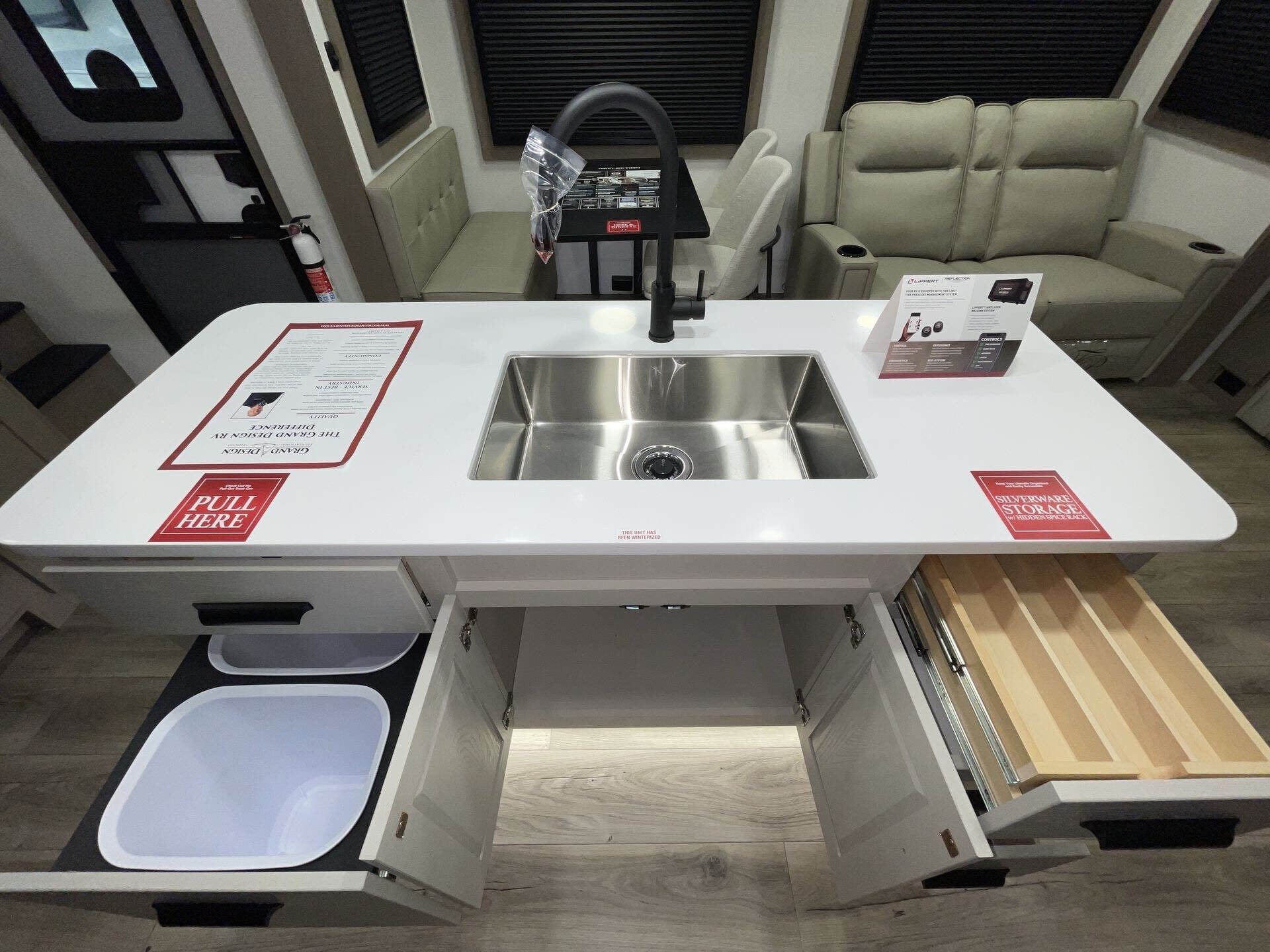 Inside, the rear lounge layout features theater seating, a tri-fold sofa, and a full entertainment center—perfect for relaxing after a day of travel. Large panoramic windows bring in natural light, enhancing the open-concept design. The kitchen is built for real use, with a center island, solid-surface countertops, a large 16 cu. ft. refrigerator, and ample pantry storage for longer stays.