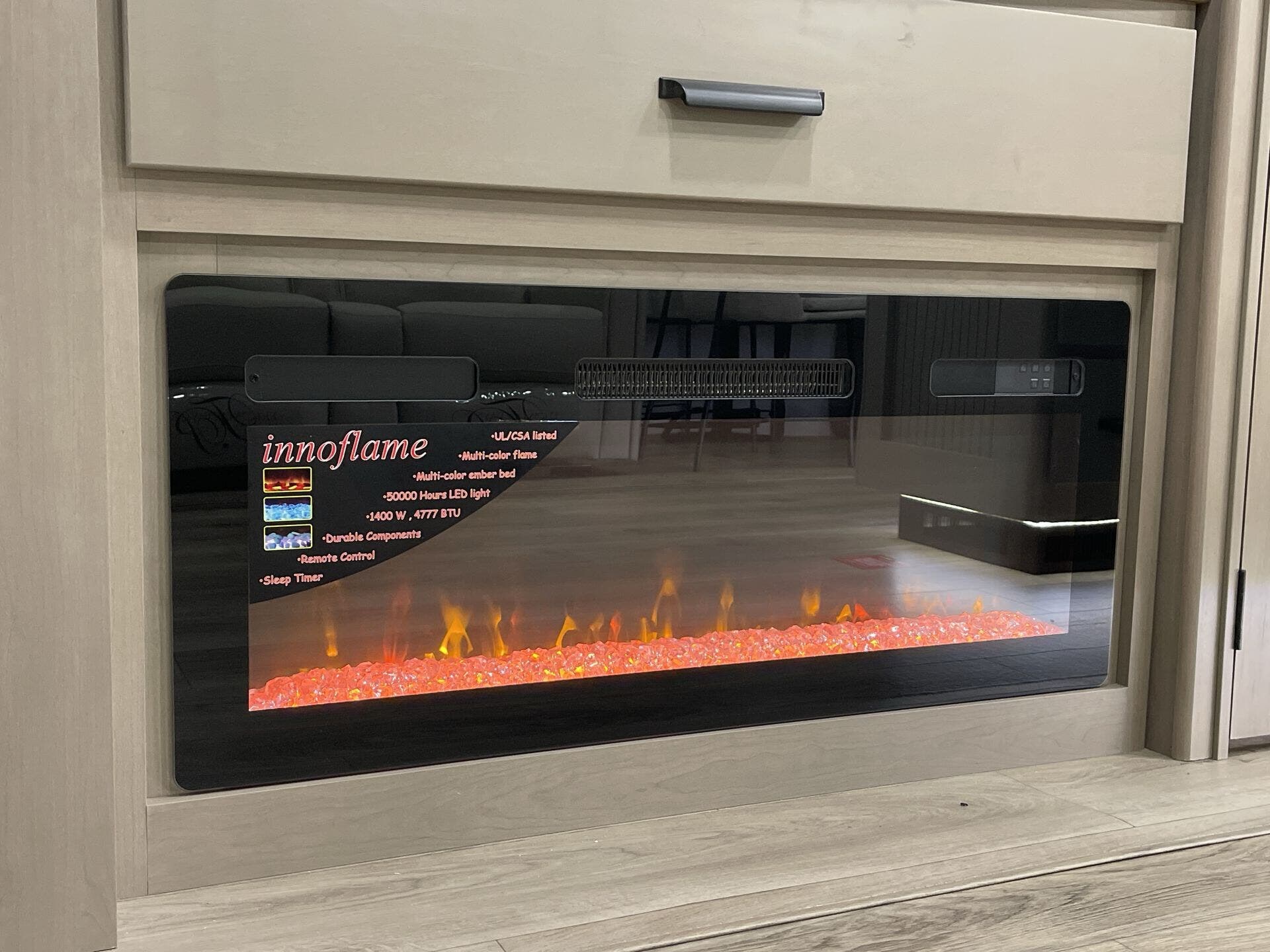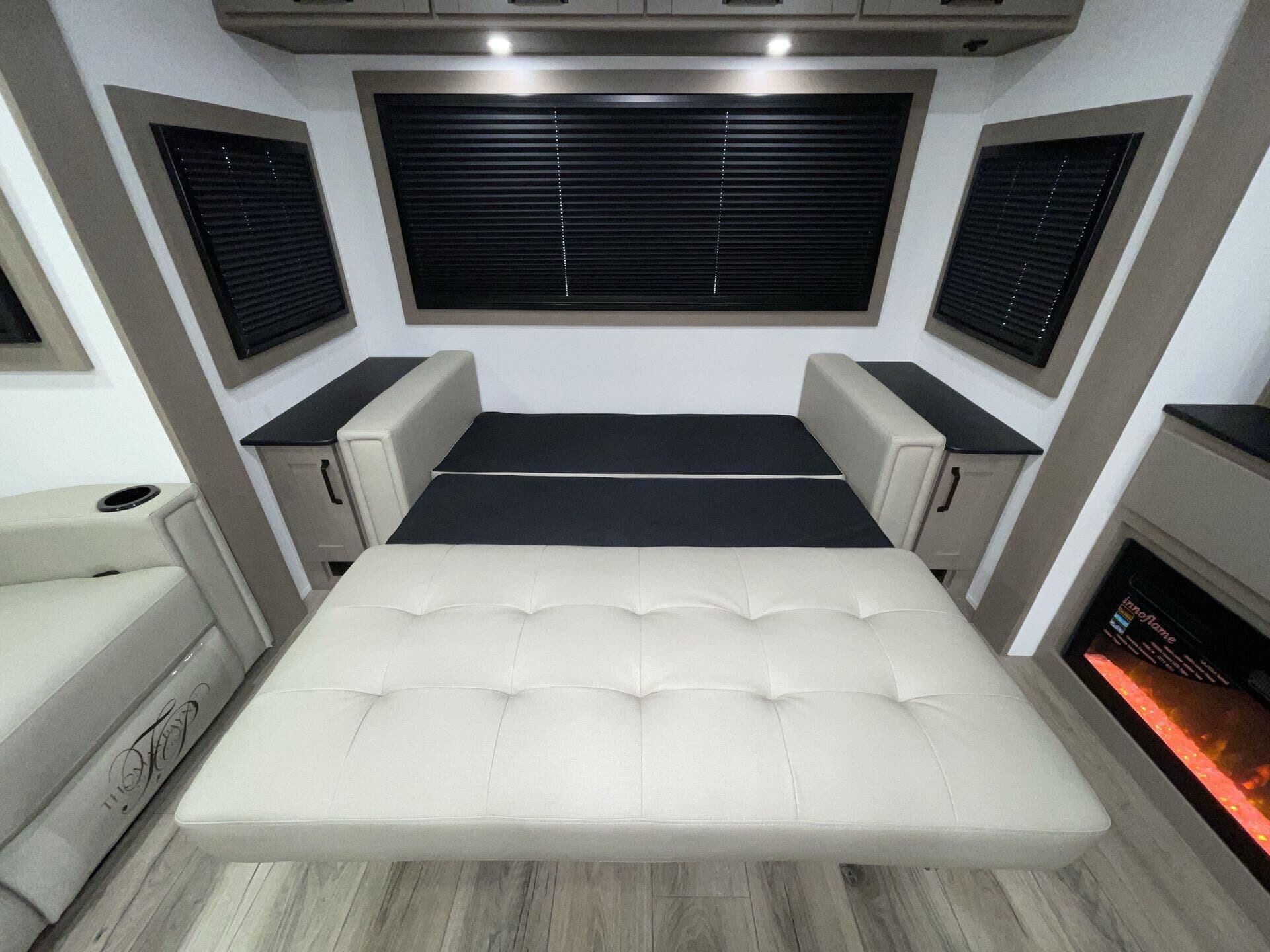 - Tri-fold sofa + entertainment center with TV & fireplace