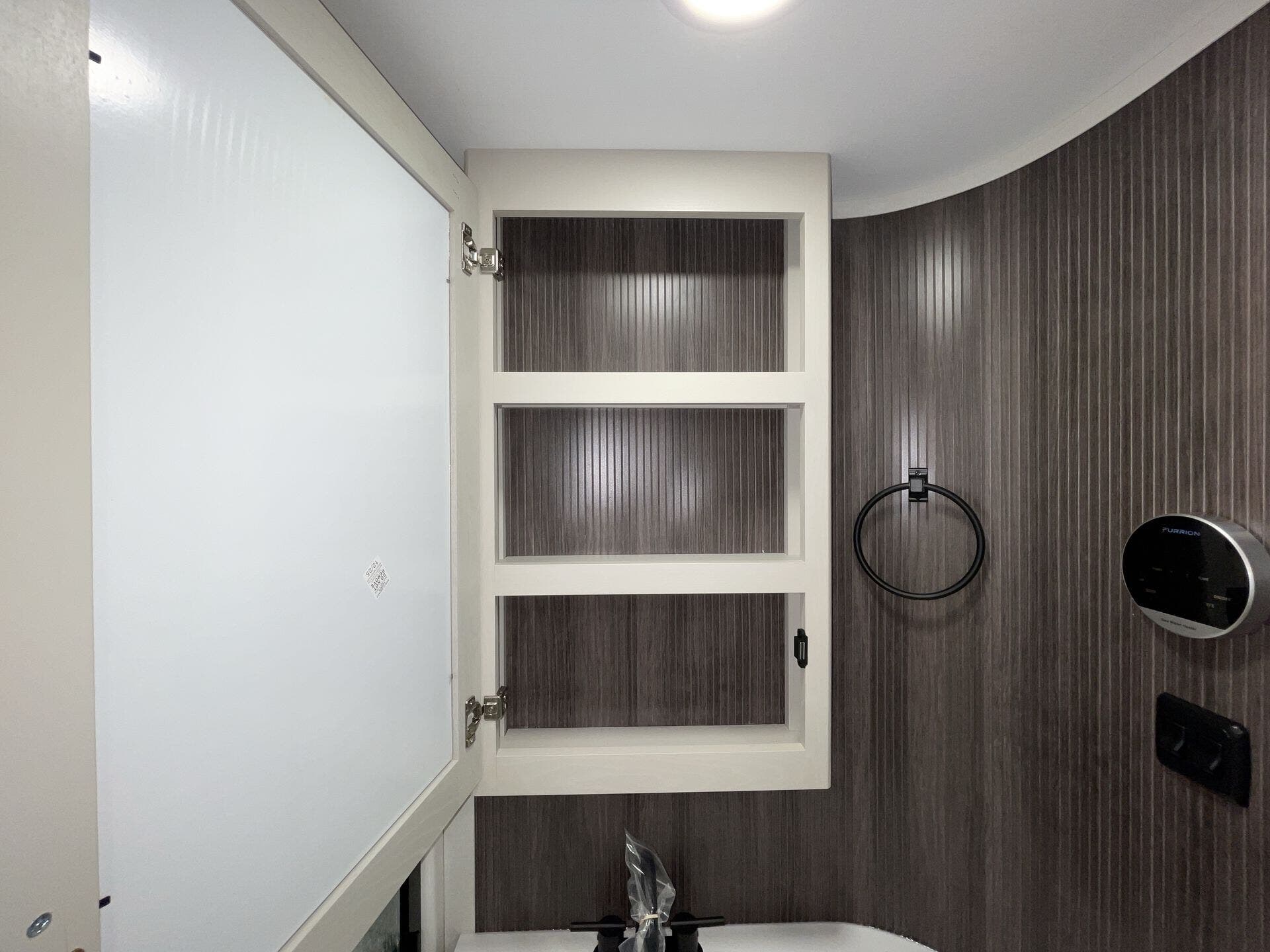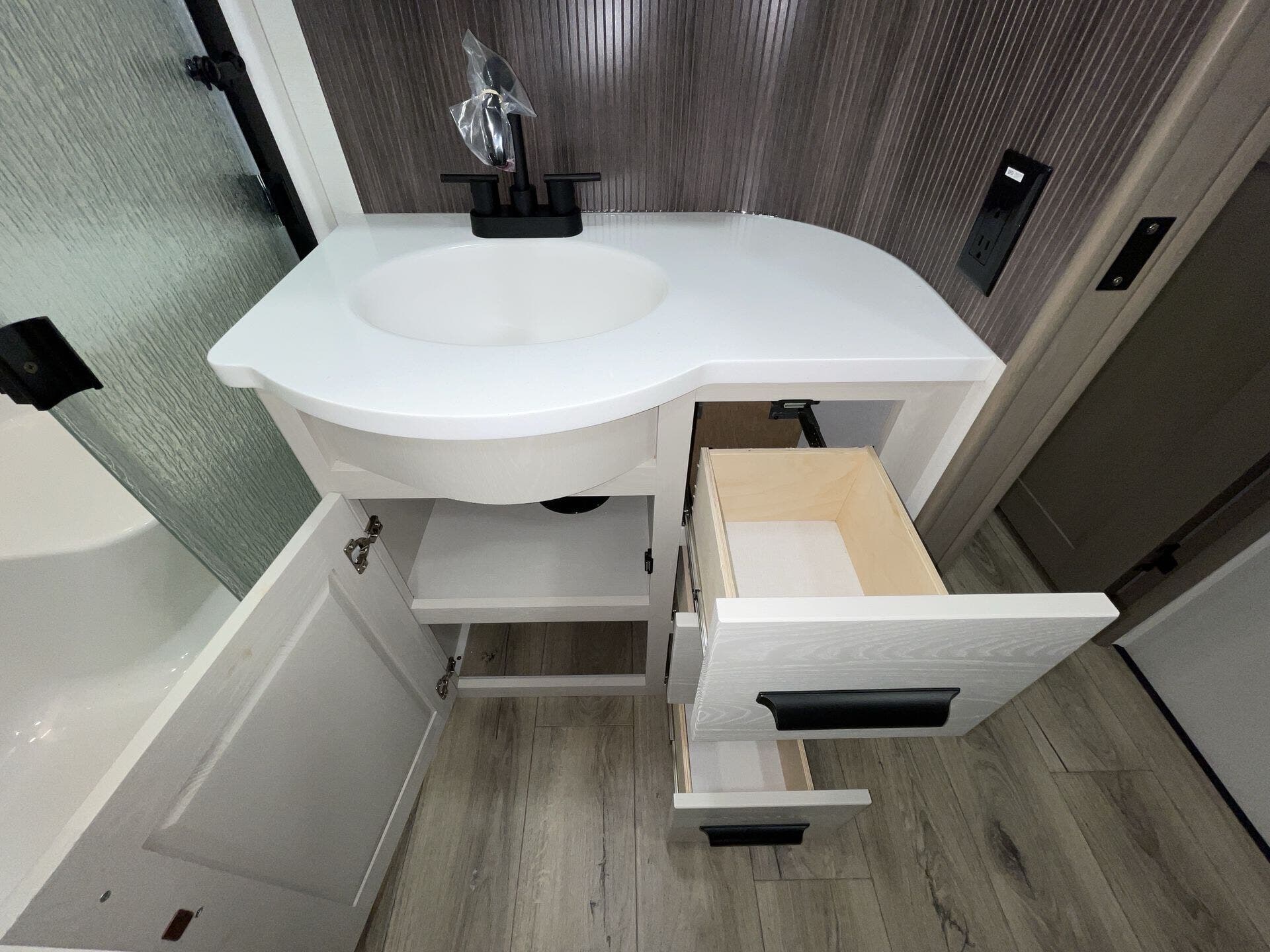 Booth Dinette, Dinette, Hide-A-Bed, Medicine Cabinet, Shower, Solid Surface Countertops, Toilet, Vanity