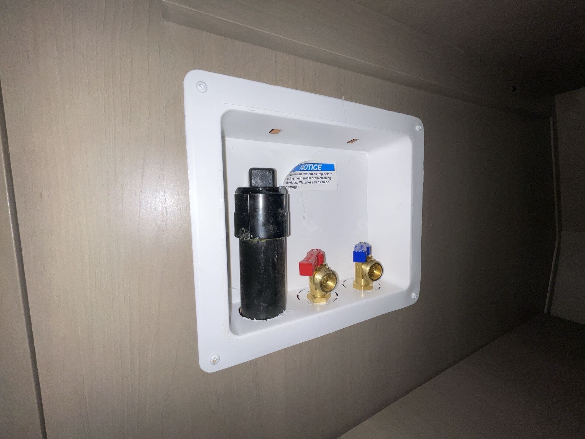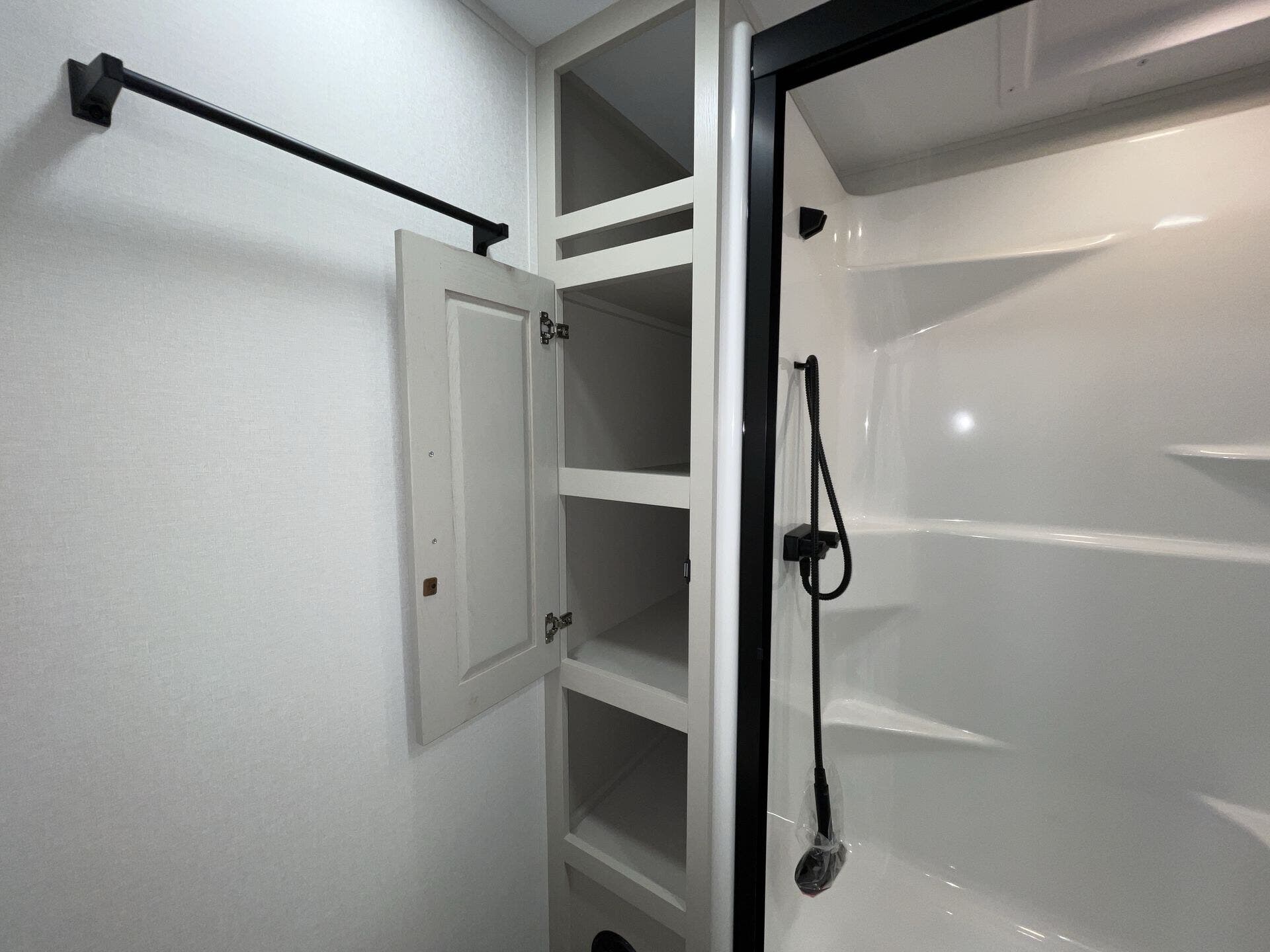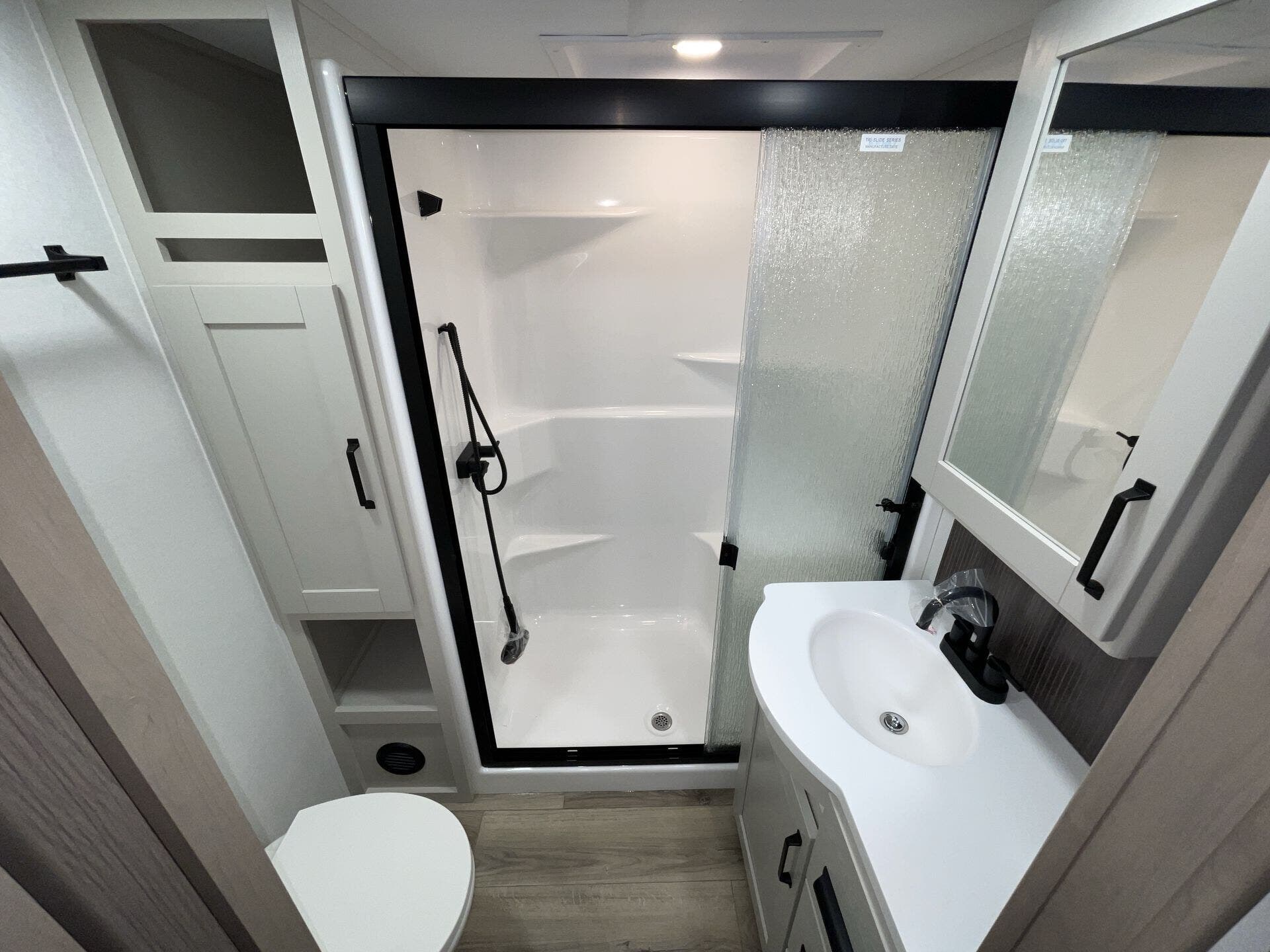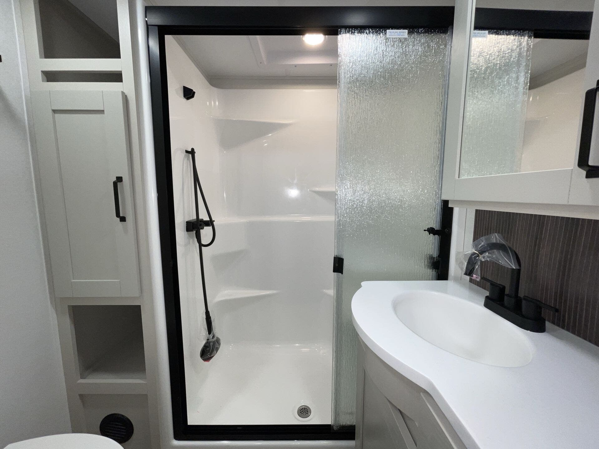 Up front, the private master suite includes a queen bed (with king option), wardrobe storage, and washer/dryer prep, while the bathroom offers a spacious glass shower and modern finishes.