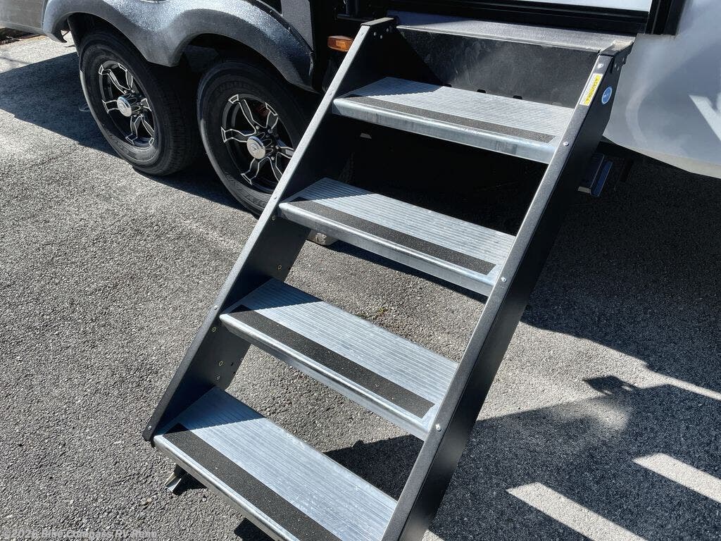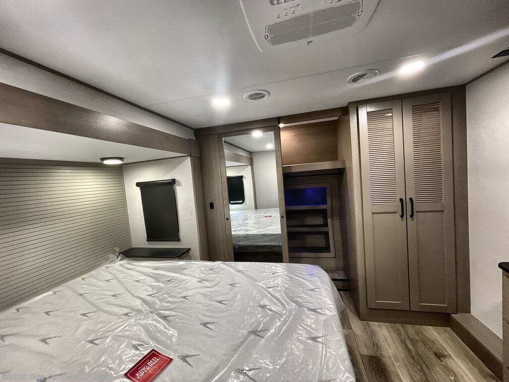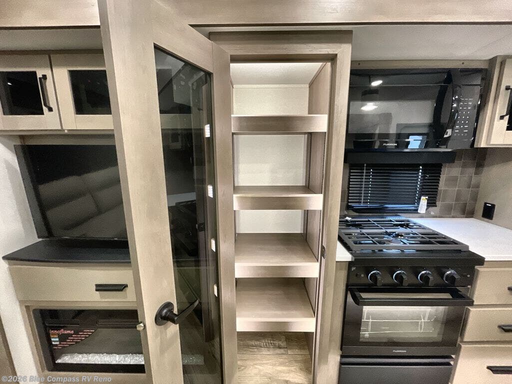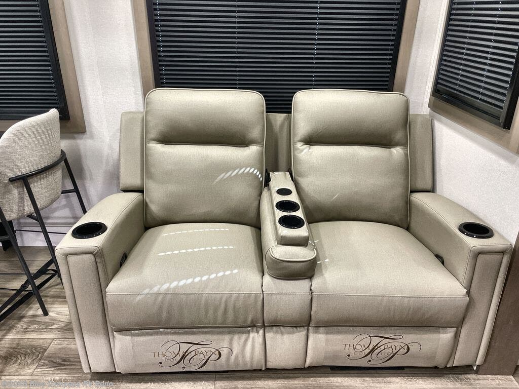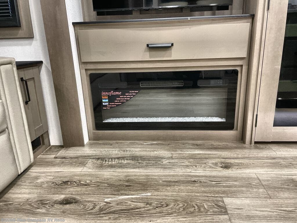 You can enjoy a spacious rear living area in this RV with dual opposing slides offering you entertainment, kitchen amenities, seating and windows for great views! The rear tri-fold sofa also converts into extra sleeping space for an extra guest or two, just like the booth dinette does. Yet you might like to add the swivel dinette option. There are theater seats to enjoy while you place your drinks in the cupholders and watch the entertainment center with a 40" LED HDTV and fireplace. The pantry is big enough to store your favorite snacks, and the kitchen island will make meal prepping easier, plus there is a 16-cu. ft. refrigerator to store any leftovers. The full bathroom has a 30" x 48" fiberglass shower and a linen closet to store your towels. The front private bedroom has a comfortable queen bed slide that can be switched out for the optional king bed, a dresser with overhead cabinets, and a full wall wardrobe that is prepped to add the optional washer!