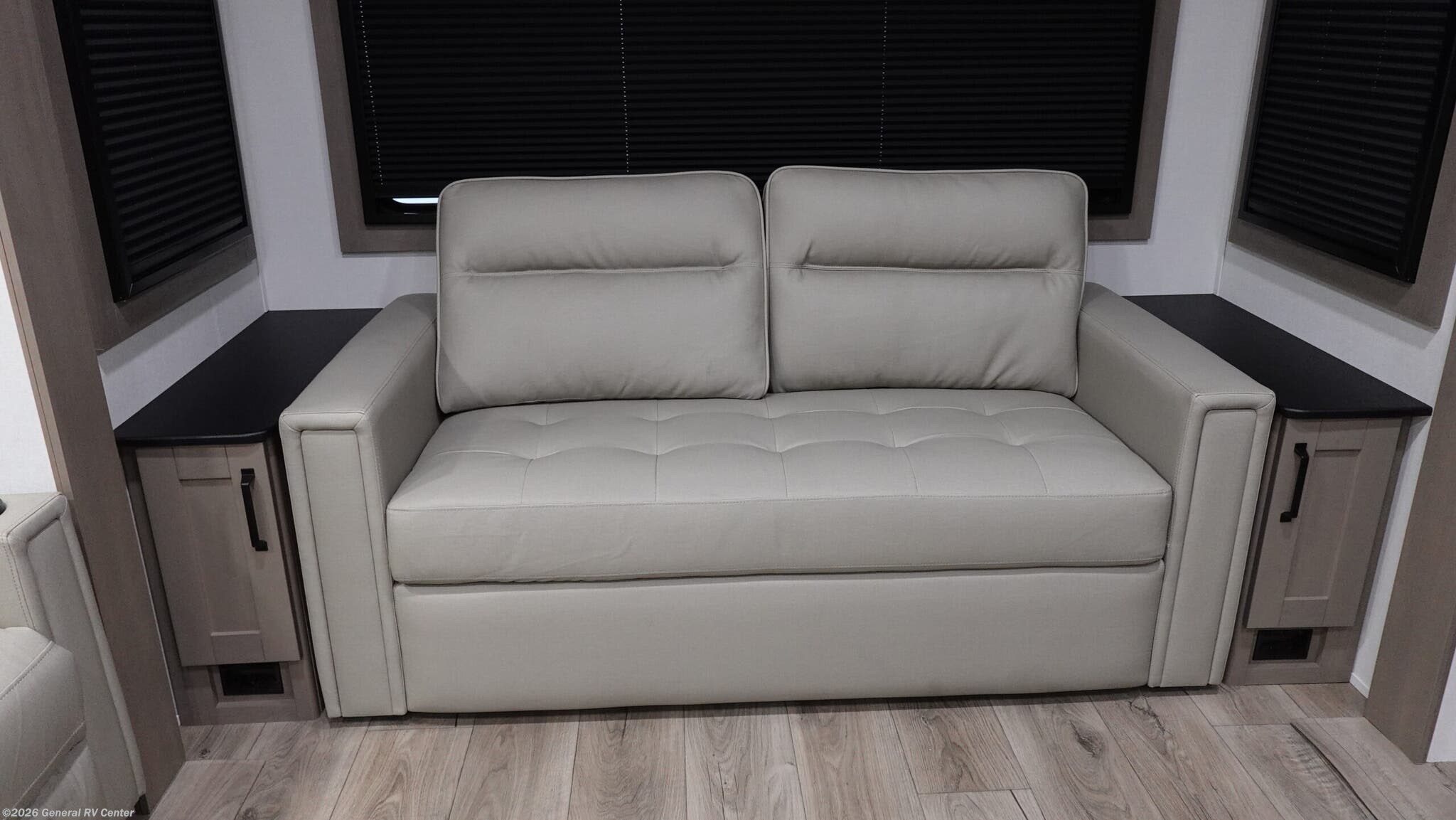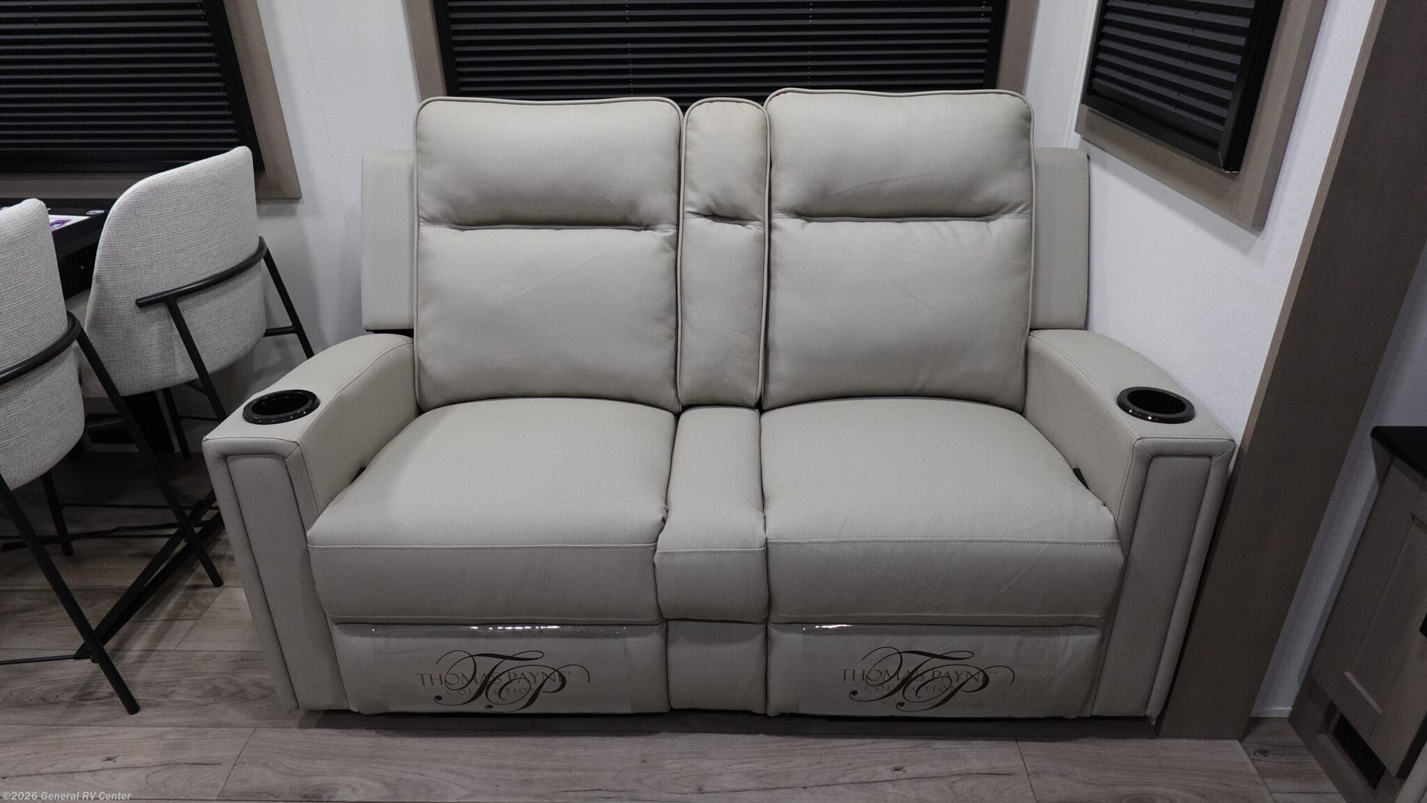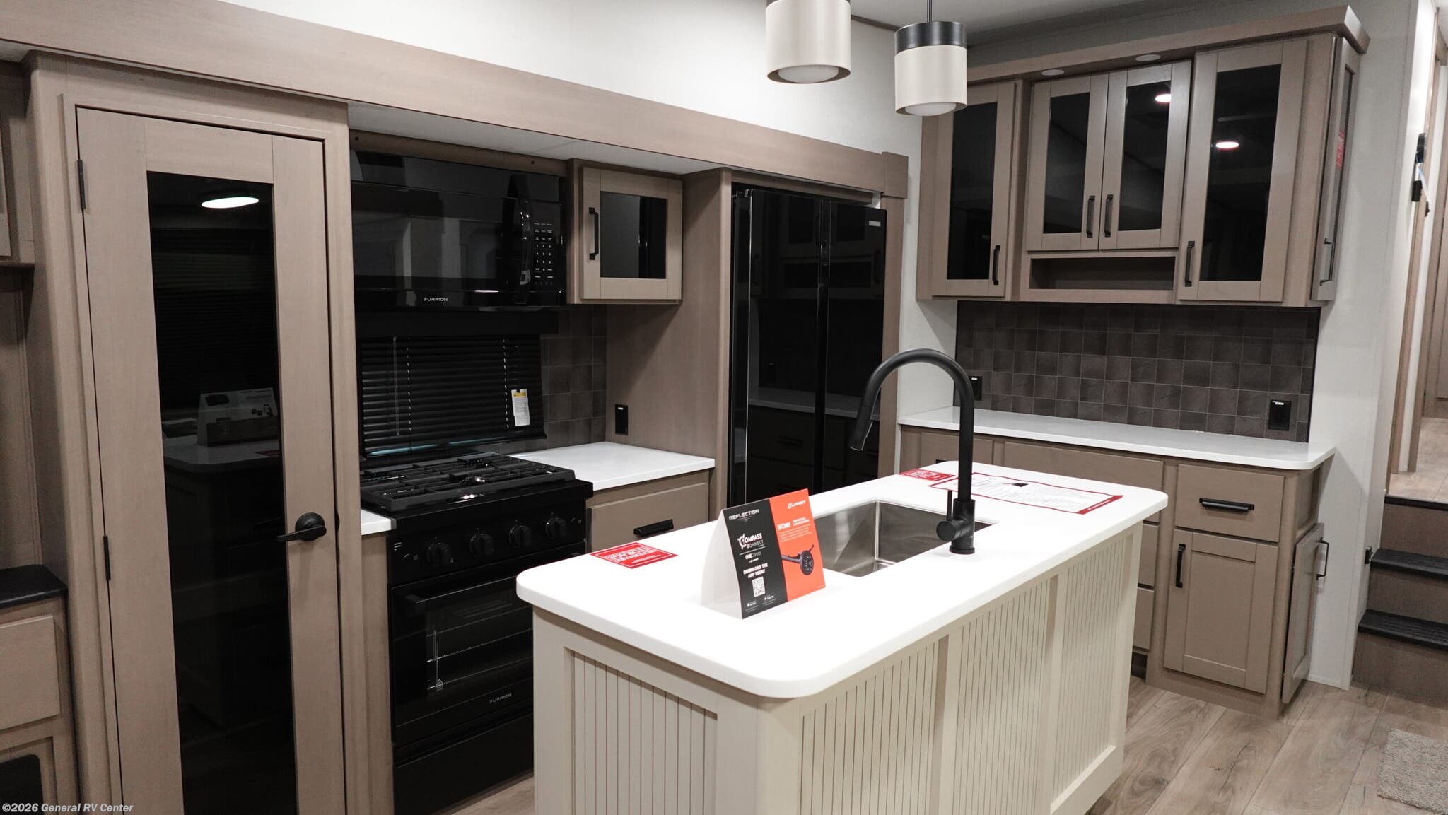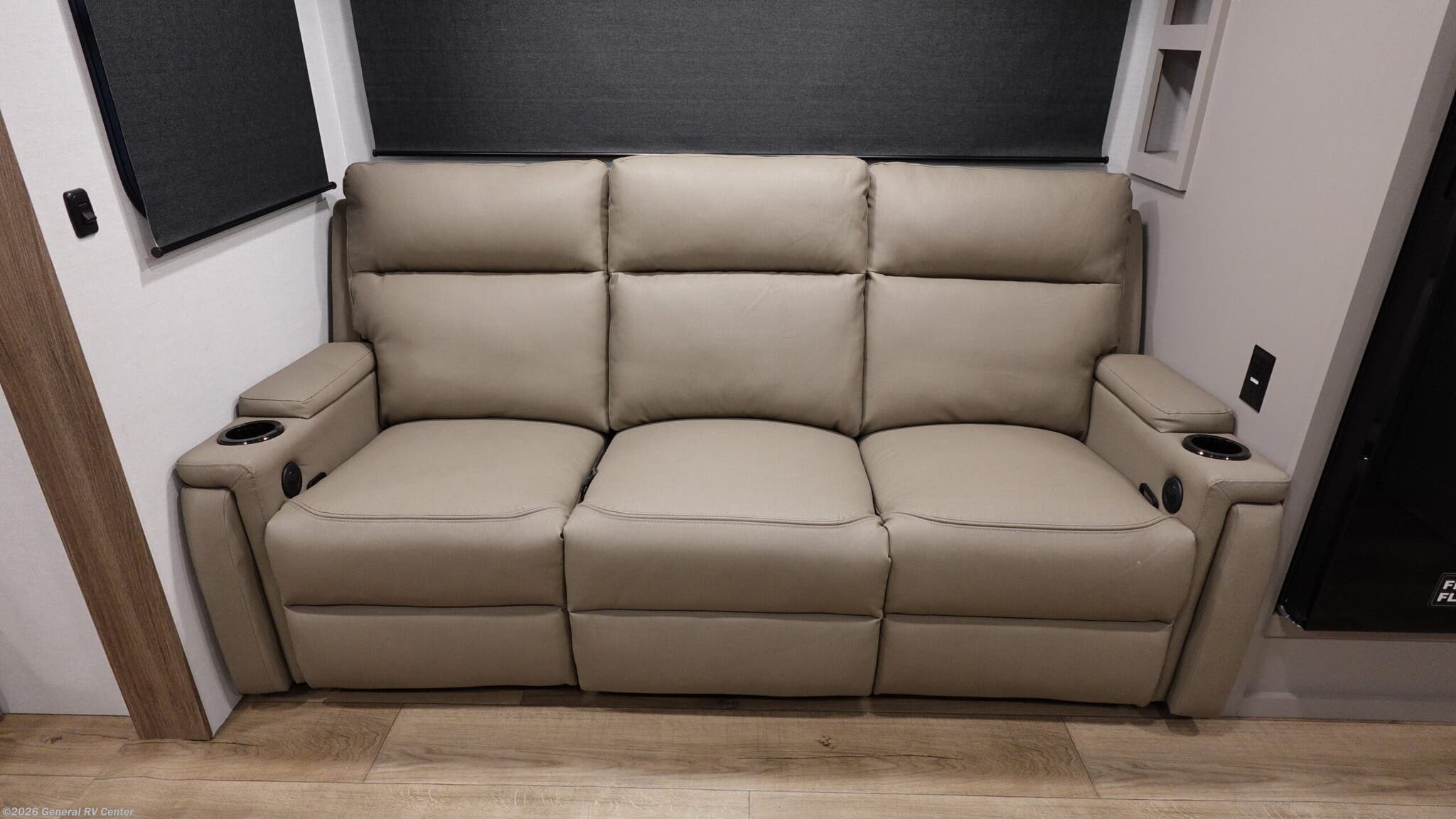 Experience the ultimate in comfort and style with the 2026 Grand Design Reflection 337RLS. This luxurious fifth wheel is designed for those who crave the perfect blend of elegance and functionality. As you enter, you'll be greeted by a spacious rear living area featuring plush theater seating and a tri-fold sofa, perfect for relaxing after a day of adventure. The entertainment center, complete with a 40" TV, ensures that movie nights are nothing short of spectacular. The center kitchen boasts a full-size refrigerator and a three-burner cooktop, making meal preparation a breeze, whether you're serving a quick snack or a gourmet dinner. Moving towards the front, the Reflection 337RLS offers a serene sanctuary in the bedroom with a 60" x 80" queen bed, and the option to upgrade to a king. The ample storage and washer/dryer prep provide convenience for extended stays. The center bath, equipped with a plastic/glass shower, offers a refreshing space to unwind. With a powered retractable awning stretching over 26 feet, outdoor relaxation is just as inviting. This RV is not just a vehicle; it's a home on wheels, ready to take you on unforgettable journeys. For more details, visit your nearest General RV dealership.