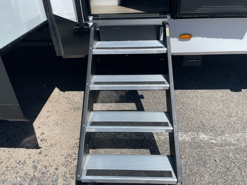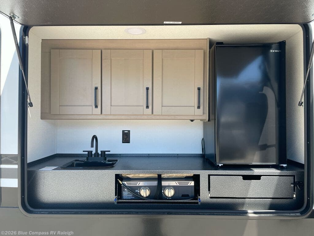 Finding the perfect trailer for a larger group is simple with this Reflection! The rear bunkhouse might be the first reason you fall in love because of the slide out with a flip top bunk above a tri-fold sofa, a second bunk bed with a window on the opposite side and storage below, and the large rear window for great views. The outside kitchen might be another reason allowing you to enjoy the outdoors while providing meals for everyone, and/or the inside gourmet kitchen with a 16-cu. ft. refrigerator, an island, and additional storage space. Everyone can gather together and relax on the theater seating with cupholders and the booth dinette across from the entertainment center and fireplace. An optional tri-fold sofa can be chosen in place of the theater seat, and an optional free-standing dinette can be chosen in place of the booth dinette if you prefer these seating options. The full bathroom includes a space savings sliding door and linen storage, and the bedroom gives you a front walk-around queen bed with storage for your clothes, plus there is an additional wardrobe with washer and dryer prep if you choose to add these appliances.