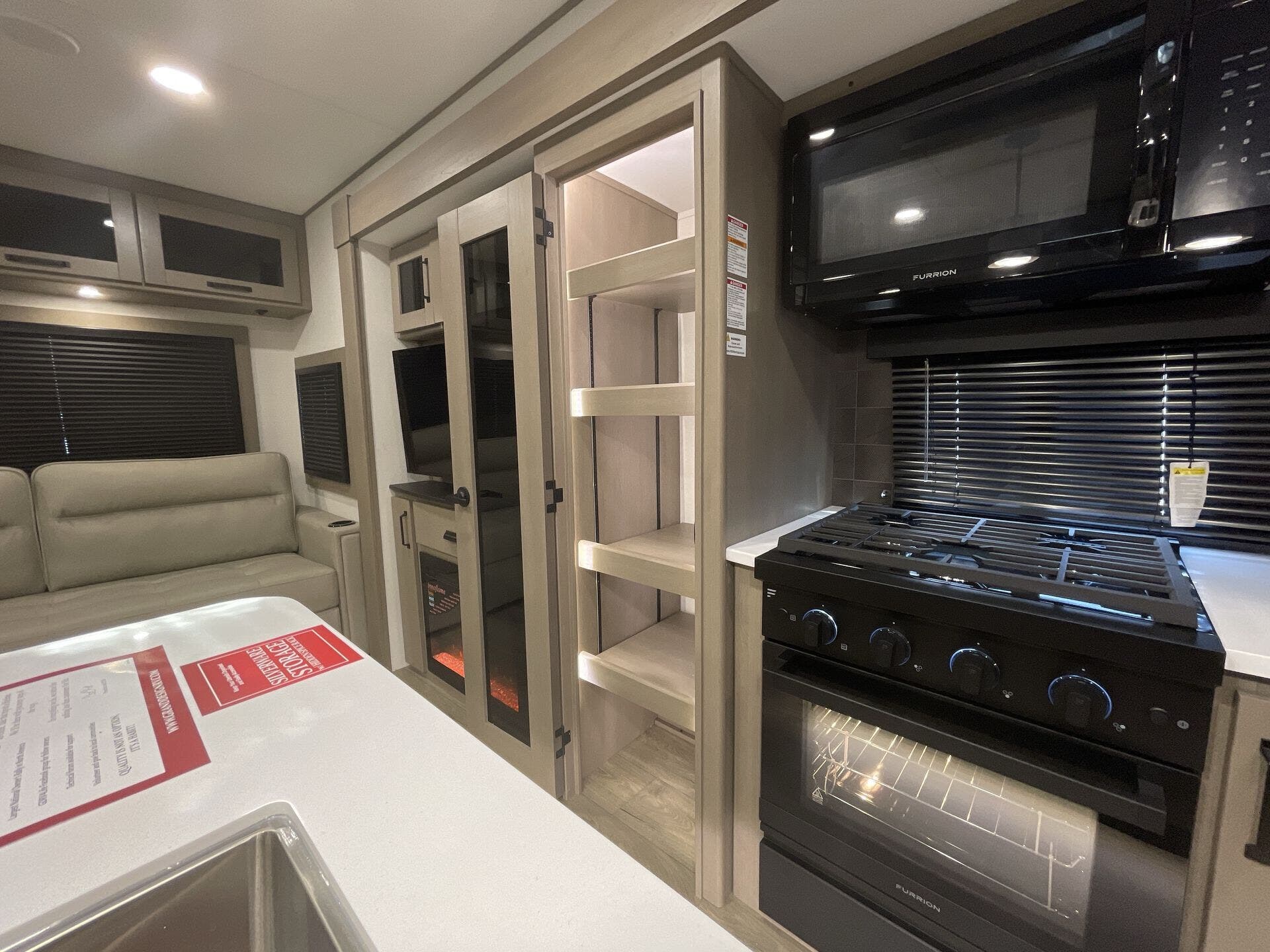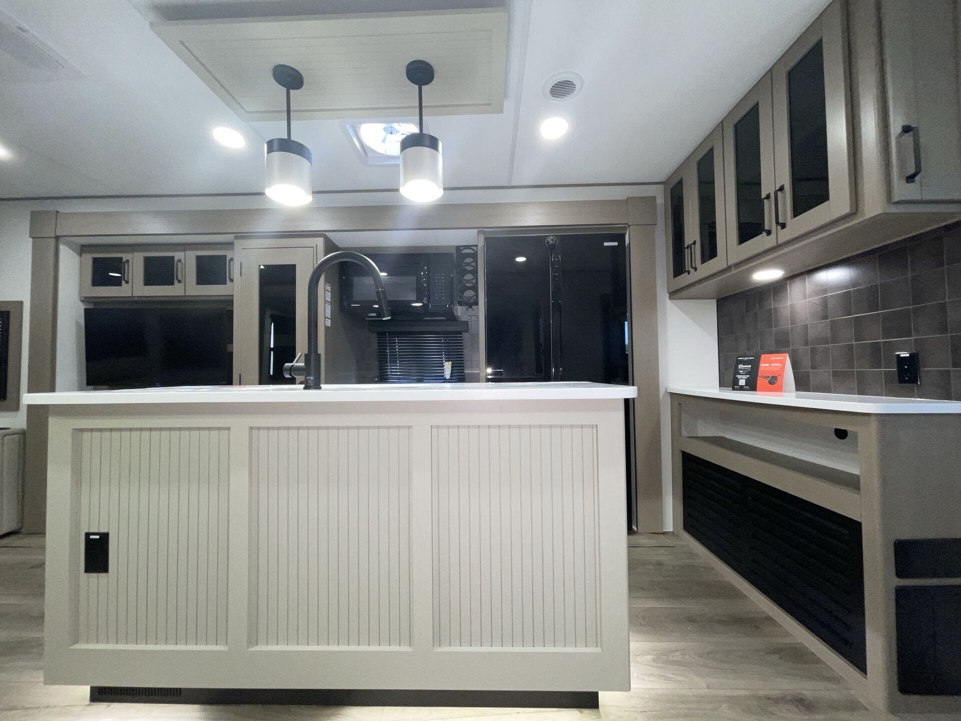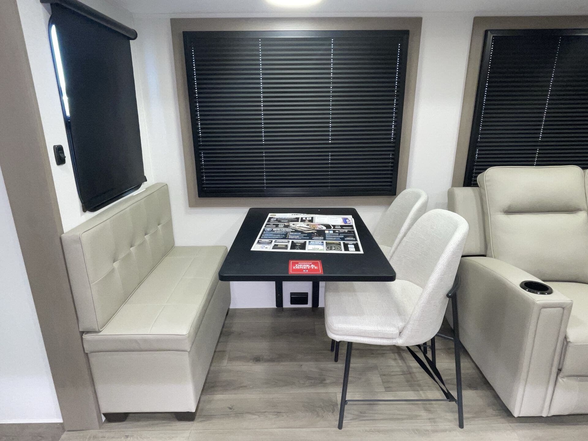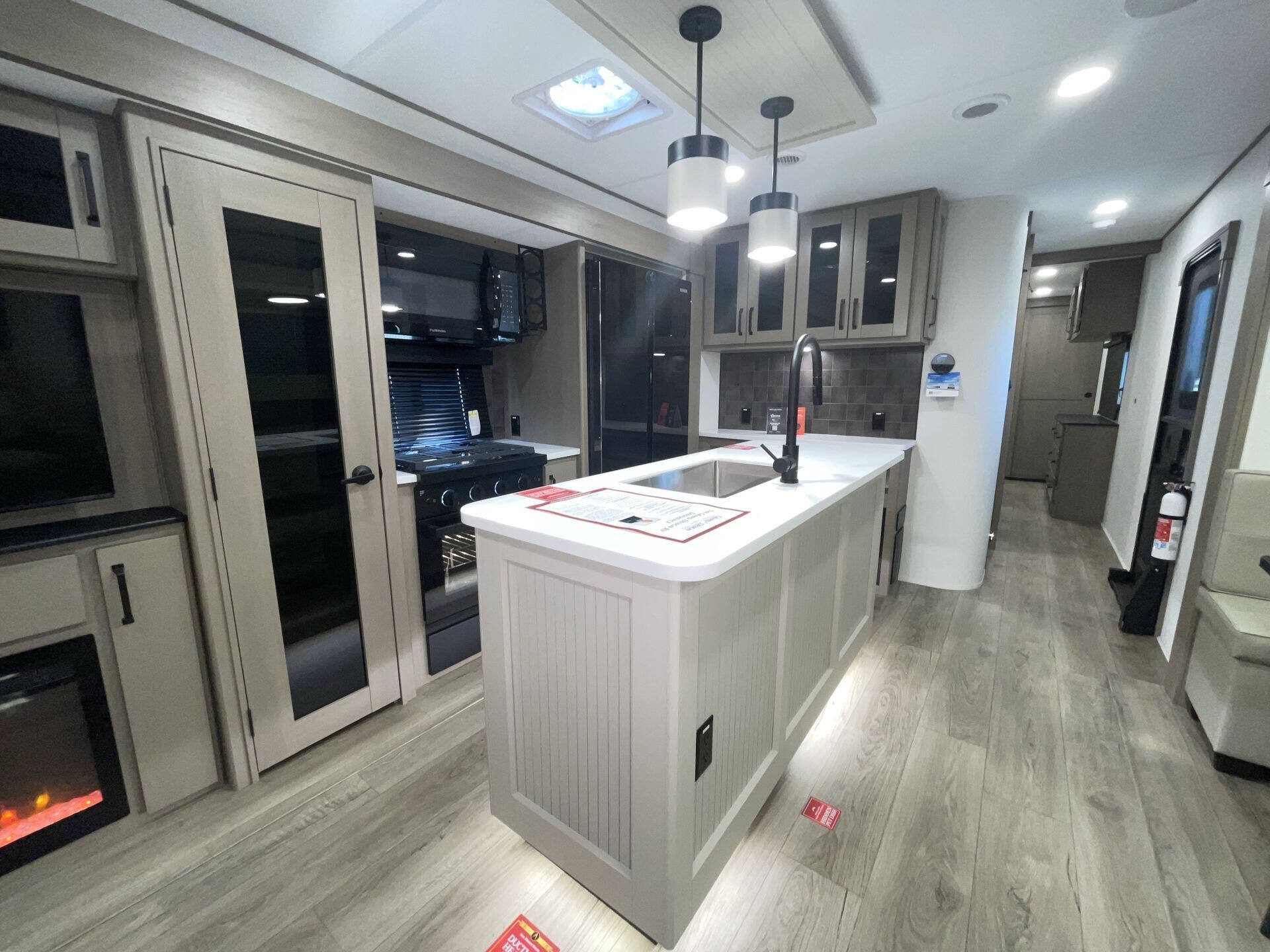 The Reflection 345RLTS centers around a thoughtful front bedroom, a modern mid-kitchen with an island, and a comfortable rear living area. Three slideouts create an expansive interior that’s easy to navigate, even with guests. Highlights include a free standing dinette with chairs, a dedicated island kitchen with a roomy pantry, and generous wardrobe storage. This layout delivers a home-like vibe, making it perfect for entertaining, movie nights, and relaxing downtime after a day on the road.