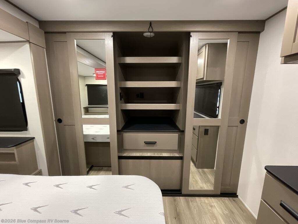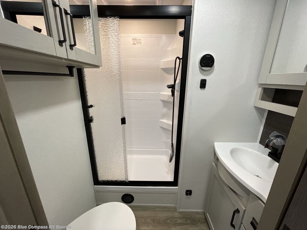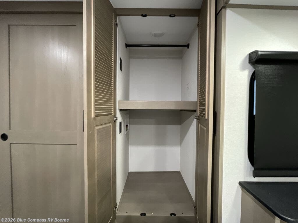 This rear living travel trailer will be perfect for extended stays at the campground or quick weekend trips to the lake! Once you've unloaded your gear from the pass-thru storage, head inside to relax on the rear tri-fold sofa with an adjustable headrest or on the theater seating across from the 40" TV and fireplace. There is also a booth dinette where you can dine together, or you can choose the optional swivel dinette. The spacious kitchen island will make mealtime easier than ever, plus there is a pantry and 16 cu. ft. 12V refrigerator for food storage. The full bath is right next to the front private bedroom for easy nighttime use, and speaking of nighttime, you're sure to sleep soundly on the queen bed slide. There is also a large front closet, TV prep, plus washer and dryer prep if you choose to add these appliances.