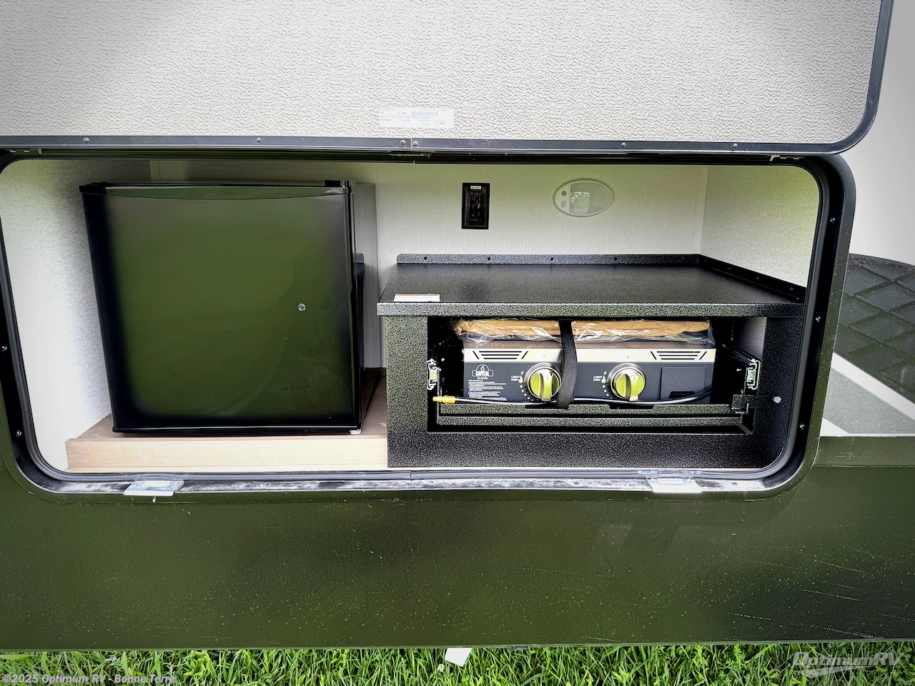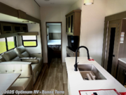 There is a whole lot to love about this fifth wheel! The front private bedroom has a queen bed to lay your head on at night, a slide with drawers and a linen closet, and even an entrance into the dual entry bathroom. The second private bedroom has a 54" x 74" top bed above a queen bed, a slide with a closet and drawers, and its very own half bathroom. The chef will have an easy time preparing delicious home cooked meals with the kitchen island, plus there is an outside kitchen complete with a 4.1 cu. ft. refrigerator to enjoy a cold beverage while you grill on the griddle. Enjoy a relaxing evening indoors either playing games at the booth dinette or on the theater seating across from the entertainment center with a fireplace and 40" TV. You could even switch out the seating for an optional tri-fold sofa or the dinette for an optional swivel dinette!