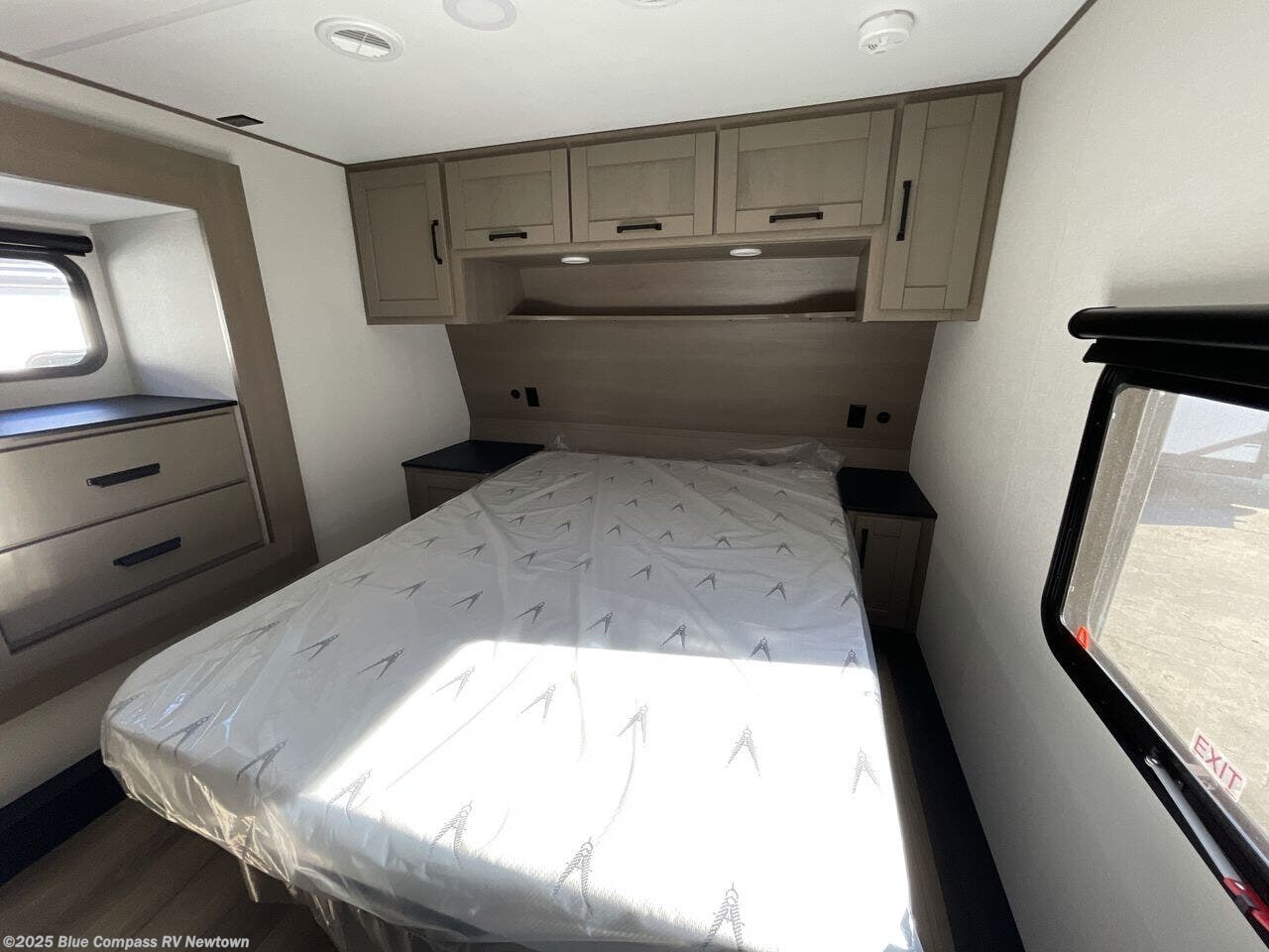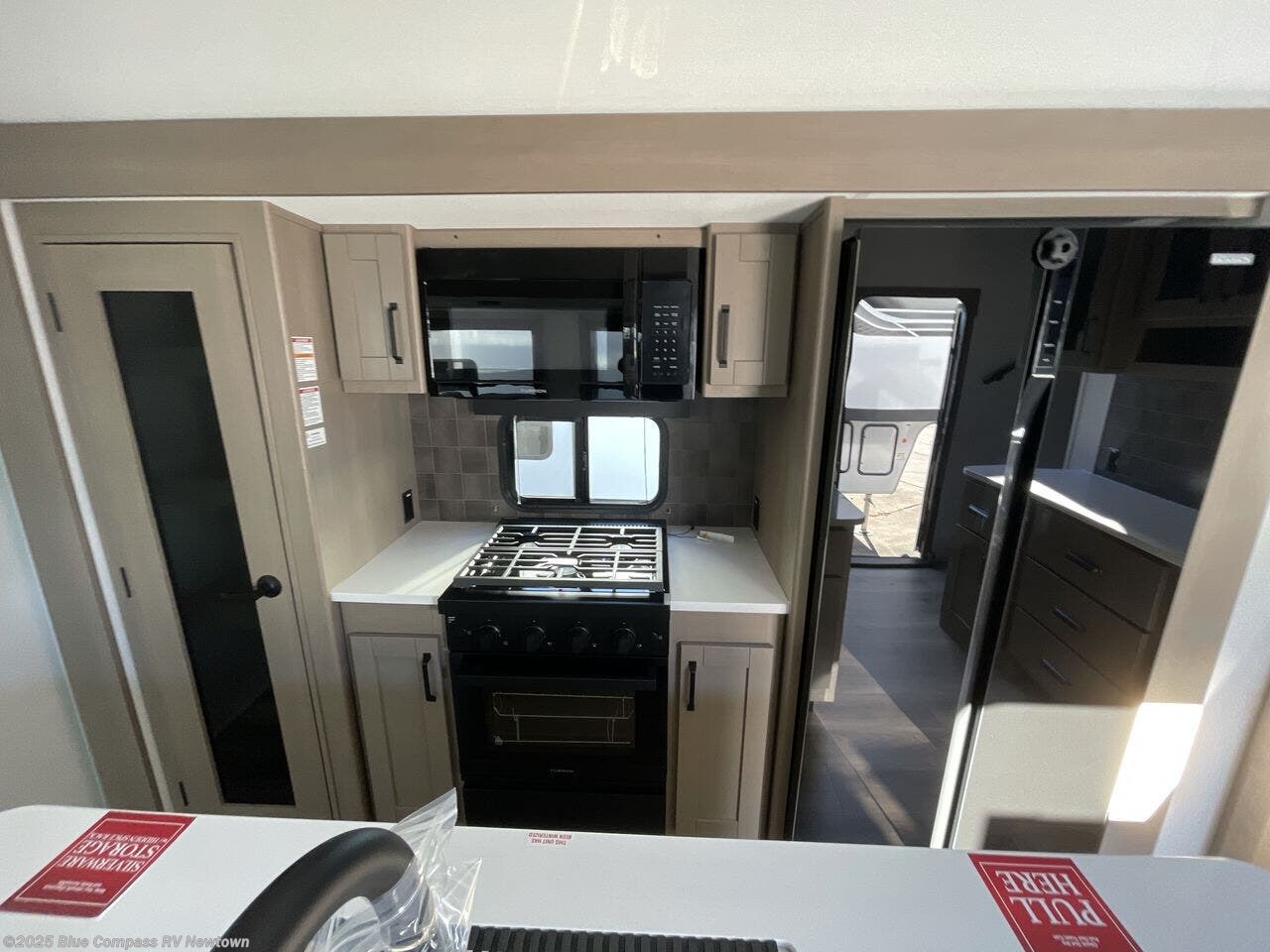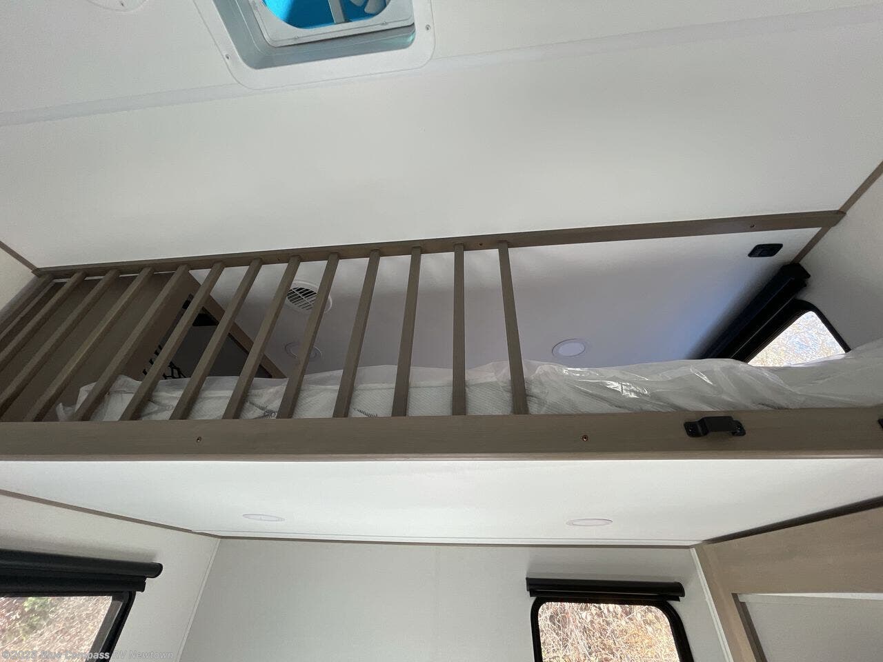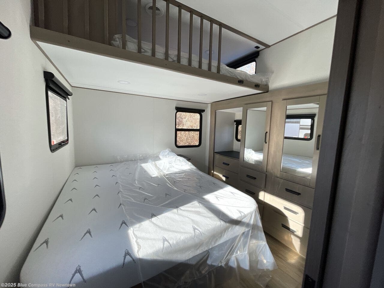 There is a whole lot to love about this fifth wheel! The front private bedroom has a queen bed to lay your head on at night, a slide with drawers and a linen closet, and even an entrance into the dual entry bathroom. The second private bedroom has a 54" x 74" top bed above a queen bed, a slide with a closet and drawers, and its very own half bathroom. The chef will have an easy time preparing delicious home cooked meals with the kitchen island, plus there is an outside kitchen complete with a 4.1 cu. ft. refrigerator to enjoy a cold beverage while you grill on the griddle. Enjoy a relaxing evening indoors either playing games at the booth dinette or on the theater seating across from the entertainment center with a fireplace and 40" TV. You could even switch out the seating for an optional tri-fold sofa or the dinette for an optional swivel dinette!
