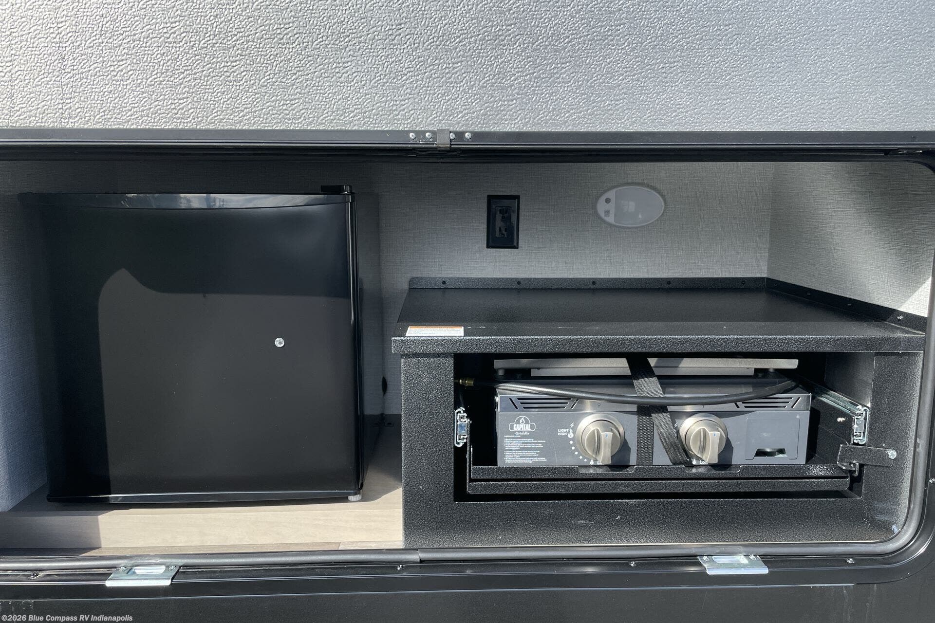 There is a whole lot to love about this fifth wheel! The front private bedroom has a queen bed to lay your head on at night, a slide with drawers and a linen closet, and even an entrance into the dual entry bathroom. The second private bedroom has a 54" x 74" top bed above a queen bed, a slide with a closet and drawers, and its very own half bathroom. The chef will have an easy time preparing delicious home cooked meals with the kitchen island, plus there is an outside kitchen complete with a 4.1 cu. ft. refrigerator to enjoy a cold beverage while you grill on the griddle. Enjoy a relaxing evening indoors either playing games at the booth dinette or on the theater seating across from the entertainment center with a fireplace and 40" TV. You could even switch out the seating for an optional tri-fold sofa or the dinette for an optional swivel dinette!