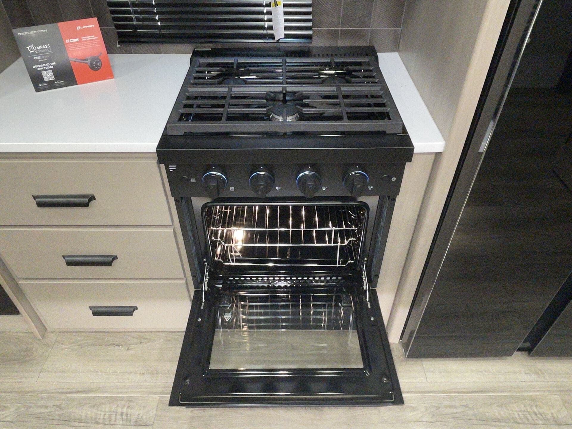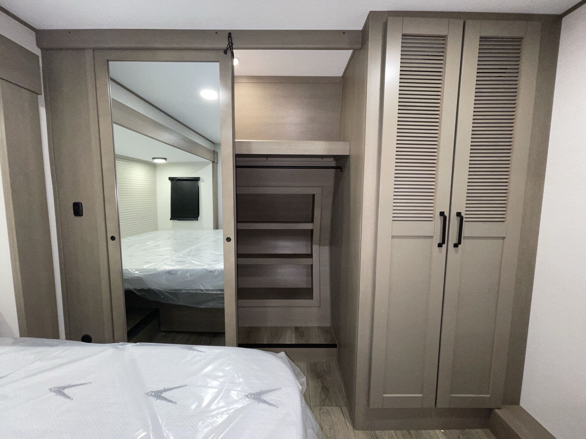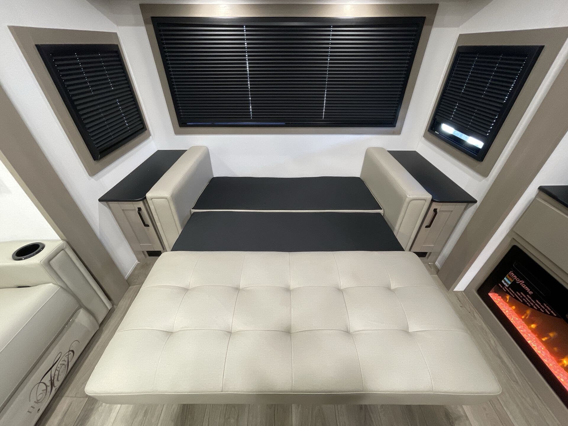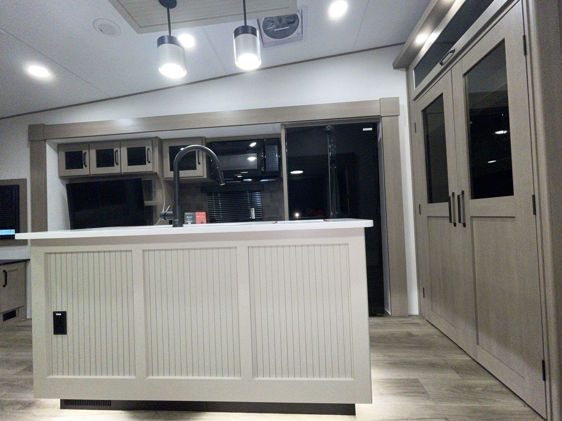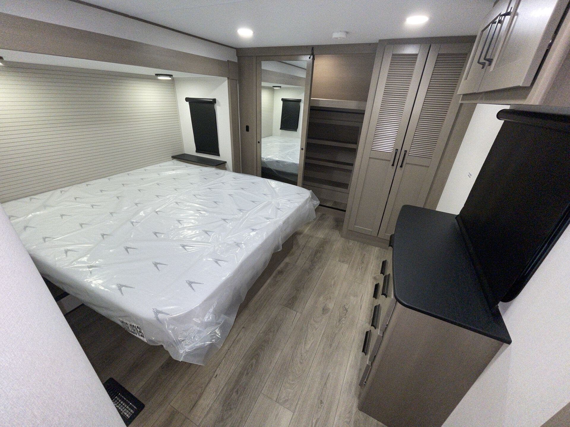 The fully equipped kitchen features solid-surface countertops, a three-burner cooktop, convection microwave, and a residential refrigerator, making meal prep effortless. The private master suite offers a king bed, wardrobe storage, and a private bath, while the bunkhouse provides additional sleeping space for family or guests. Two full bathrooms and abundant storage throughout enhance comfort and convenience.