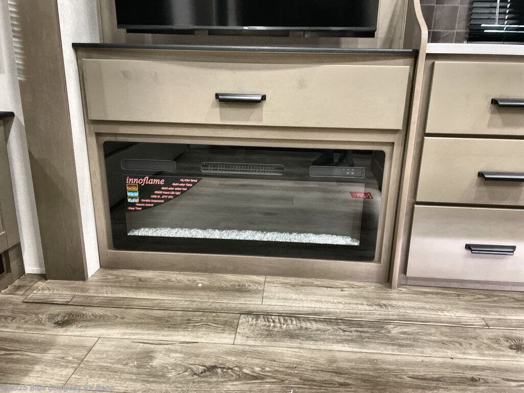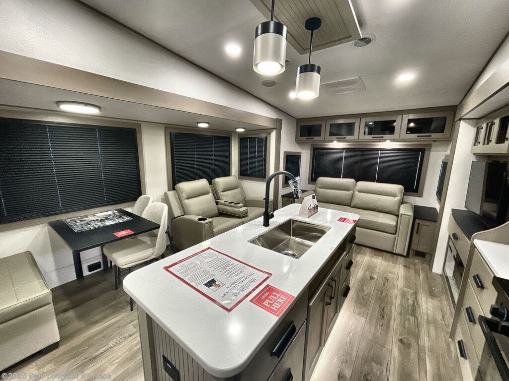Travel to see new state parks, RV resorts or your family in other states as you tow this fifth wheel to each destination! You will enjoy comfort and convenience, plus a place to work, and be able to offer extra sleeping space for friends and family when they visit. The middle extra room provides a tri-fold sofa slide, a desk, a wardrobe, plus a 64" x 88" upper bed loft area with access from the hallway. The full bathroom will keep everyone refreshed, and the front bedroom allows you to sleep on a queen bed slide or choose the king option. And you will love the front wardrobe, the dresser, and the option to add a washer/dryer. The main living and kitchen area provides plenty of seating from the rear tri-fold sofa, the booth dinette or swivel dinette option, and the theater seats with cupholders. And the kitchen island, appliances, and large pantry allow you to take everything you need with you.