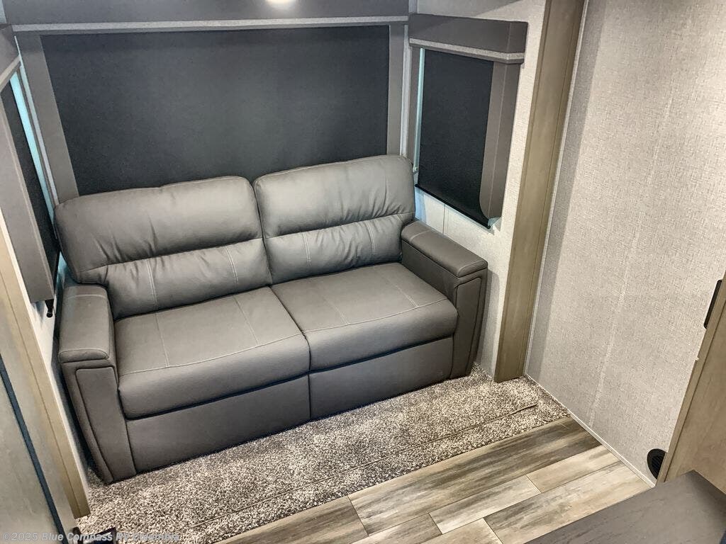 Travel to see new state parks, RV resorts or your family in other states as you tow this fifth wheel to each destination! You will enjoy comfort and convenience, plus a place to work, and be able to offer extra sleeping space for friends and family when they visit. The middle extra room provides a tri-fold sofa slide, a desk, a wardrobe, plus a 64" x 88" upper bed loft area with access from the hallway. The full bathroom will keep everyone refreshed, and the front bedroom allows you to sleep on a queen bed slide or choose the king option. And you will love the front wardrobe, the dresser, and the option to add a washer/dryer. The main living and kitchen area provides plenty of seating from the rear tri-fold sofa, the booth dinette or swivel dinette option, and the theater seats with cupholders. And the kitchen island, appliances, and large pantry allow you to take everything you need with you.