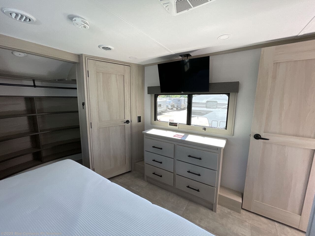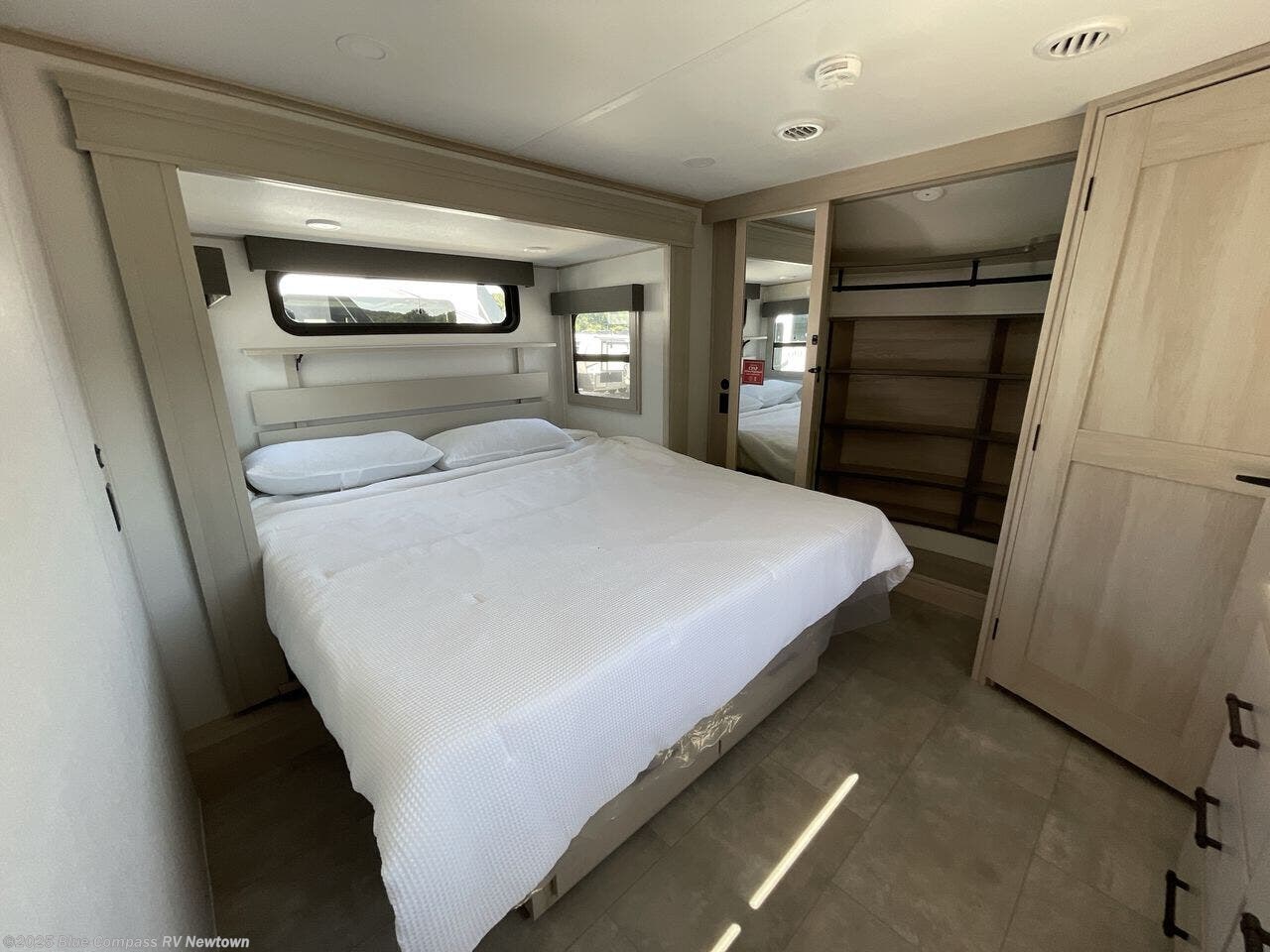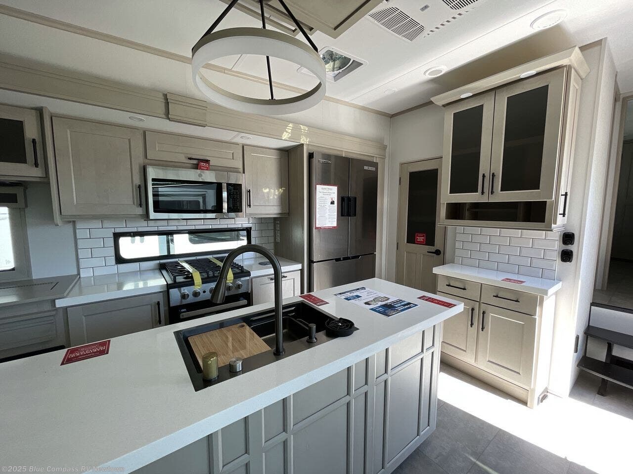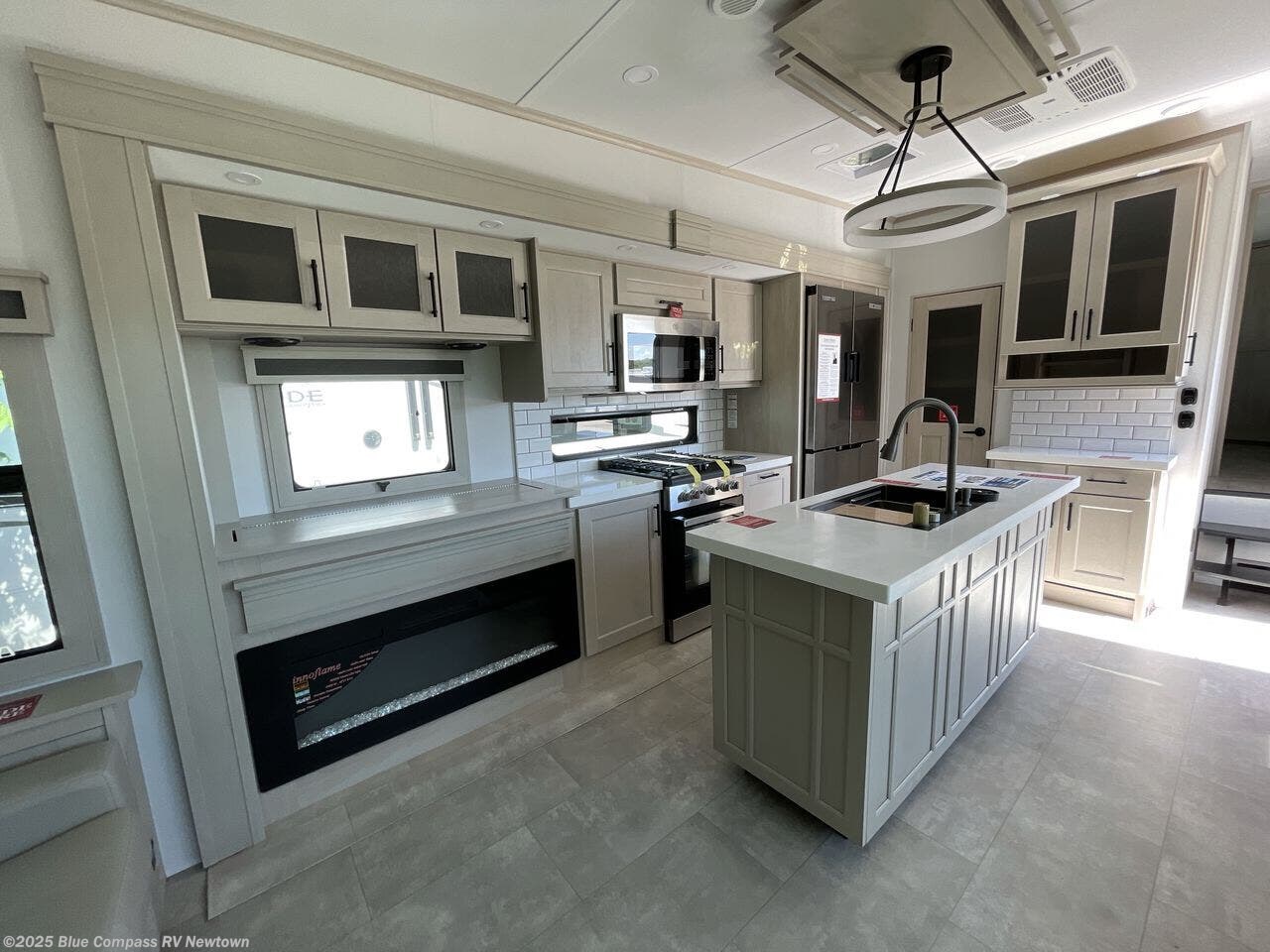 Traveling for long periods at a time is made easy with this gourmet kitchen that can feed your entire group a holiday meal! The professional-grade stainless steel cooktop with a built-in oven, microwave, 12V 20 cu. ft. refrigerator, and a kitchen island offers everything you will need to enjoy cooking for your family and guests. There is abundant storage throughout multiple overhead cabinets, a kitchen pantry and hutch, a bath linen cabinet for your towels, and in the front master bedroom which features a large closet. In the bedroom there is also a queen bed slide for added space to sleep comfortable at night, or you may choose an optional king bed if you enjoy more space. You will also find a closet with washer/dryer prep, large wardrobe, a clothes hamper plus a slide top dresser. Two nice awnings will provide outdoor living space keeping you protected from the sun and rain, and you can add an optional pull-out kitchen to enjoy convenient cooking outdoors as well.