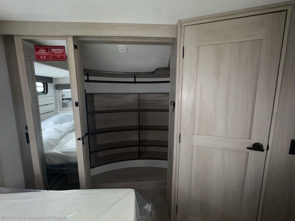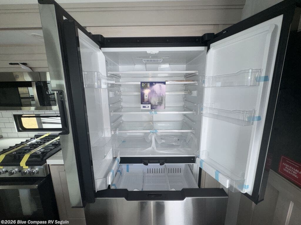 Traveling for long periods at a time is made easy with this gourmet kitchen that can feed your entire group a holiday meal! The professional-grade stainless steel cooktop with a built-in oven, microwave, 12V 20 cu. ft. refrigerator, and a kitchen island offers everything you will need to enjoy cooking for your family and guests. There is abundant storage throughout multiple overhead cabinets, a kitchen pantry and hutch, a bath linen cabinet for your towels, and in the front master bedroom which features a large closet. In the bedroom there is also a queen bed slide for added space to sleep comfortable at night, or you may choose an optional king bed if you enjoy more space. You will also find a closet with washer/dryer prep, large wardrobe, a clothes hamper plus a slide top dresser. Two nice awnings will provide outdoor living space keeping you protected from the sun and rain, and you can add an optional pull-out kitchen to enjoy convenient cooking outdoors as well.