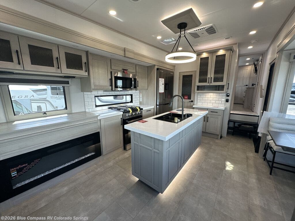Traveling for long periods at a time is made easy with this gourmet kitchen that can feed your entire group a holiday meal! The professional-grade stainless steel cooktop with a built-in oven, microwave, 12V 20 cu. ft. refrigerator, and a kitchen island offers everything you will need to enjoy cooking for your family and guests. There is abundant storage throughout multiple overhead cabinets, a kitchen pantry and hutch, a bath linen cabinet for your towels, and in the front master bedroom which features a large closet. In the bedroom there is also a queen bed slide for added space to sleep comfortable at night, or you may choose an optional king bed if you enjoy more space. You will also find a closet with washer/dryer prep, large wardrobe, a clothes hamper plus a slide top dresser. Two nice awnings will provide outdoor living space keeping you protected from the sun and rain, and you can add an optional pull-out kitchen to enjoy convenient cooking outdoors as well.