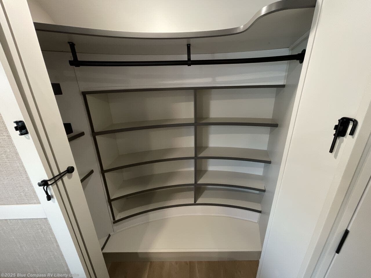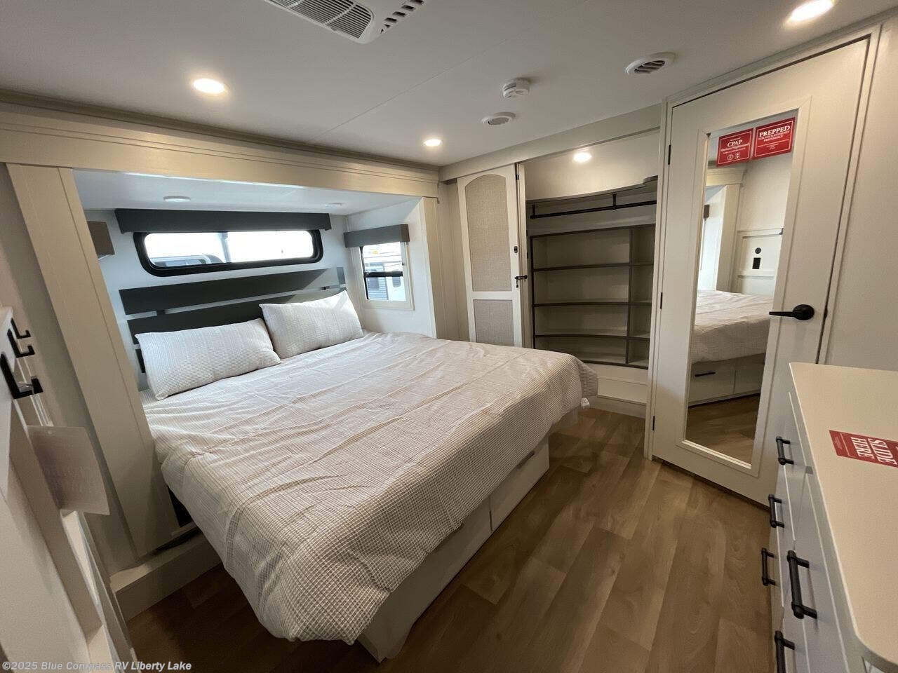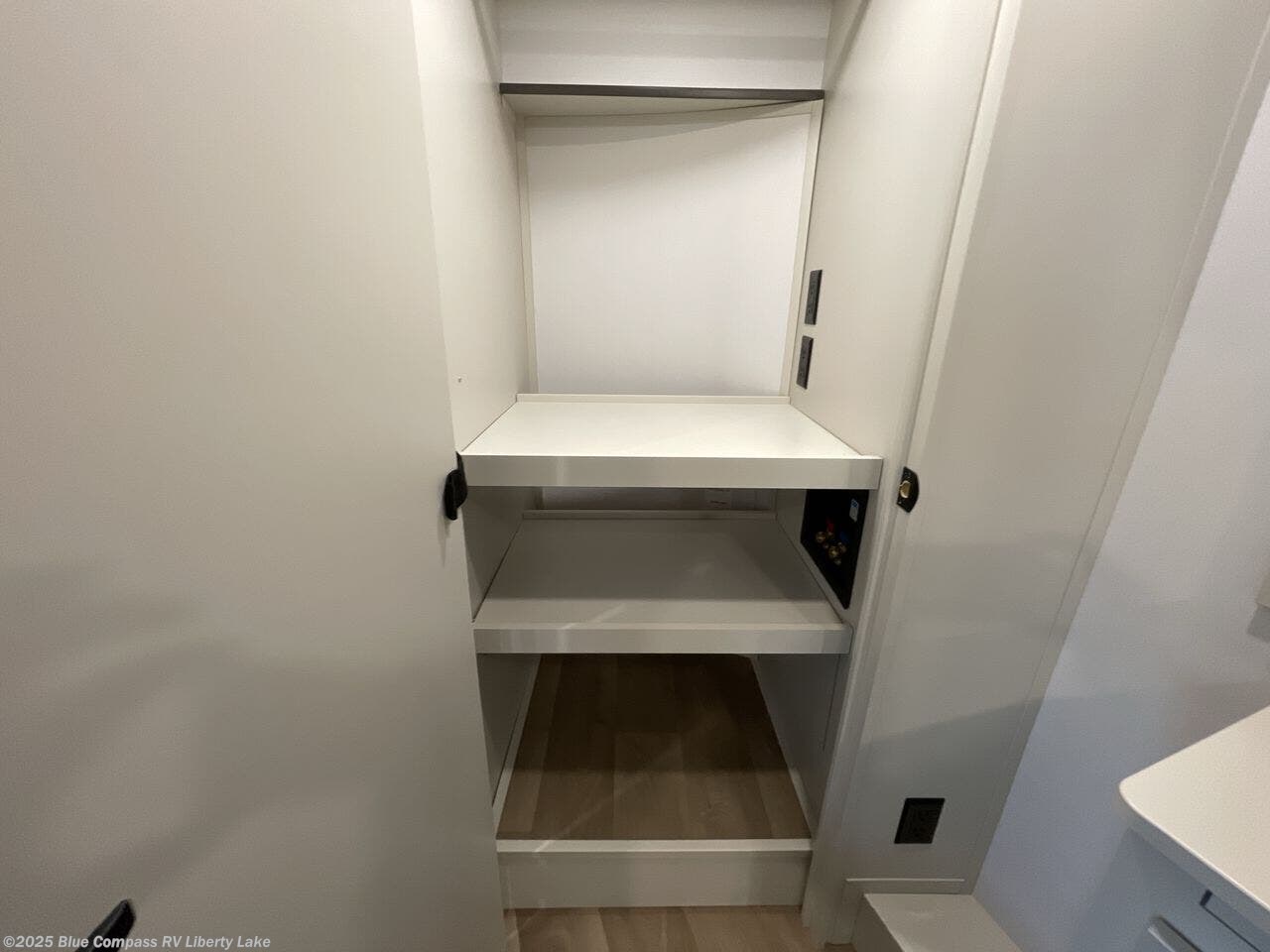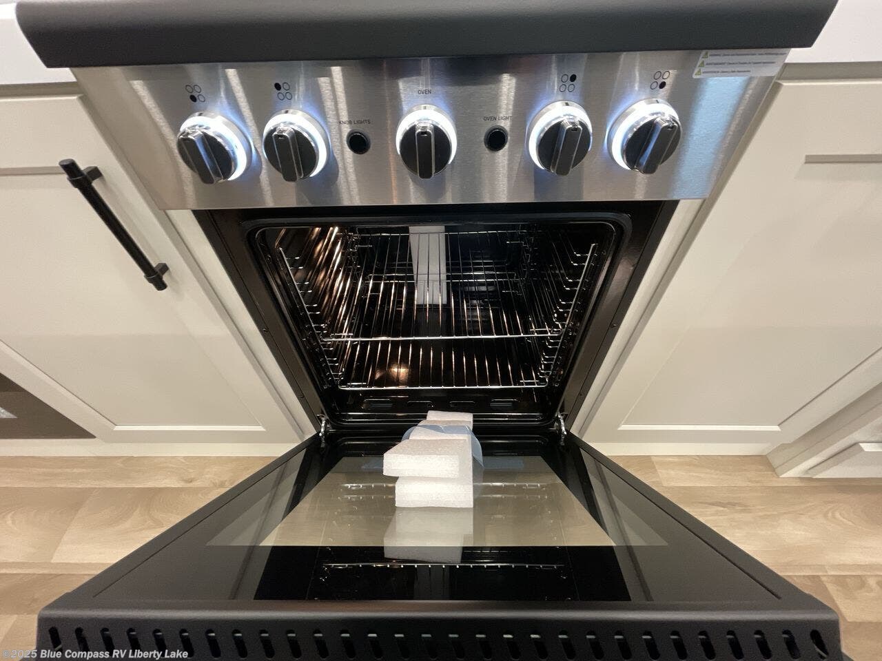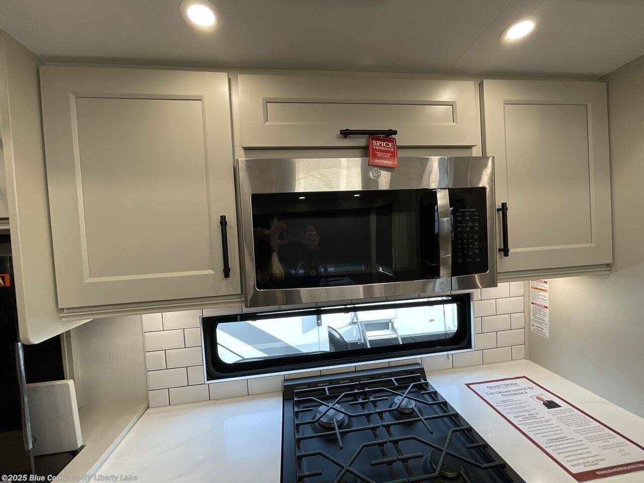 Traveling for long periods at a time is made easy with this gourmet kitchen that can feed your entire group a holiday meal! The professional-grade stainless steel cooktop with a built-in oven, microwave, 12V 20 cu. ft. refrigerator, and a kitchen island offers everything you will need to enjoy cooking for your family and guests. There is abundant storage throughout multiple overhead cabinets, a kitchen pantry and hutch, a bath linen cabinet for your towels, and in the front master bedroom which features a large closet. In the bedroom there is also a queen bed slide for added space to sleep comfortable at night, or you may choose an optional king bed if you enjoy more space. You will also find a closet with washer/dryer prep, large wardrobe, a clothes hamper plus a slide top dresser. Two nice awnings will provide outdoor living space keeping you protected from the sun and rain, and you can add an optional pull-out kitchen to enjoy convenient cooking outdoors as well.