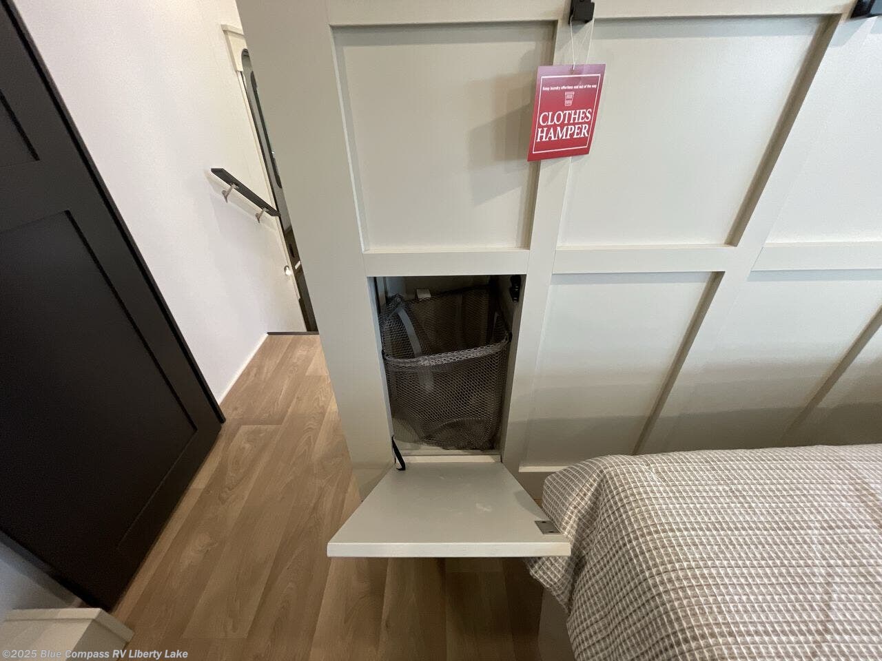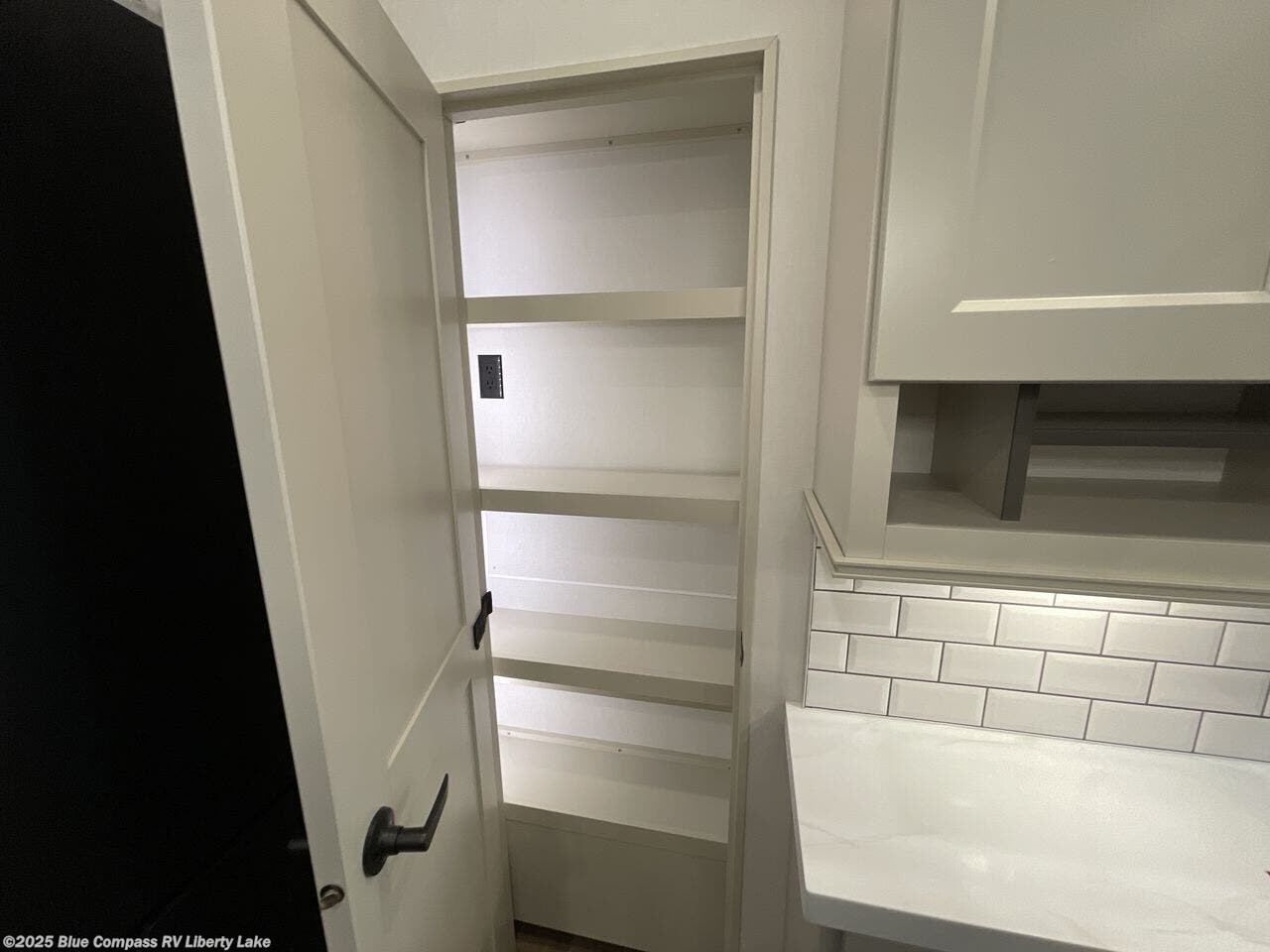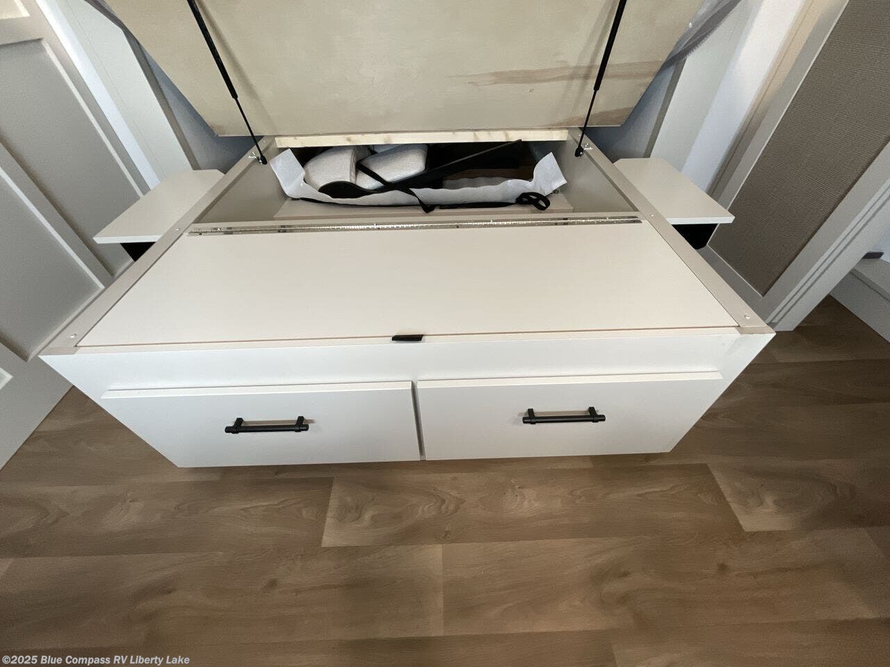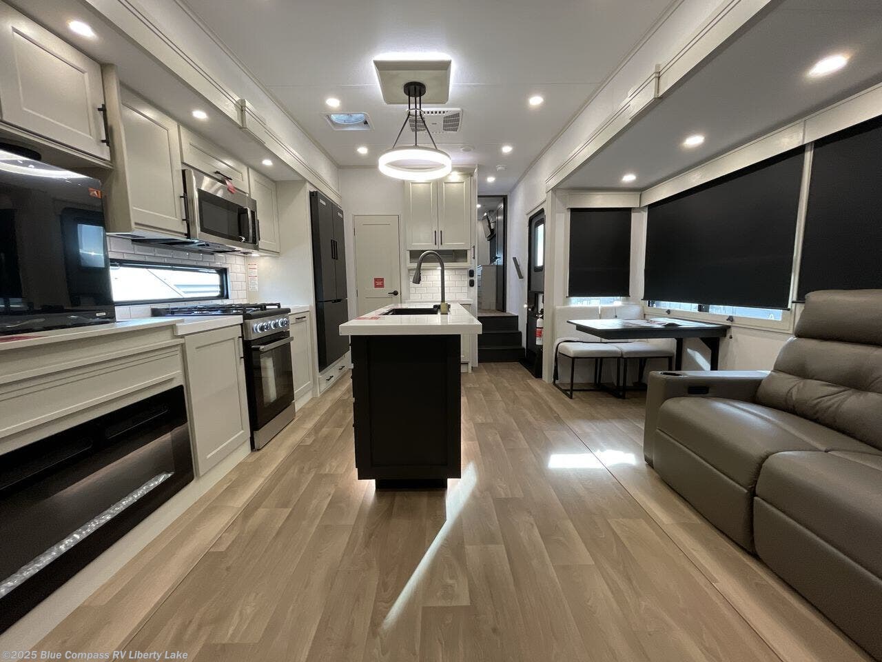 Traveling for long periods at a time is made easy with this gourmet kitchen that can feed your entire group a holiday meal! The professional-grade stainless steel cooktop with a built-in oven, microwave, 12V 20 cu. ft. refrigerator, and a kitchen island offers everything you will need to enjoy cooking for your family and guests. There is abundant storage throughout multiple overhead cabinets, a kitchen pantry and hutch, a bath linen cabinet for your towels, and in the front master bedroom which features a large closet. In the bedroom there is also a queen bed slide for added space to sleep comfortable at night, or you may choose an optional king bed if you enjoy more space. You will also find a closet with washer/dryer prep, large wardrobe, a clothes hamper plus a slide top dresser. Two nice awnings will provide outdoor living space keeping you protected from the sun and rain, and you can add an optional pull-out kitchen to enjoy convenient cooking outdoors as well.