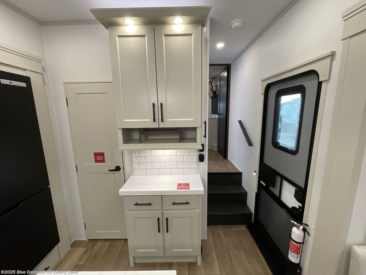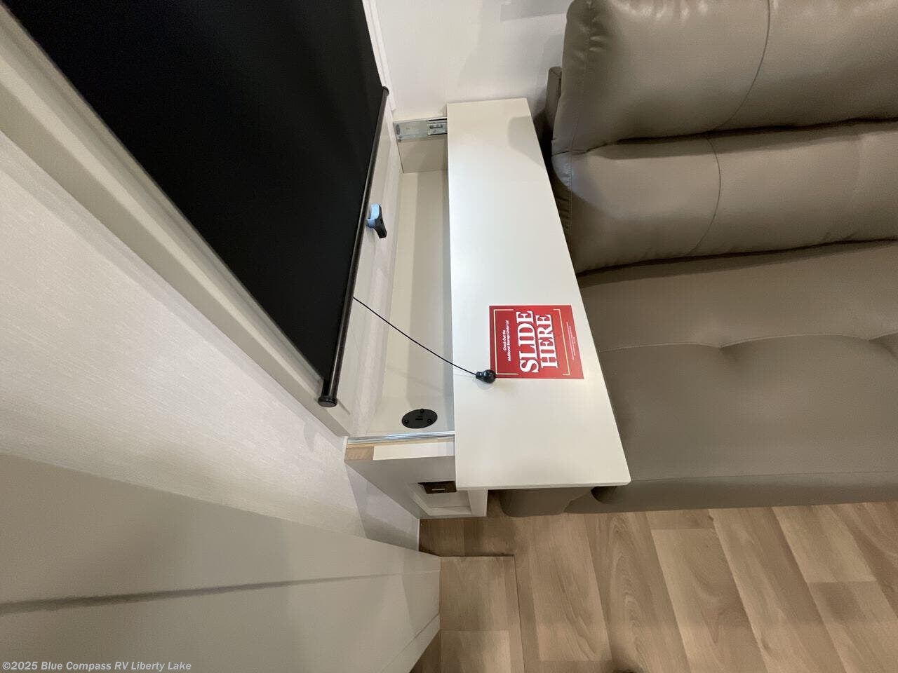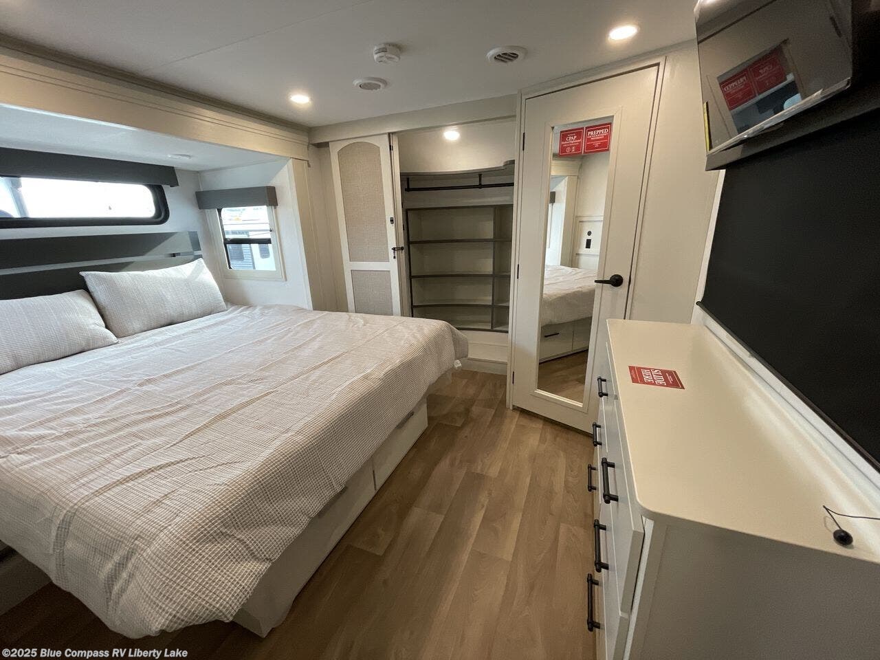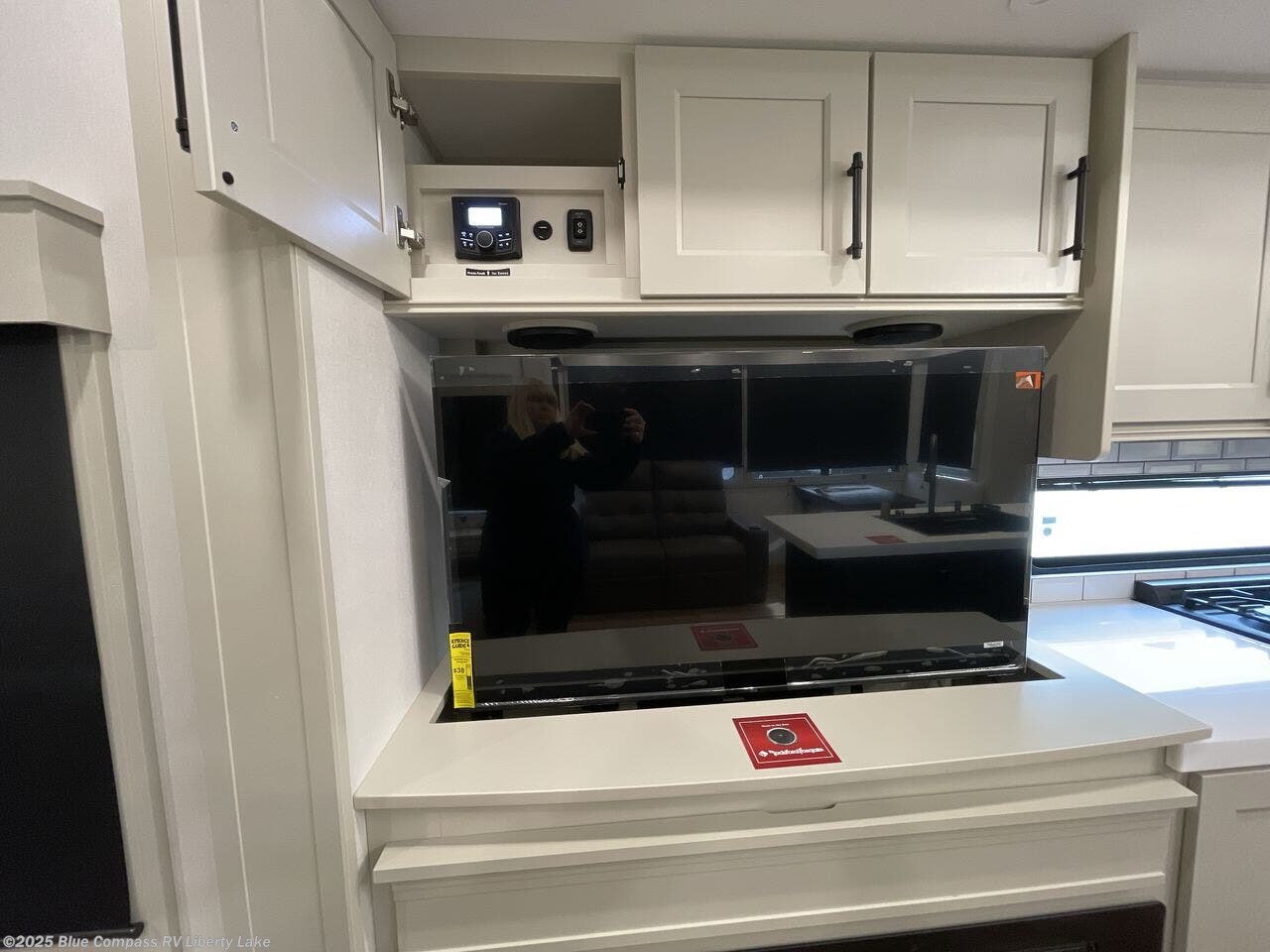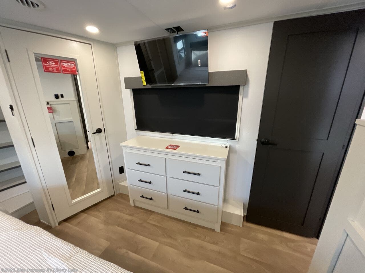 Traveling for long periods at a time is made easy with this gourmet kitchen that can feed your entire group a holiday meal! The professional-grade stainless steel cooktop with a built-in oven, microwave, 12V 20 cu. ft. refrigerator, and a kitchen island offers everything you will need to enjoy cooking for your family and guests. There is abundant storage throughout multiple overhead cabinets, a kitchen pantry and hutch, a bath linen cabinet for your towels, and in the front master bedroom which features a large closet. In the bedroom there is also a queen bed slide for added space to sleep comfortable at night, or you may choose an optional king bed if you enjoy more space. You will also find a closet with washer/dryer prep, large wardrobe, a clothes hamper plus a slide top dresser. Two nice awnings will provide outdoor living space keeping you protected from the sun and rain, and you can add an optional pull-out kitchen to enjoy convenient cooking outdoors as well.