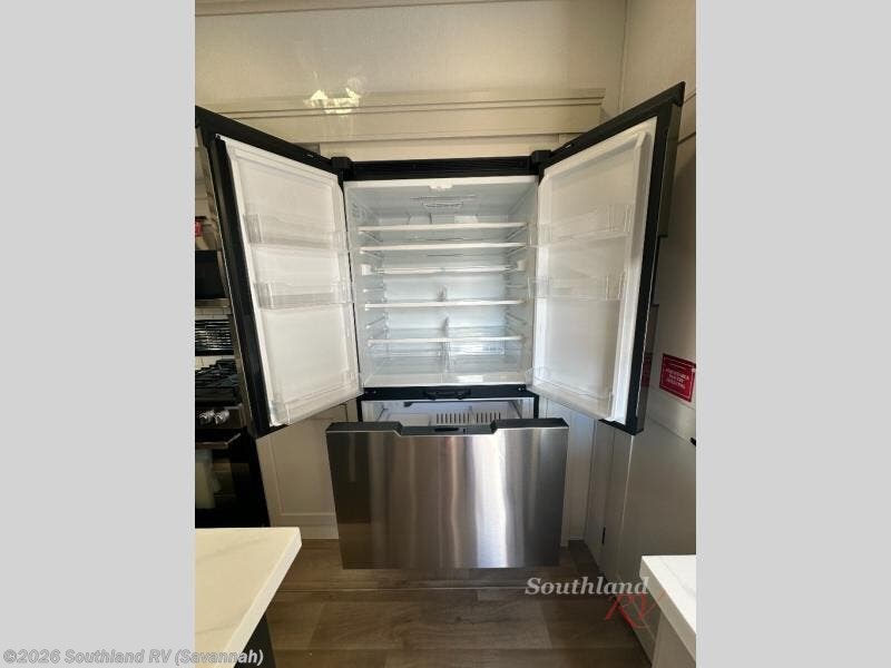 Traveling for long periods at a time is made easy with this gourmet kitchen that can feed your entire group a holiday meal! The professional-grade stainless steel cooktop with a built-in oven, microwave, 12V 20 cu. ft. refrigerator, and a kitchen island offers everything you will need to enjoy cooking for your family and guests. There is abundant storage throughout multiple overhead cabinets, a kitchen pantry and hutch, a bath linen cabinet for your towels, and in the front master bedroom which features a large closet. In the bedroom there is also a queen bed slide for added space to sleep comfortable at night, or you may choose an optional king bed if you enjoy more space. You will also find a closet with washer/dryer prep, large wardrobe, a clothes hamper plus a slide top dresser. Two nice awnings will provide outdoor living space keeping you protected from the sun and rain, and you can add an optional pull-out kitchen to enjoy convenient cooking outdoors as well.