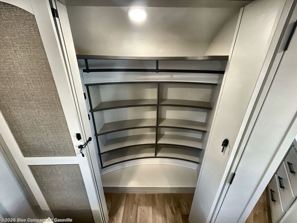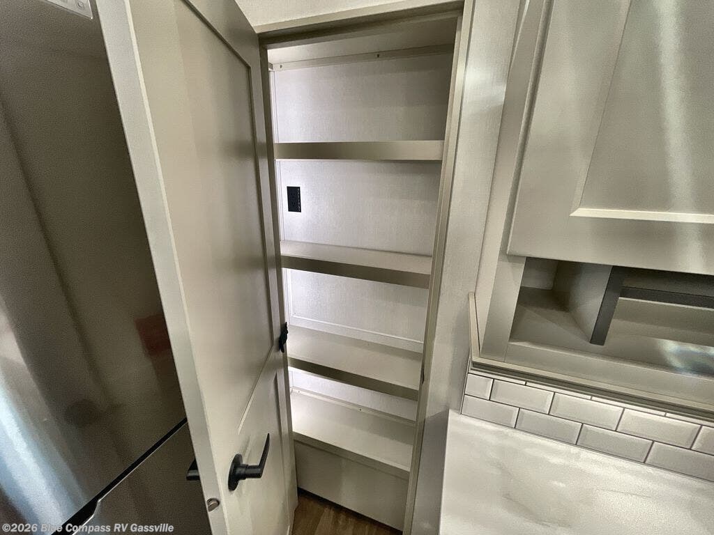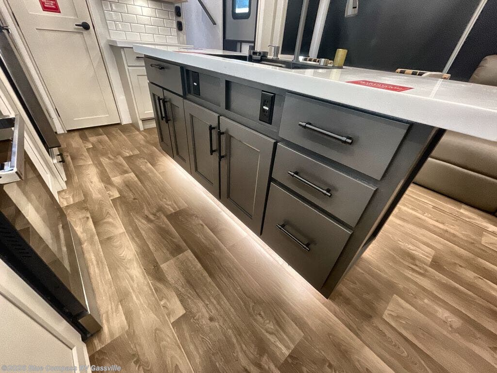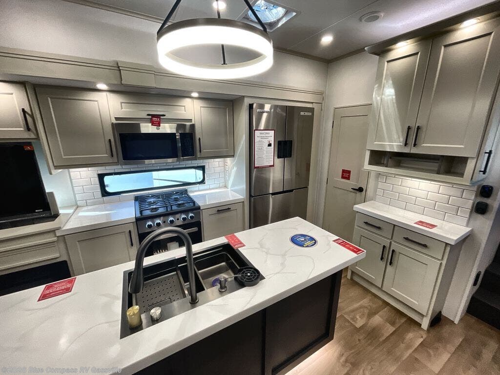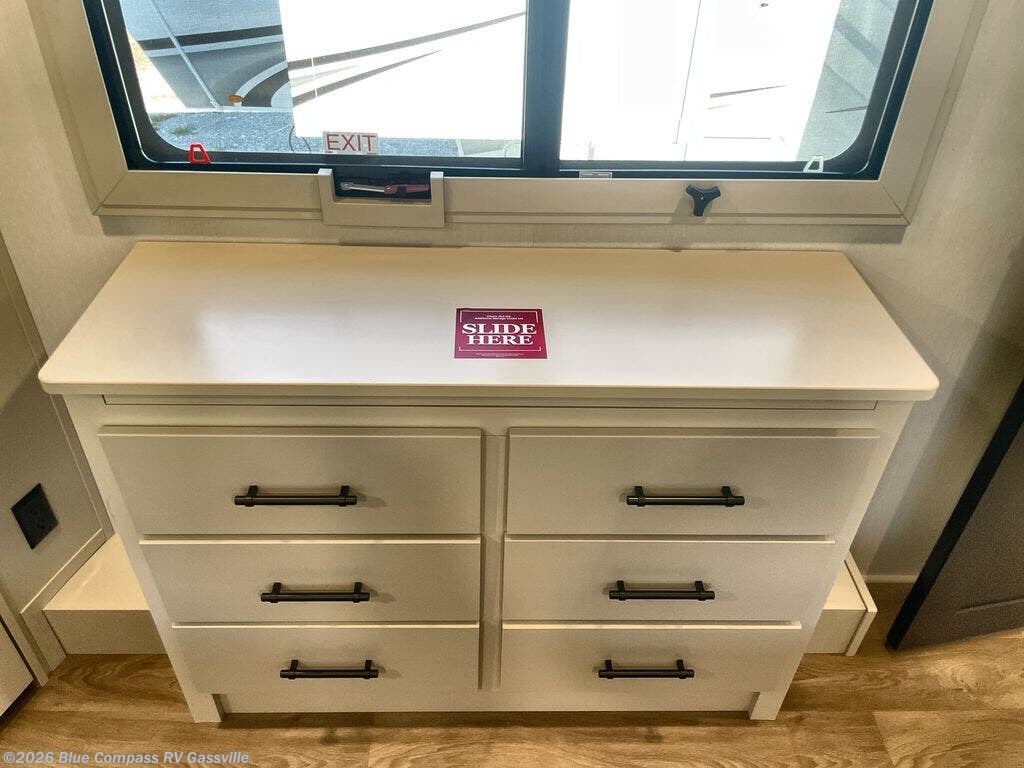 Traveling for long periods at a time is made easy with this gourmet kitchen that can feed your entire group a holiday meal! The professional-grade stainless steel cooktop with a built-in oven, microwave, 12V 20 cu. ft. refrigerator, and a kitchen island offers everything you will need to enjoy cooking for your family and guests. There is abundant storage throughout multiple overhead cabinets, a kitchen pantry and hutch, a bath linen cabinet for your towels, and in the front master bedroom which features a large closet. In the bedroom there is also a queen bed slide for added space to sleep comfortable at night, or you may choose an optional king bed if you enjoy more space. You will also find a closet with washer/dryer prep, large wardrobe, a clothes hamper plus a slide top dresser. Two nice awnings will provide outdoor living space keeping you protected from the sun and rain, and you can add an optional pull-out kitchen to enjoy convenient cooking outdoors as well.