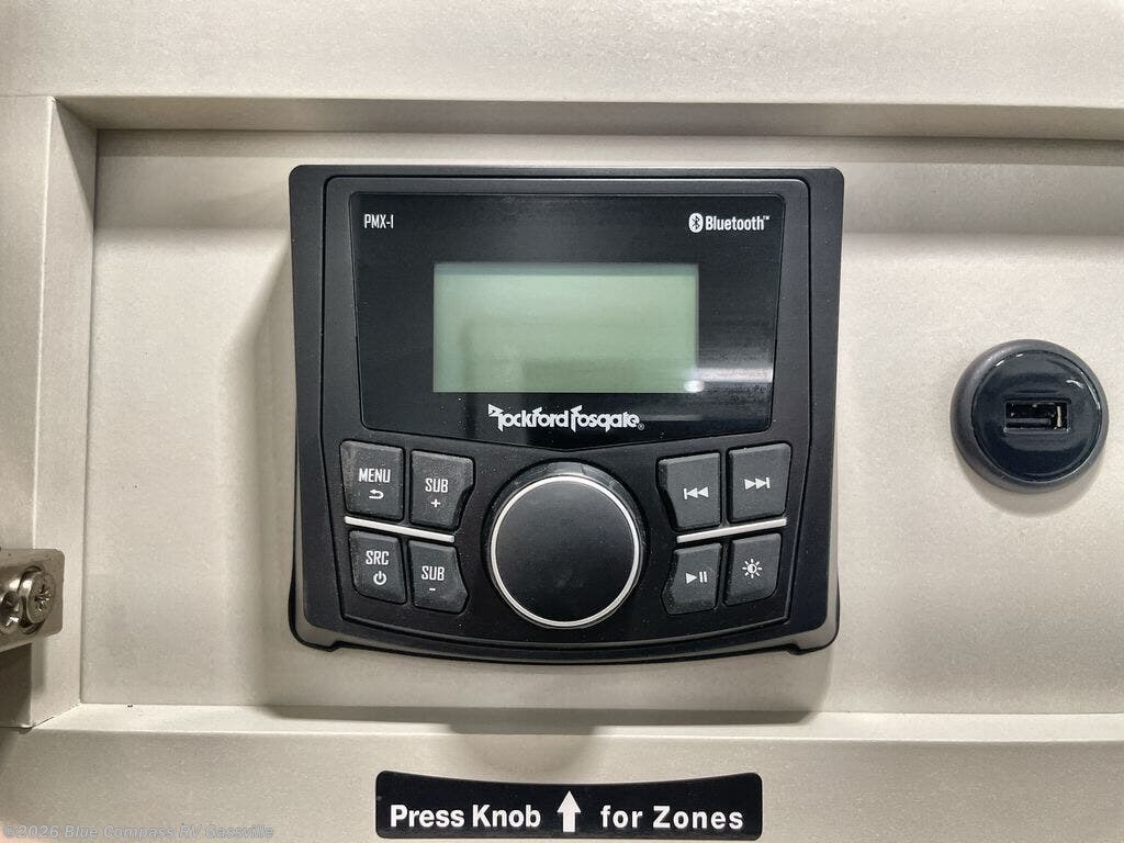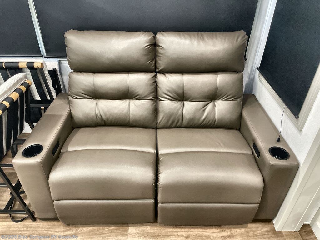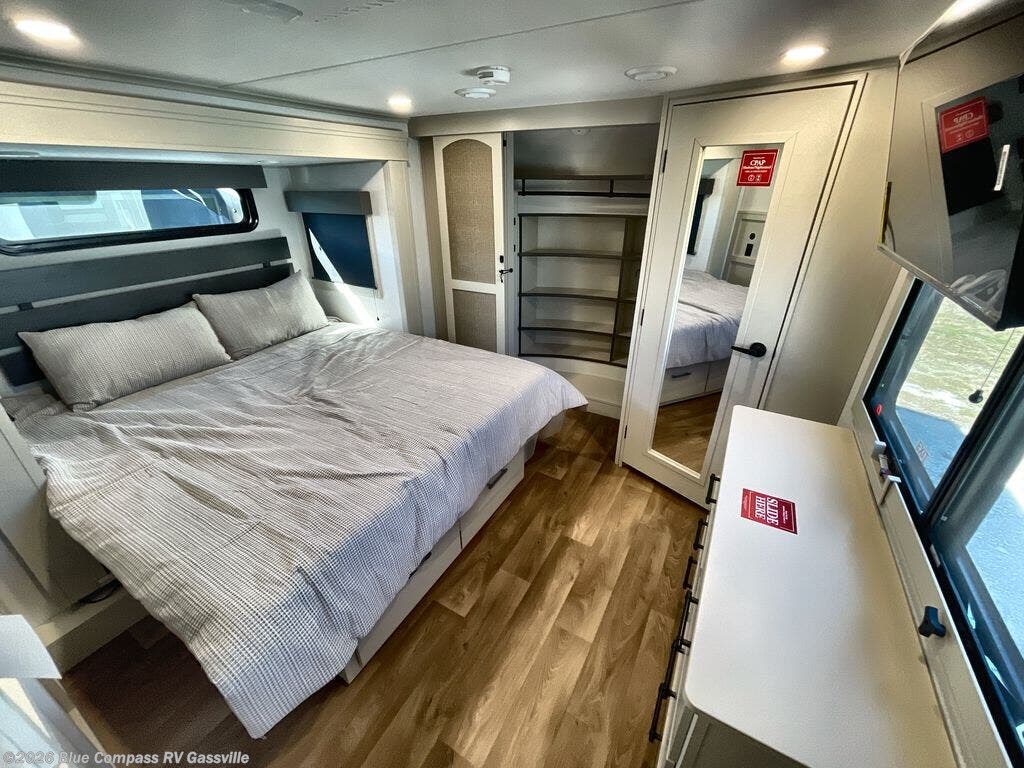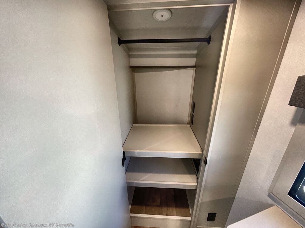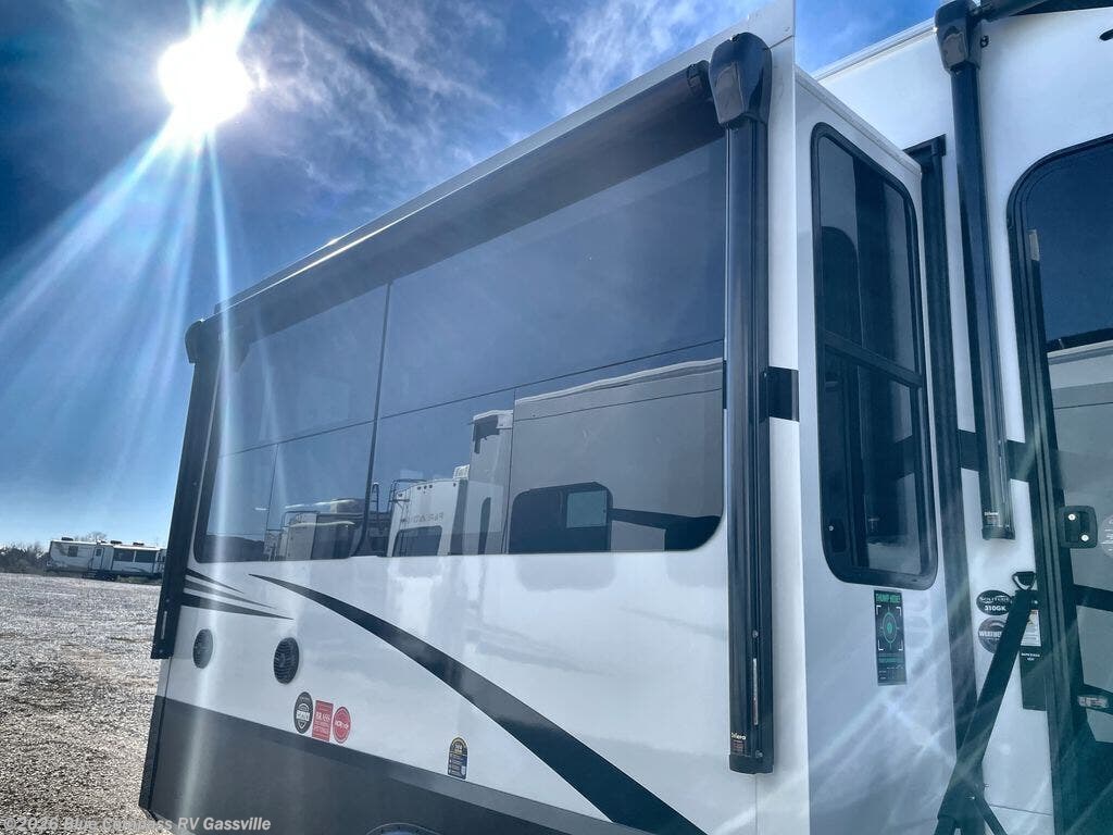 Traveling for long periods at a time is made easy with this gourmet kitchen that can feed your entire group a holiday meal! The professional-grade stainless steel cooktop with a built-in oven, microwave, 12V 20 cu. ft. refrigerator, and a kitchen island offers everything you will need to enjoy cooking for your family and guests. There is abundant storage throughout multiple overhead cabinets, a kitchen pantry and hutch, a bath linen cabinet for your towels, and in the front master bedroom which features a large closet. In the bedroom there is also a queen bed slide for added space to sleep comfortable at night, or you may choose an optional king bed if you enjoy more space. You will also find a closet with washer/dryer prep, large wardrobe, a clothes hamper plus a slide top dresser. Two nice awnings will provide outdoor living space keeping you protected from the sun and rain, and you can add an optional pull-out kitchen to enjoy convenient cooking outdoors as well.