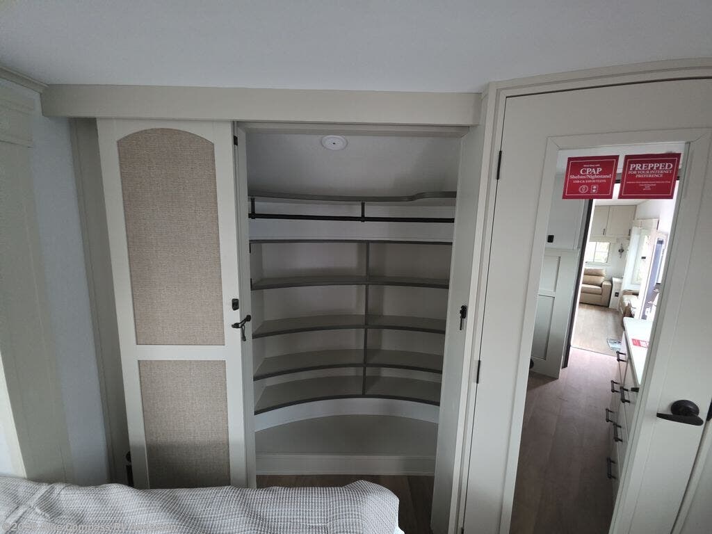 Traveling for long periods at a time is made easy with this gourmet kitchen that can feed your entire group a holiday meal! The professional-grade stainless steel cooktop with a built-in oven, microwave, 12V 20 cu. ft. refrigerator, and a kitchen island offers everything you will need to enjoy cooking for your family and guests. There is abundant storage throughout multiple overhead cabinets, a kitchen pantry and hutch, a bath linen cabinet for your towels, and in the front master bedroom which features a large closet. In the bedroom there is also a queen bed slide for added space to sleep comfortable at night, or you may choose an optional king bed if you enjoy more space. You will also find a closet with washer/dryer prep, large wardrobe, a clothes hamper plus a slide top dresser. Two nice awnings will provide outdoor living space keeping you protected from the sun and rain, and you can add an optional pull-out kitchen to enjoy convenient cooking outdoors as well.