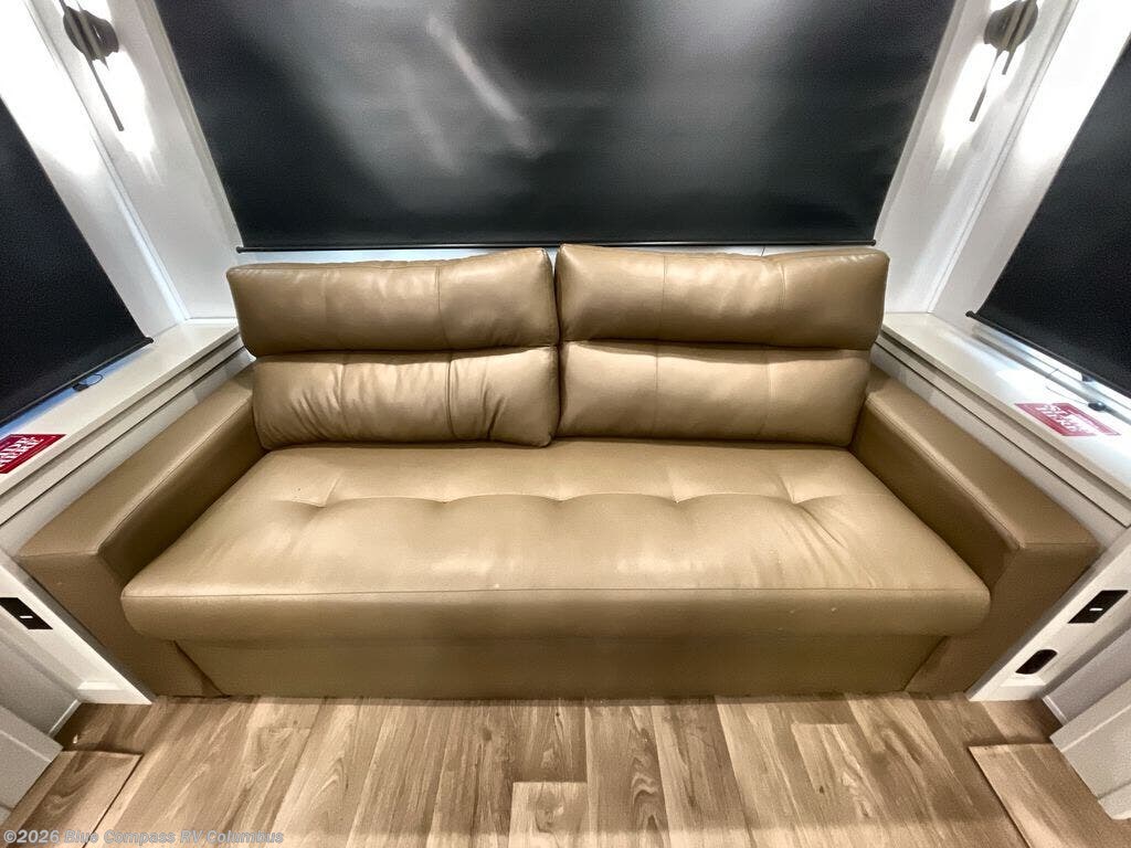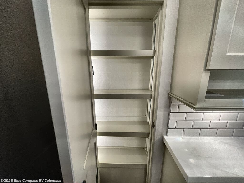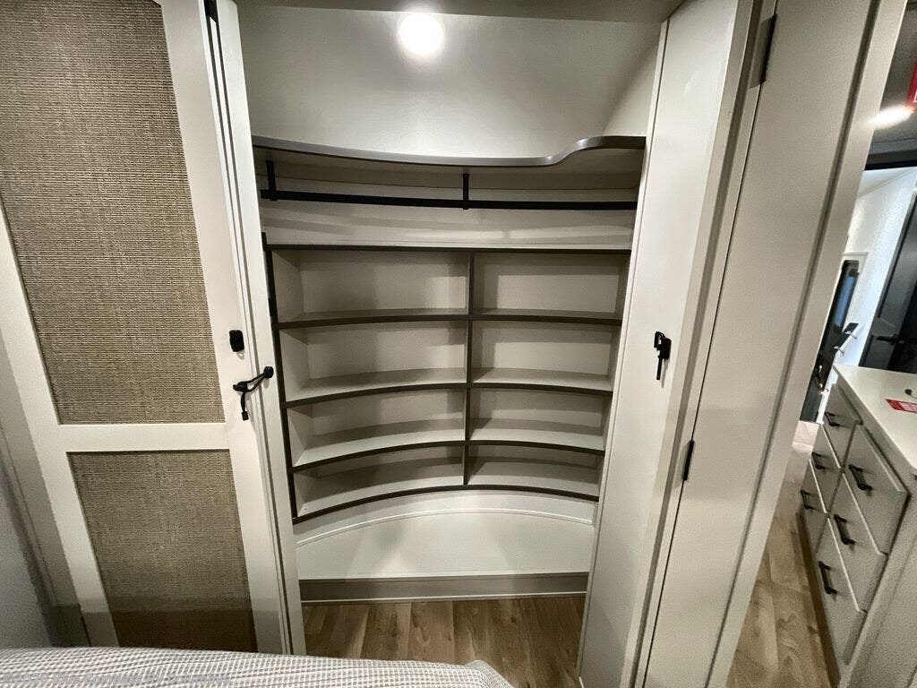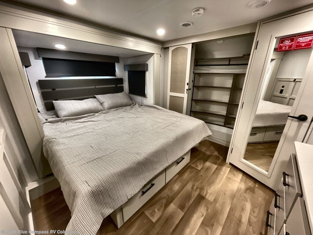 Traveling for long periods at a time is made easy with this gourmet kitchen that can feed your entire group a holiday meal! The professional-grade stainless steel cooktop with a built-in oven, microwave, 20 cu. ft. refrigerator, and a kitchen island offers everything you will need to enjoy cooking for your family and guests. There is abundant storage throughout multiple overhead cabinets, a kitchen pantry and a bath linen cabinet for your towels, and in the front master bedroom which features a large closet. In the bedroom there is also a queen bed slide for added space to sleep comfortable at night, or you may choose an optional king bed if you enjoy more space. You will also find a closet with washer/dryer prep, large wardrobe, clothes hamper plus a slide top dresser. Two nice awnings will provide outdoor living space keeping you protected from the sun and rain, and you can add an optional pull-out kitchen to enjoy convenient cooking outdoors as well.