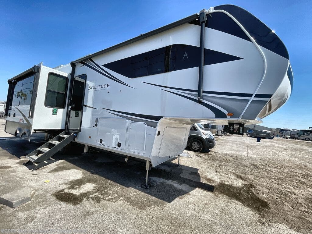 Each Solitude fifth wheel by Grand Design features a 101" wide-body construction, heavy duty 8,000 lb. axles, frameless tinted windows, and high-gloss gel coat sidewalls. You can camp during harsh weather thanks to the Weather-Tek Package that includes a 35K BTU high-capacity furnace, an all-in-one enclosed and heated utility center, and a fully enclosed underbelly with heated tanks and storage. Inside, you'll love the premium roller shades, hardwood cabinet doors, solid surface countertops, plus residential finishes throughout to make you truly feel at home. Each model also includes a MORryde CRE3000 suspension system, and a MORryde pin box that will provide smooth towing from home to campground. Affordable luxury is possible with the Solitude fifth wheels; choose yours today!