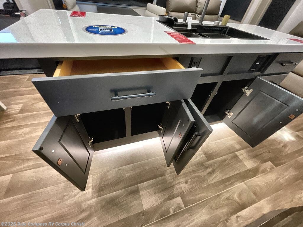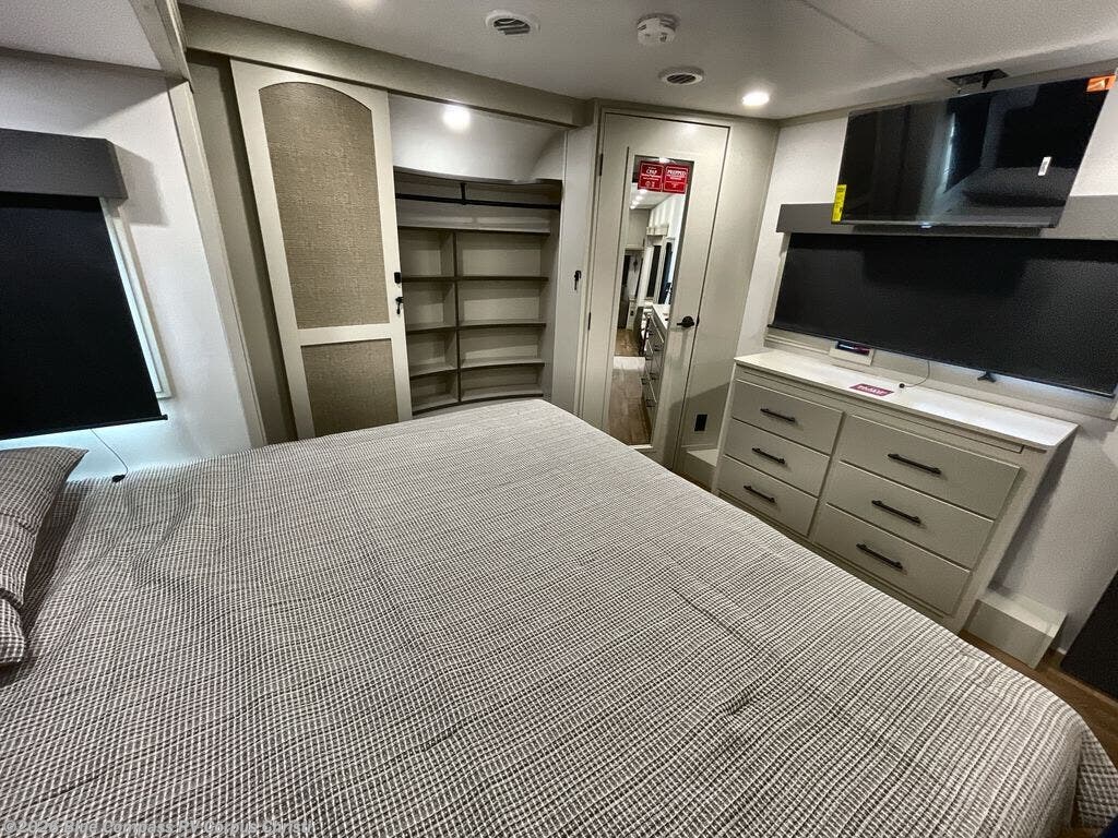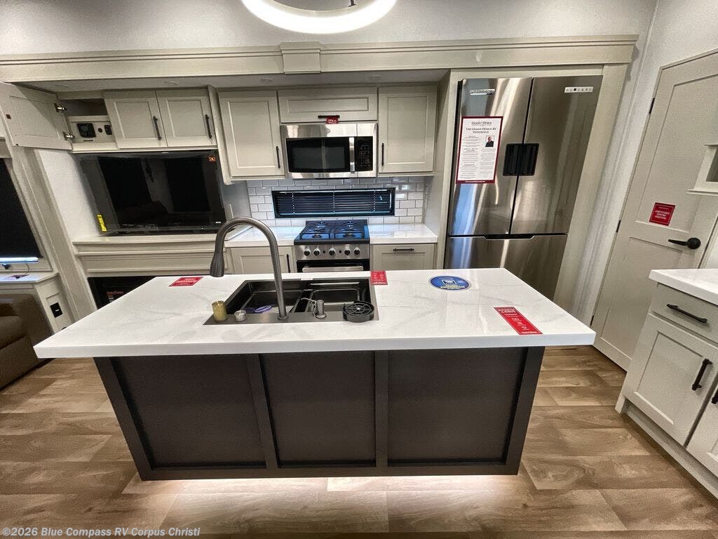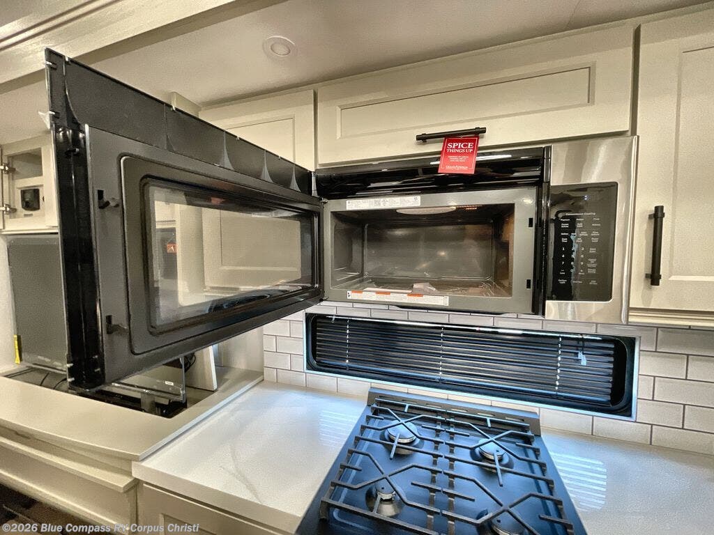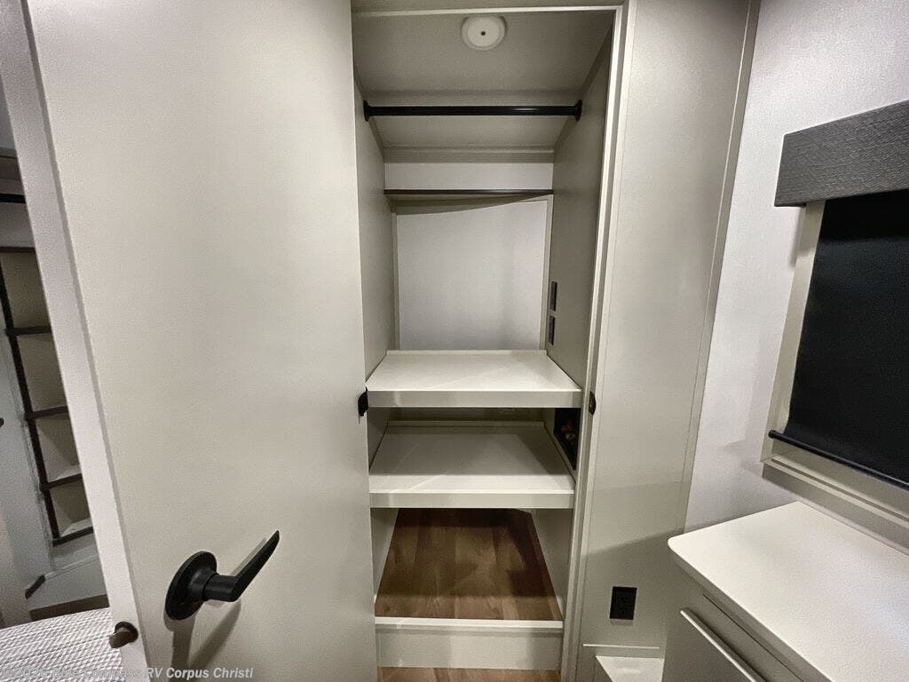 Traveling for long periods at a time is made easy with this gourmet kitchen that can feed your entire group a holiday meal! The professional-grade stainless steel cooktop with a built-in oven, microwave, 20 cu. ft. refrigerator, and a kitchen island offers everything you will need to enjoy cooking for your family and guests. There is abundant storage throughout multiple overhead cabinets, a kitchen pantry and a bath linen cabinet for your towels, and in the front master bedroom which features a large closet. In the bedroom there is also a queen bed slide for added space to sleep comfortable at night, or you may choose an optional king bed if you enjoy more space. You will also find a closet with washer/dryer prep, large wardrobe, clothes hamper plus a slide top dresser. Two nice awnings will provide outdoor living space keeping you protected from the sun and rain, and you can add an optional pull-out kitchen to enjoy convenient cooking outdoors as well.