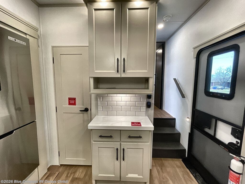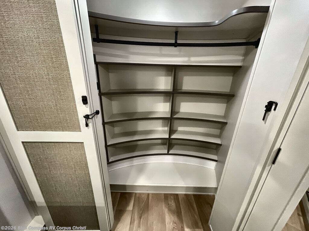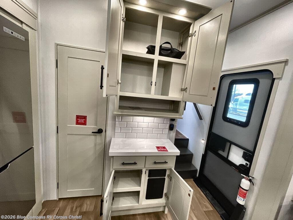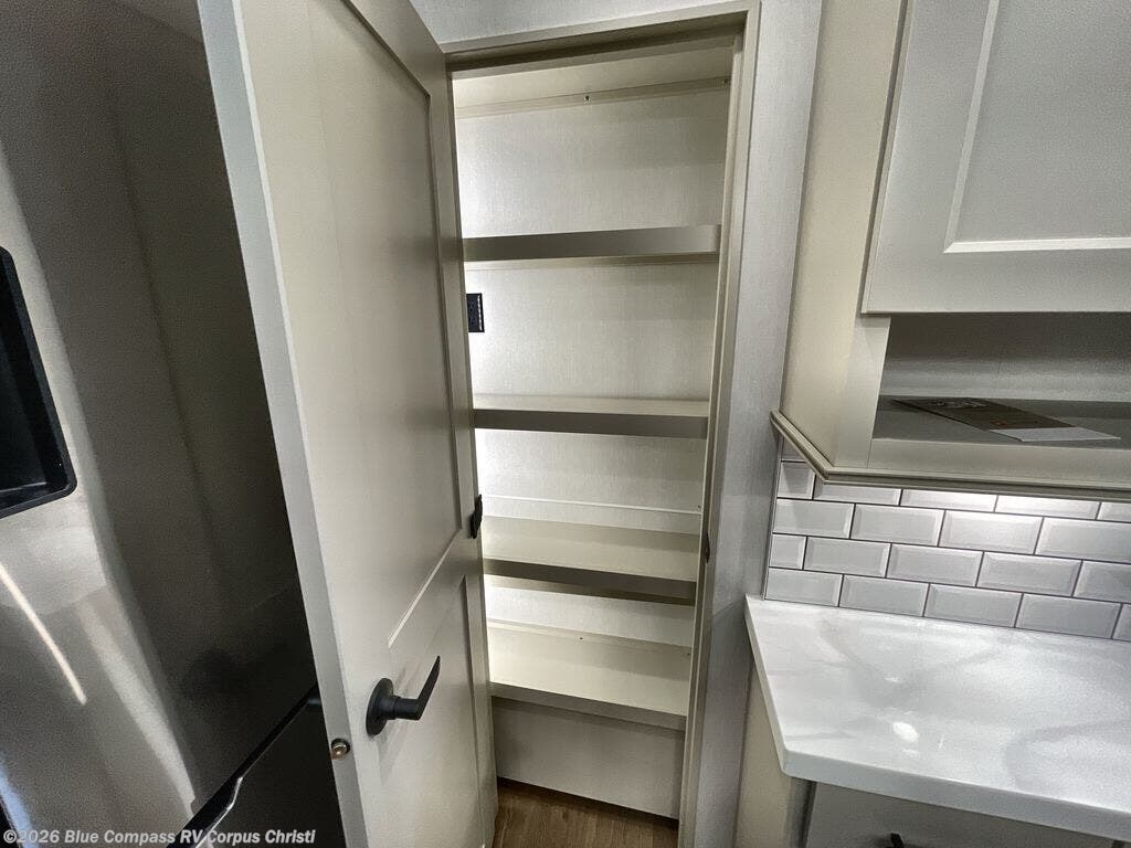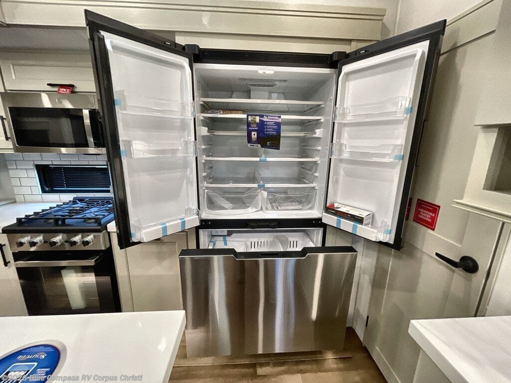 Traveling for long periods at a time is made easy with this gourmet kitchen that can feed your entire group a holiday meal! The professional-grade stainless steel cooktop with a built-in oven, microwave, 20 cu. ft. refrigerator, and a kitchen island offers everything you will need to enjoy cooking for your family and guests. There is abundant storage throughout multiple overhead cabinets, a kitchen pantry and a bath linen cabinet for your towels, and in the front master bedroom which features a large closet. In the bedroom there is also a queen bed slide for added space to sleep comfortable at night, or you may choose an optional king bed if you enjoy more space. You will also find a closet with washer/dryer prep, large wardrobe, clothes hamper plus a slide top dresser. Two nice awnings will provide outdoor living space keeping you protected from the sun and rain, and you can add an optional pull-out kitchen to enjoy convenient cooking outdoors as well.