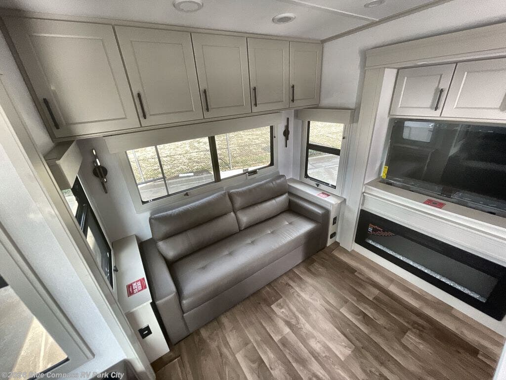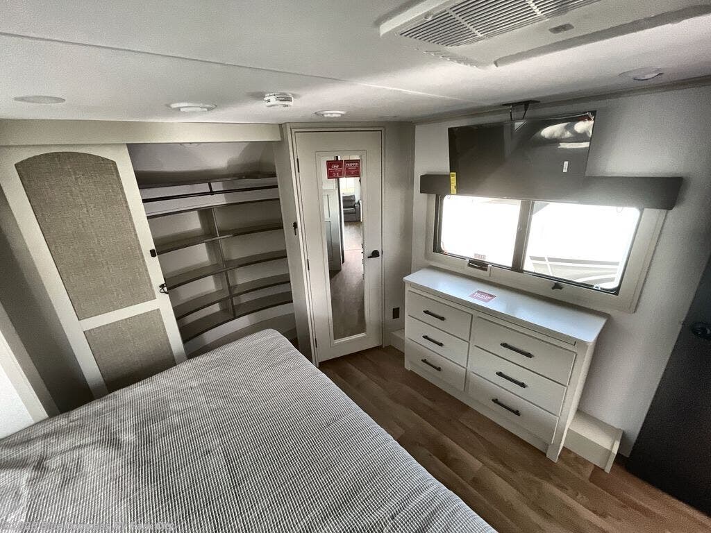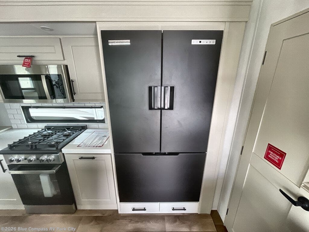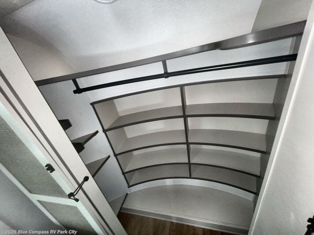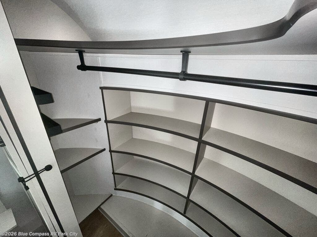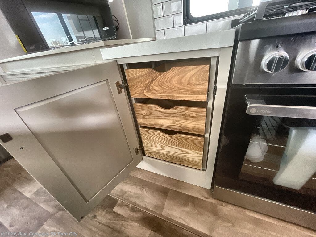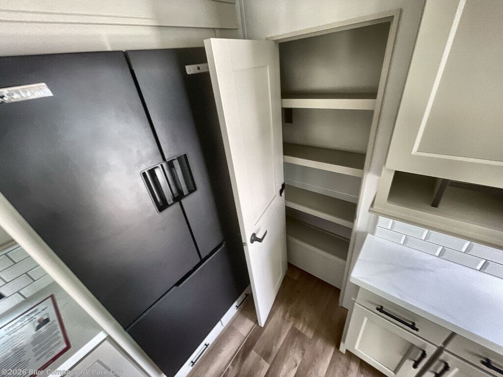 Traveling for long periods at a time is made easy with this gourmet kitchen that can feed your entire group a holiday meal! The professional-grade stainless steel cooktop with a built-in oven, microwave, 12V 20 cu. ft. refrigerator, and a kitchen island offers everything you will need to enjoy cooking for your family and guests. There is abundant storage throughout multiple overhead cabinets, a kitchen pantry and hutch, a bath linen cabinet for your towels, and in the front master bedroom which features a large closet. In the bedroom there is also a queen bed slide for added space to sleep comfortable at night, or you may choose an optional king bed if you enjoy more space. You will also find a closet with washer/dryer prep, large wardrobe, a clothes hamper plus a slide top dresser. Two nice awnings will provide outdoor living space keeping you protected from the sun and rain, and you can add an optional pull-out kitchen to enjoy convenient cooking outdoors as well.