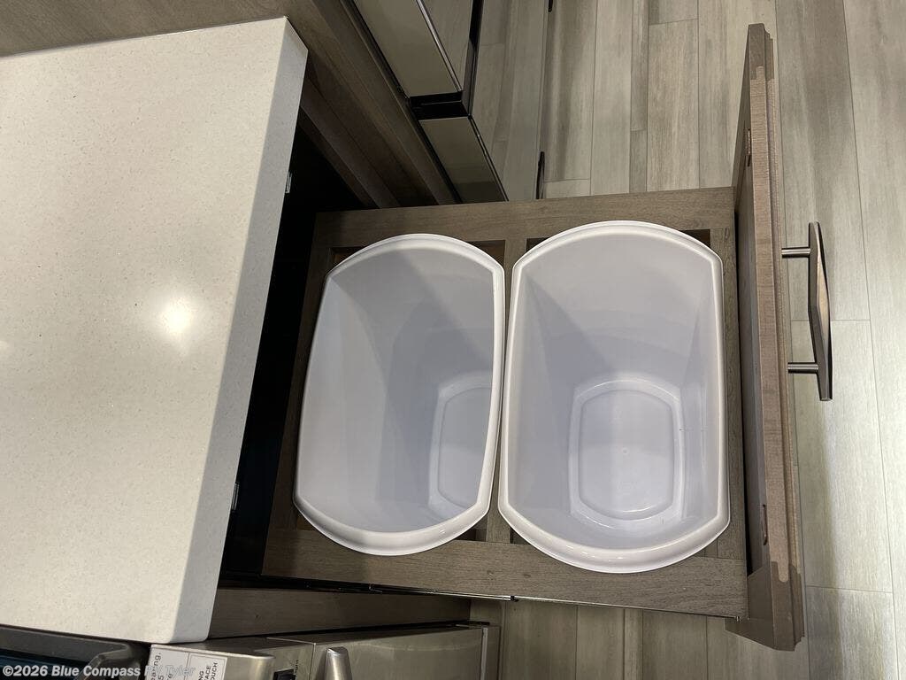 Traveling for long periods at a time is made easy with this gourmet kitchen that can feed your entire group a holiday meal! The professional-grade stainless steel cooktop with a built-in oven, microwave, 20 cu. ft. refrigerator, and a kitchen island offers everything you will need to enjoy cooking for your family and guests. There is abundant storage throughout multiple overhead cabinets, a kitchen pantry and a bath linen cabinet for your towels, and in the front master bedroom which features a large closet. In the bedroom there is also a queen bed slide for added space to sleep comfortable at night, or you may choose an optional king bed if you enjoy more space. You will also find a closet with washer/dryer prep, large wardrobe, clothes hamper plus a slide top dresser. Two nice awnings will provide outdoor living space keeping you protected from the sun and rain, and you can add an optional pull-out kitchen to enjoy convenient cooking outdoors as well.