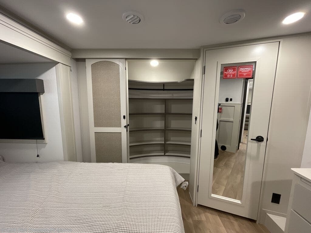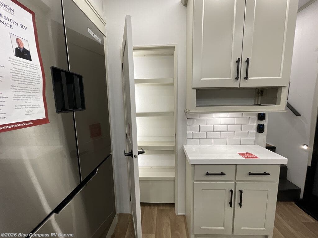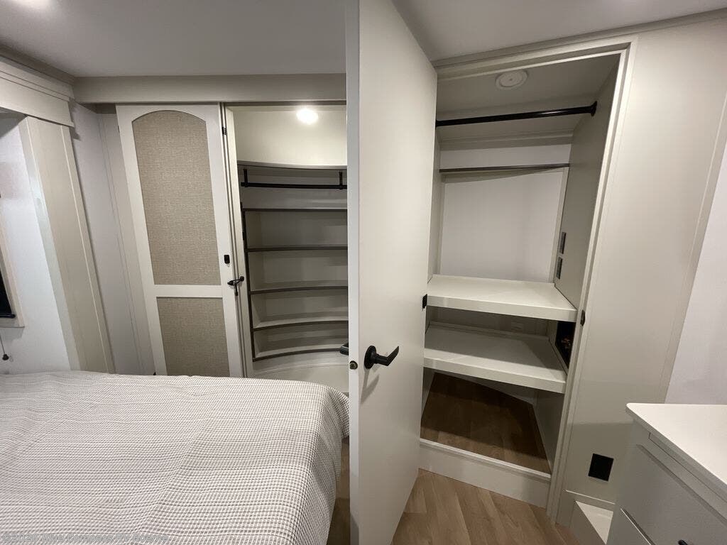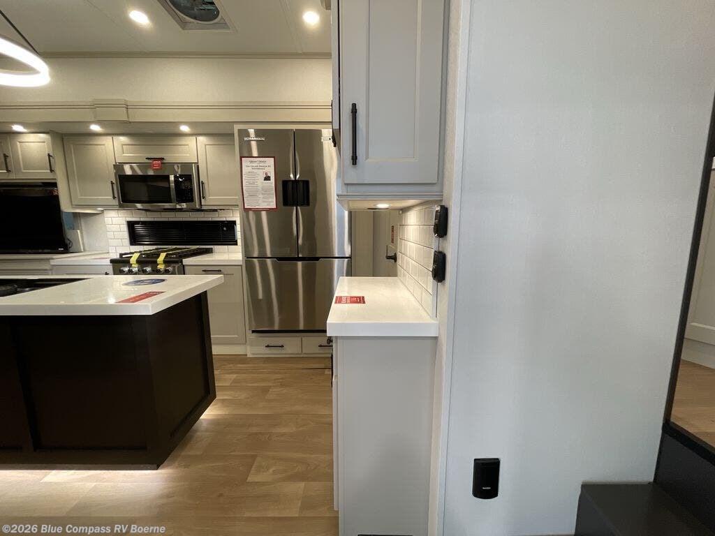Traveling for long periods at a time is made easy with this gourmet kitchen that can feed your entire group a holiday meal! The professional-grade stainless steel cooktop with a built-in oven, microwave, 20 cu. ft. refrigerator, and a kitchen island offers everything you will need to enjoy cooking for your family and guests. There is abundant storage throughout multiple overhead cabinets, a kitchen pantry and a bath linen cabinet for your towels, and in the front master bedroom which features a large closet. In the bedroom there is also a queen bed slide for added space to sleep comfortable at night, or you may choose an optional king bed if you enjoy more space. You will also find a closet with washer/dryer prep, large wardrobe, clothes hamper plus a slide top dresser. Two nice awnings will provide outdoor living space keeping you protected from the sun and rain, and you can add an optional pull-out kitchen to enjoy convenient cooking outdoors as well.