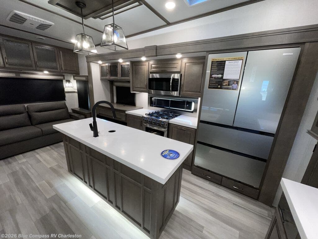 Traveling for long periods at a time is made easy with this gourmet kitchen that can feed your entire group a holiday meal! The professional-grade stainless steel cooktop with a built-in oven, microwave, 20 cu. ft. refrigerator, and a kitchen island offers everything you will need to enjoy cooking for your family and guests. There is abundant storage throughout multiple overhead cabinets, a kitchen pantry and a bath linen cabinet for your towels, and in the front master bedroom which features a large closet. In the bedroom there is also a queen bed slide for added space to sleep comfortable at night, or you may choose an optional king bed if you enjoy more space. You will also find a closet with washer/dryer prep, large wardrobe, clothes hamper plus a slide top dresser. Two nice awnings will provide outdoor living space keeping you protected from the sun and rain, and you can add an optional pull-out kitchen to enjoy convenient cooking outdoors as well.