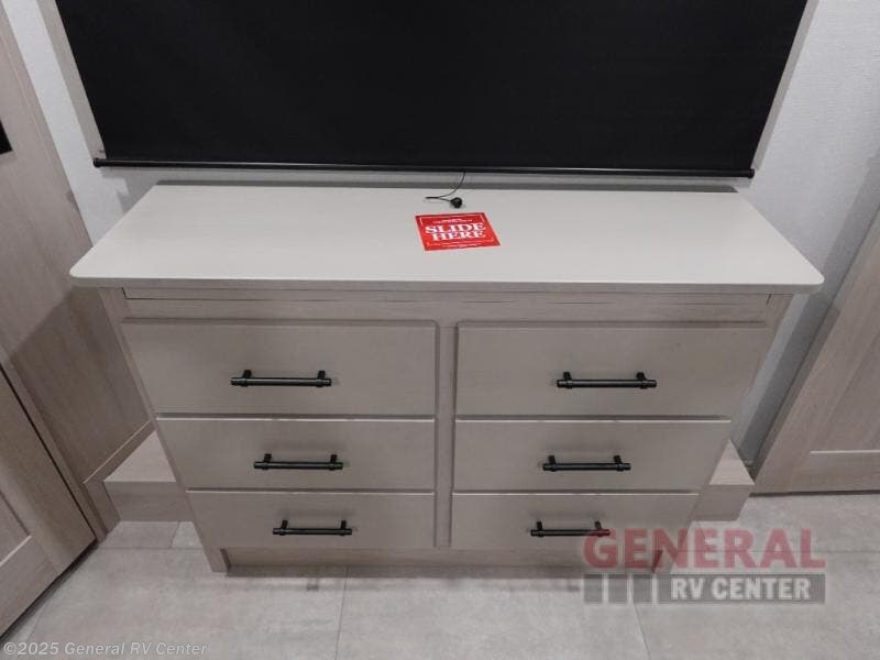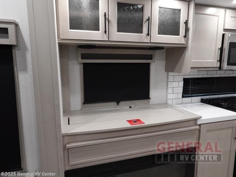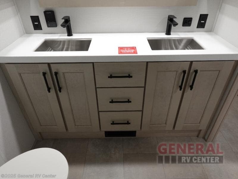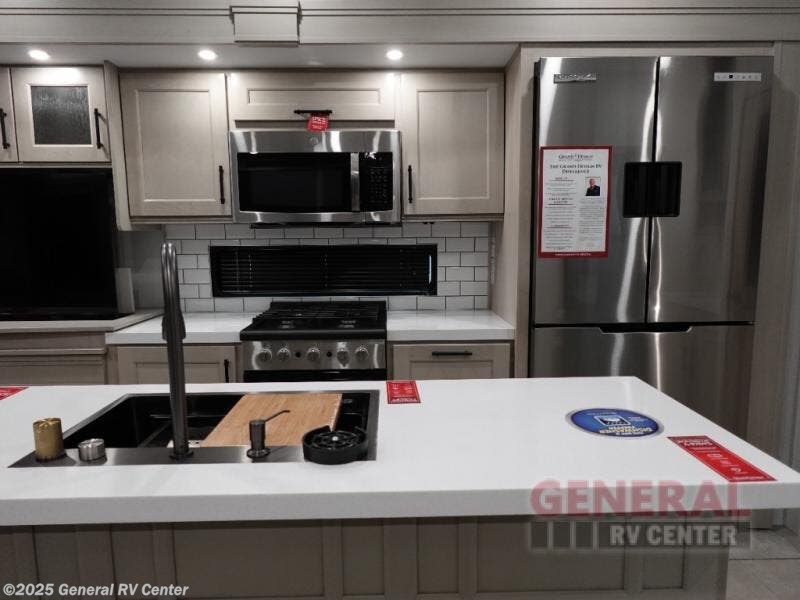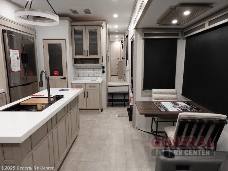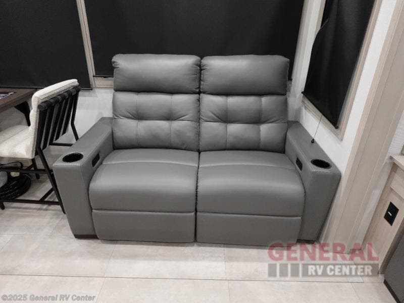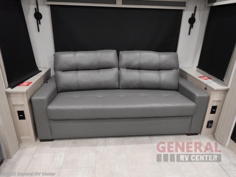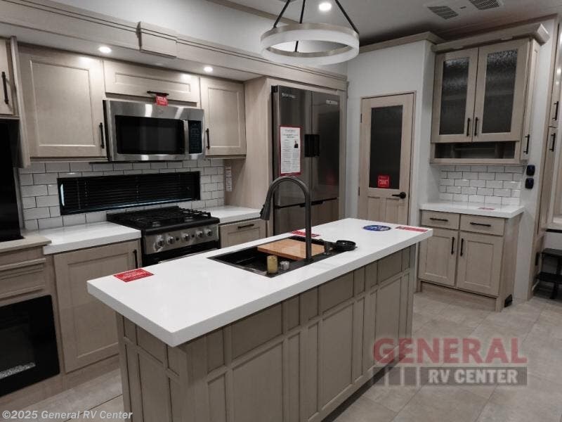 Are you looking to upgrade from a travel trailer to a fifth wheel? If so, this model will be perfect for you! Once you arrive at the campground, you can unload your gear from the pass-through storage, put out the two power awnings, then relax with a cold drink. Inside, you can kick your feet up on the theater seating, play a game at the free-standing dinette, or relax on the tri-fold sofa. The chef of your group will have a kitchen island with a Smart sink, dishwasher prep if you want the option to make cleaning up easier, plus a spacious 20 cu. ft. 12V refrigerator. There is also a built-in oven, plus a pantry and a hutch for storage galore! Having two bath sinks in the full bath is sure to be a big convenience when getting ready for bed, and the king bed slide out in the front bedroom will provide a great night's rest. You will also find a front wardrobe, a slide top dresser, plus washer/dryer prep!