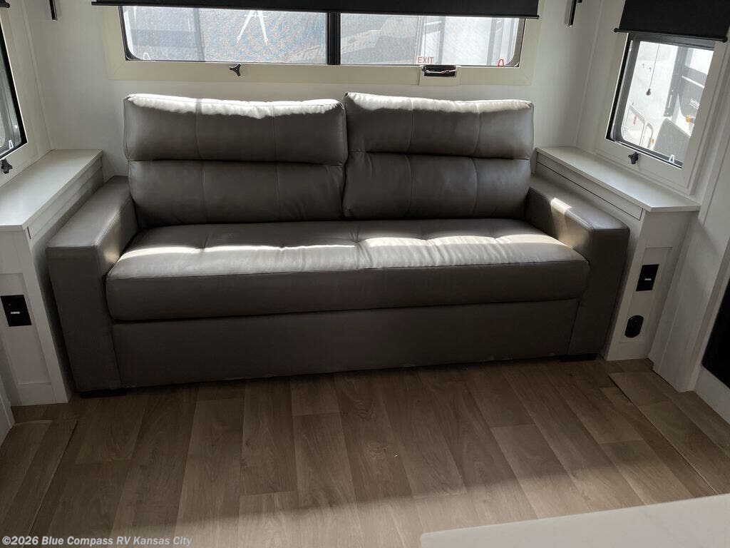 Are you looking to upgrade from a travel trailer to a fifth wheel? If so, this model will be perfect for you! Once you arrive at the campground, you can unload your gear from the pass-through storage, put out the two power awnings, then relax with a cold drink. Inside, you can kick your feet up on the theater seating, play a game at the free-standing dinette, or relax on the tri-fold sofa. The chef of your group will have a kitchen island with a Smart sink, dishwasher prep if you want the option to make cleaning up easier, plus a spacious 20 cu. ft. refrigerator. There is also a built-in oven, plus a pantry for storage galore! Having two bath sinks in the full bath is sure to be a big convenience when getting ready for bed, and the queen bed slide out in the front bedroom will provide a great night's rest. You will also find a front wardrobe, a slide top dresser, plus washer/dryer prep!