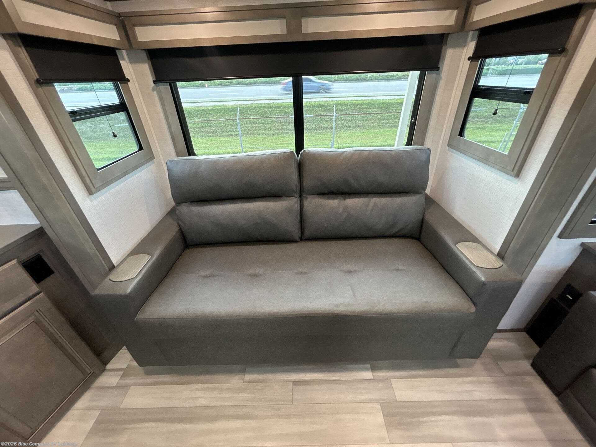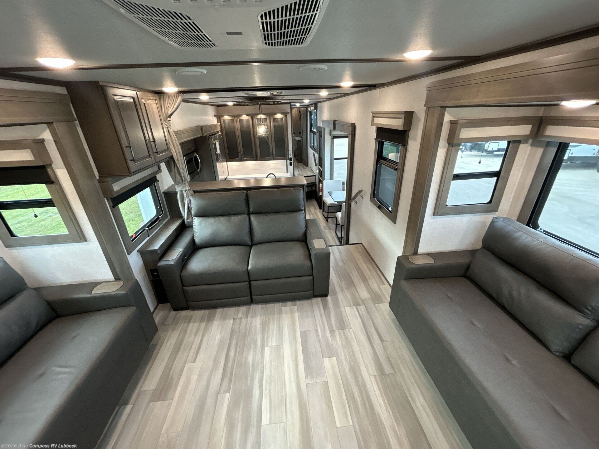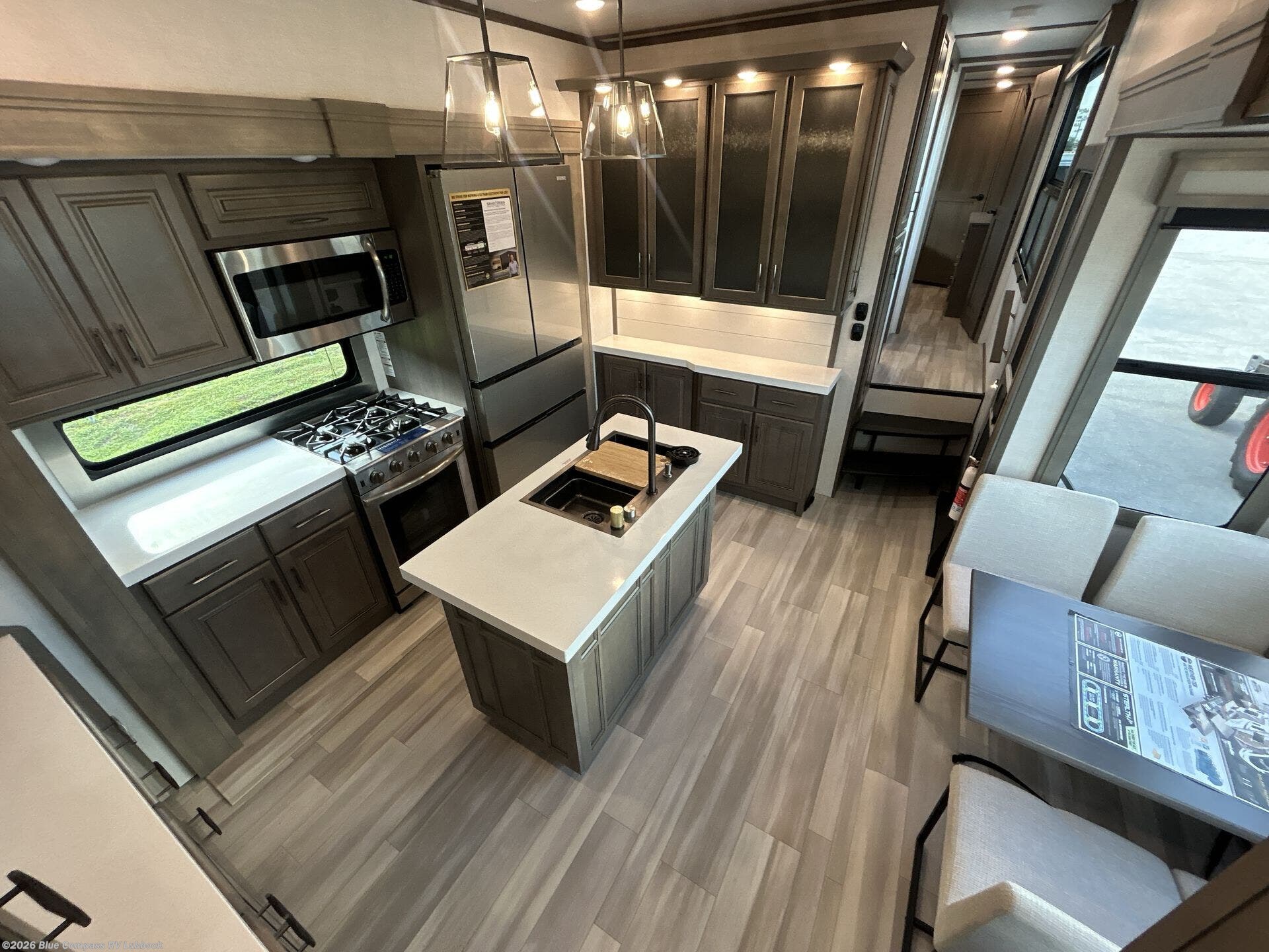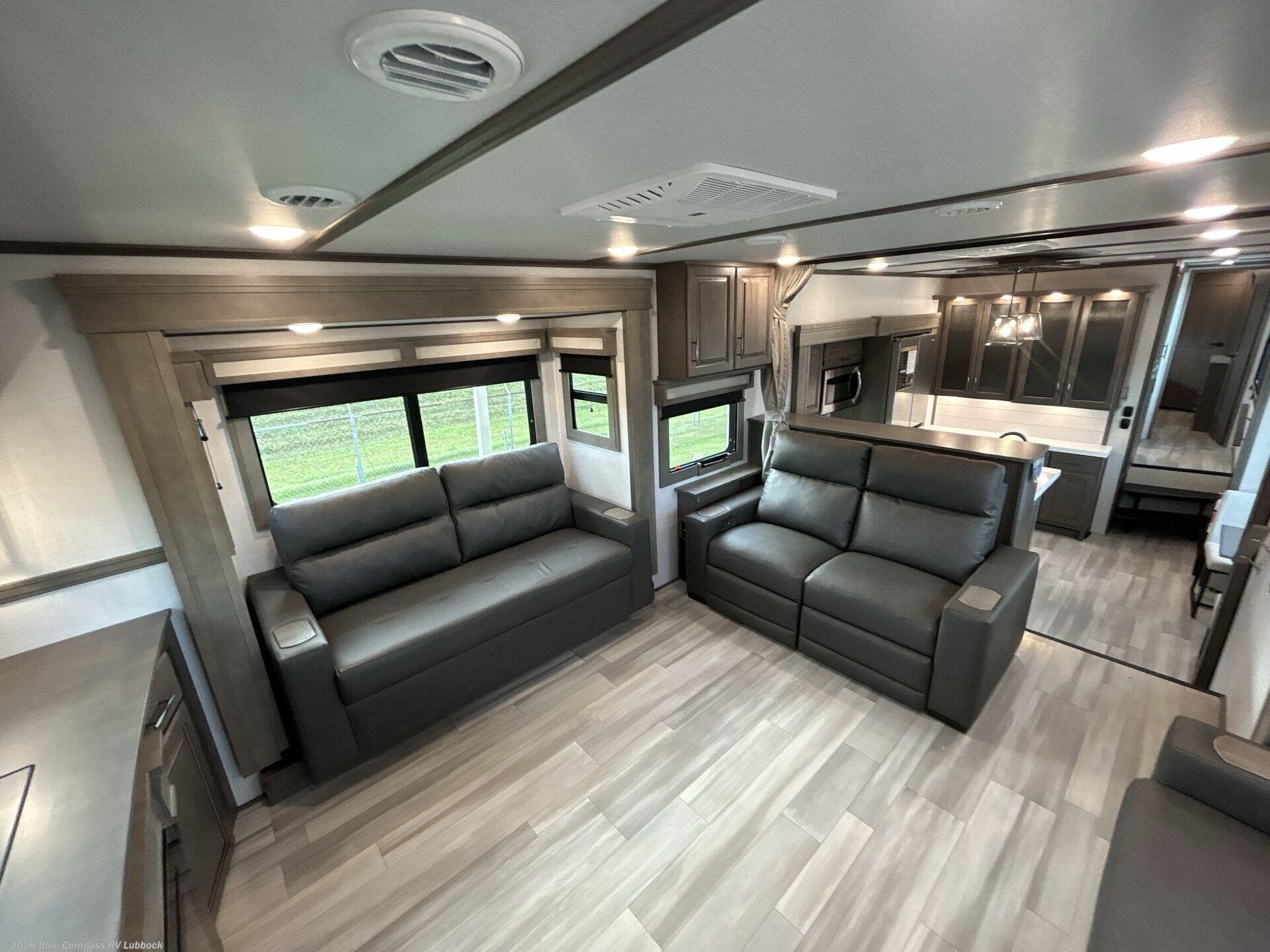 Each minute spent in this spacious fifth wheel will feel just like home! The rear living area includes a rear entertainment center with an LED Smart TV and a fireplace, overhead cabinets, theater seating, plus two tri-fold sofas for your guests to sleep on. You will have the front private bedroom all to yourselves with a queen bed slide out that can be switched out for an optional king bed, and the front closet provides all the space you need to store your belongings. This model includes a spacious full bath plus dual bath sinks for ultimate convenience. The chef of your group will love the middle kitchen with its convenient island including double sinks, a residential cooktop and built-in oven, 20 cu. ft. refrigerator, and free-standing dinette. Head outdoors to find a 16' power awning with LED lights and middle pass through storage along with rear storage including a sliding tray, and you might want to add the optional pull-out kitchen.
