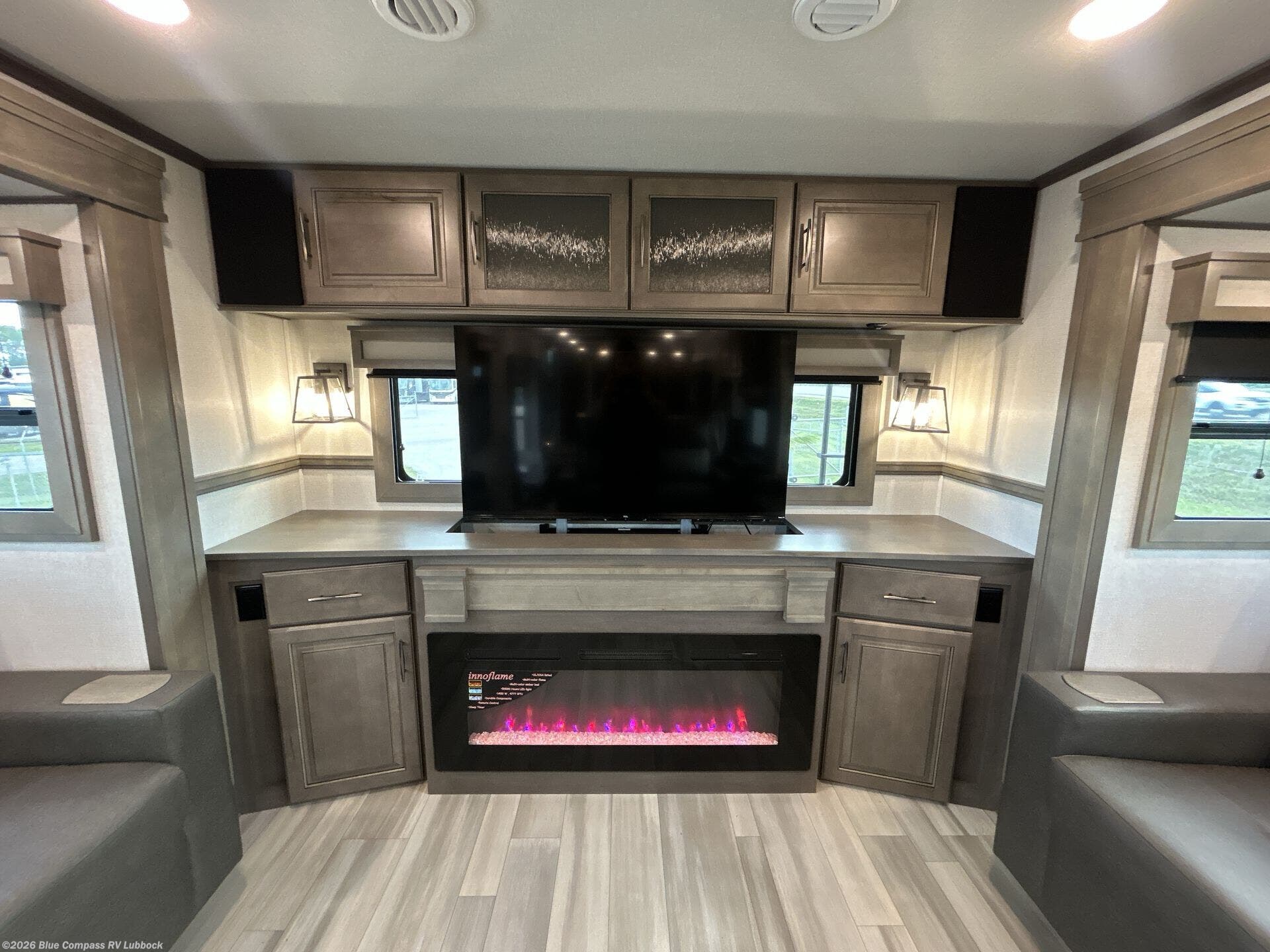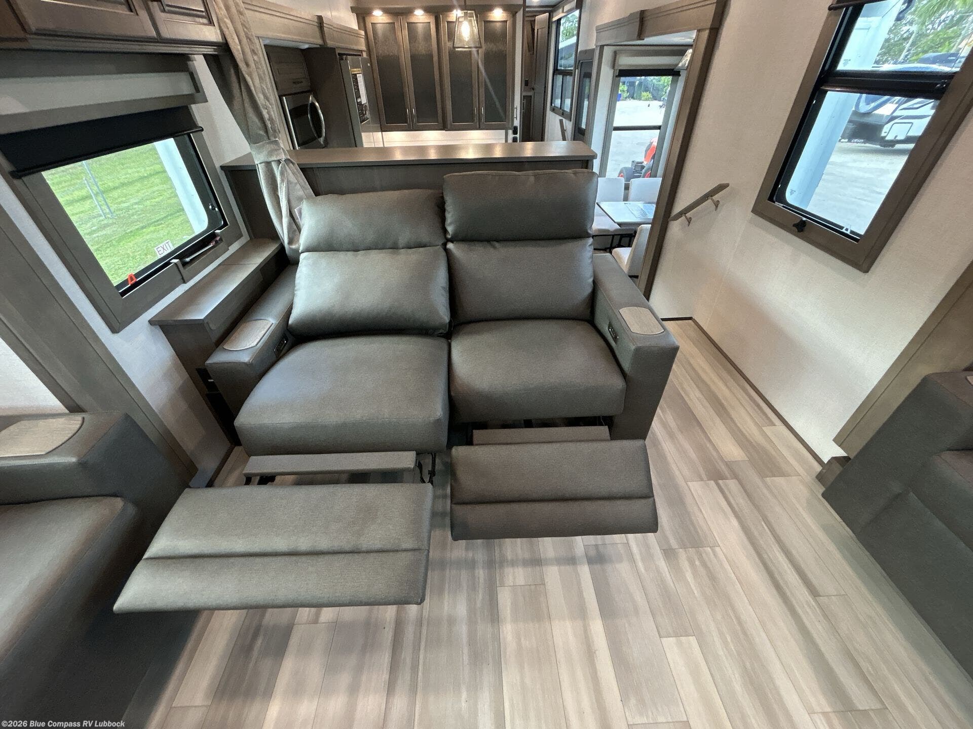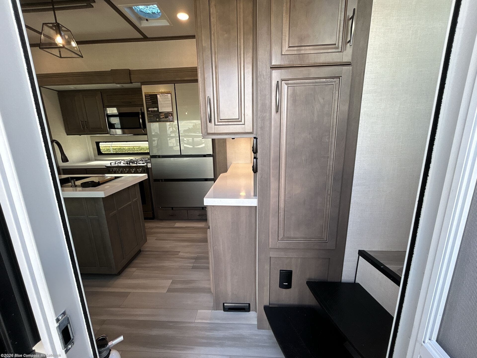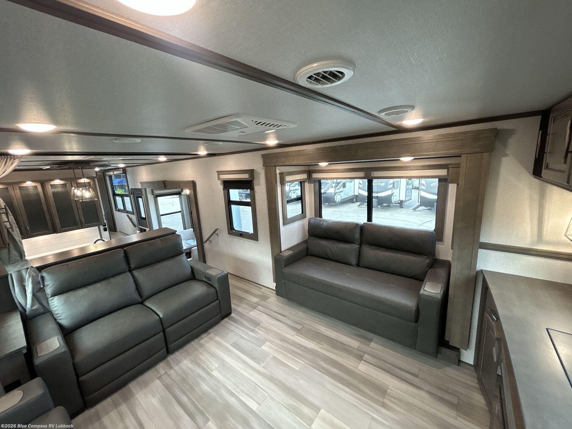 Each minute spent in this spacious fifth wheel will feel just like home! The rear living area includes a rear entertainment center with an LED Smart TV and a fireplace, overhead cabinets, theater seating, plus two tri-fold sofas for your guests to sleep on. You will have the front private bedroom all to yourselves with a queen bed slide out that can be switched out for an optional king bed, and the front closet provides all the space you need to store your belongings. This model includes a spacious full bath plus dual bath sinks for ultimate convenience. The chef of your group will love the middle kitchen with its convenient island including double sinks, a residential cooktop and built-in oven, 20 cu. ft. refrigerator, and free-standing dinette. Head outdoors to find a 16' power awning with LED lights and middle pass through storage along with rear storage including a sliding tray, and you might want to add the optional pull-out kitchen.