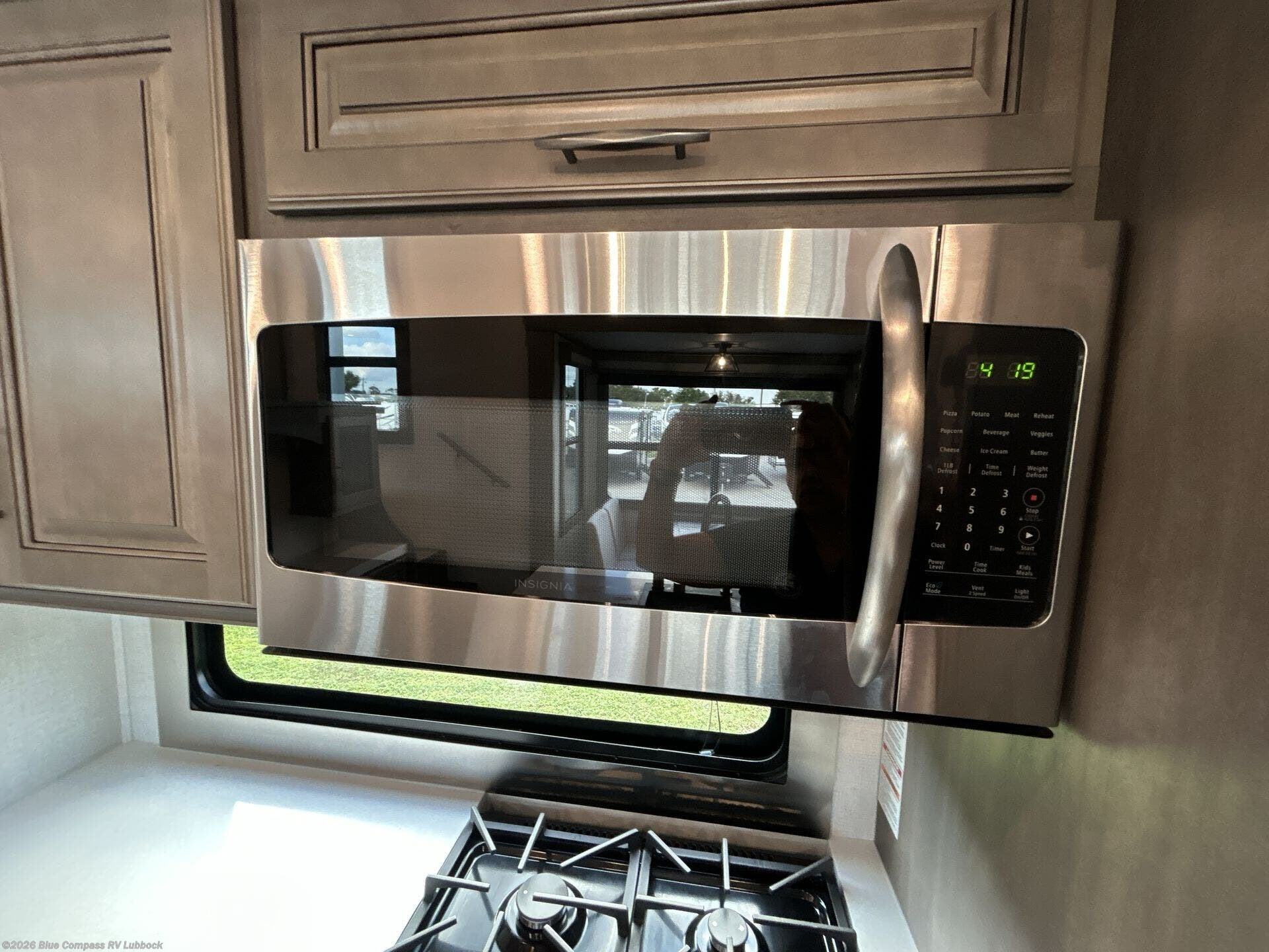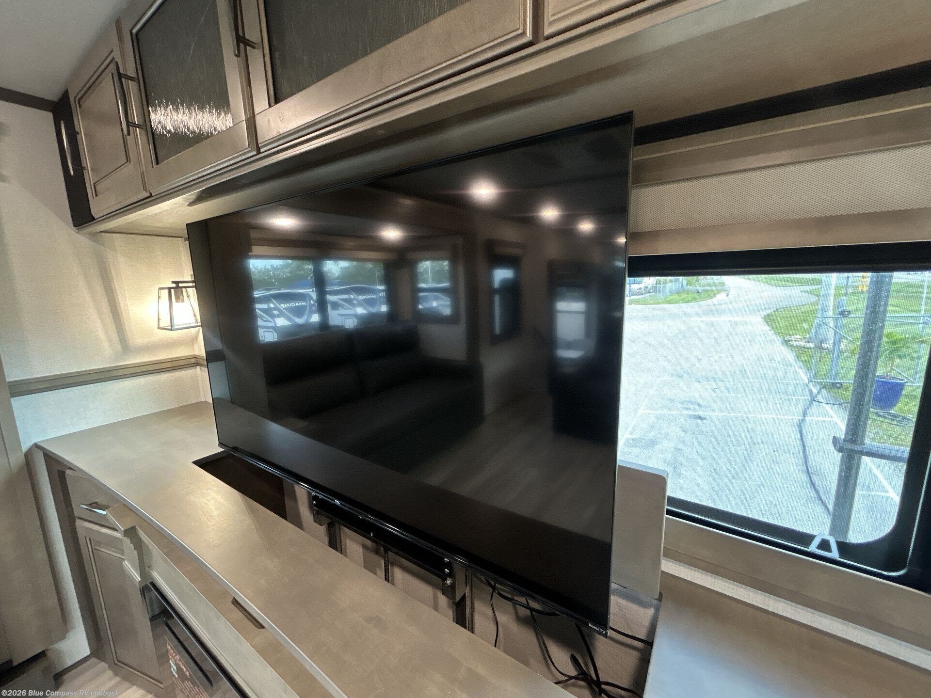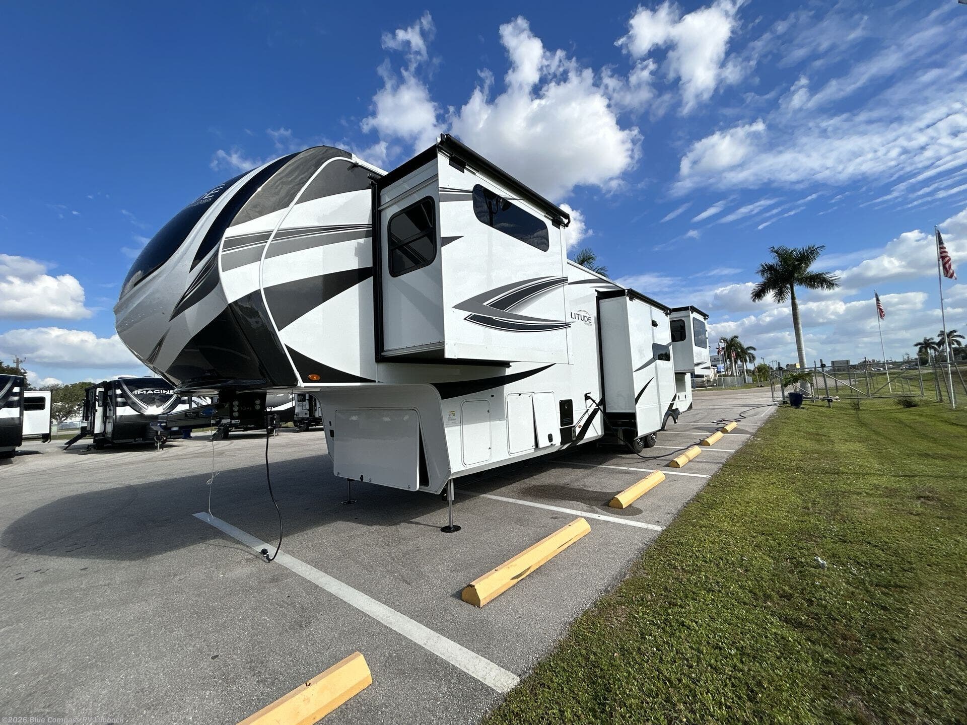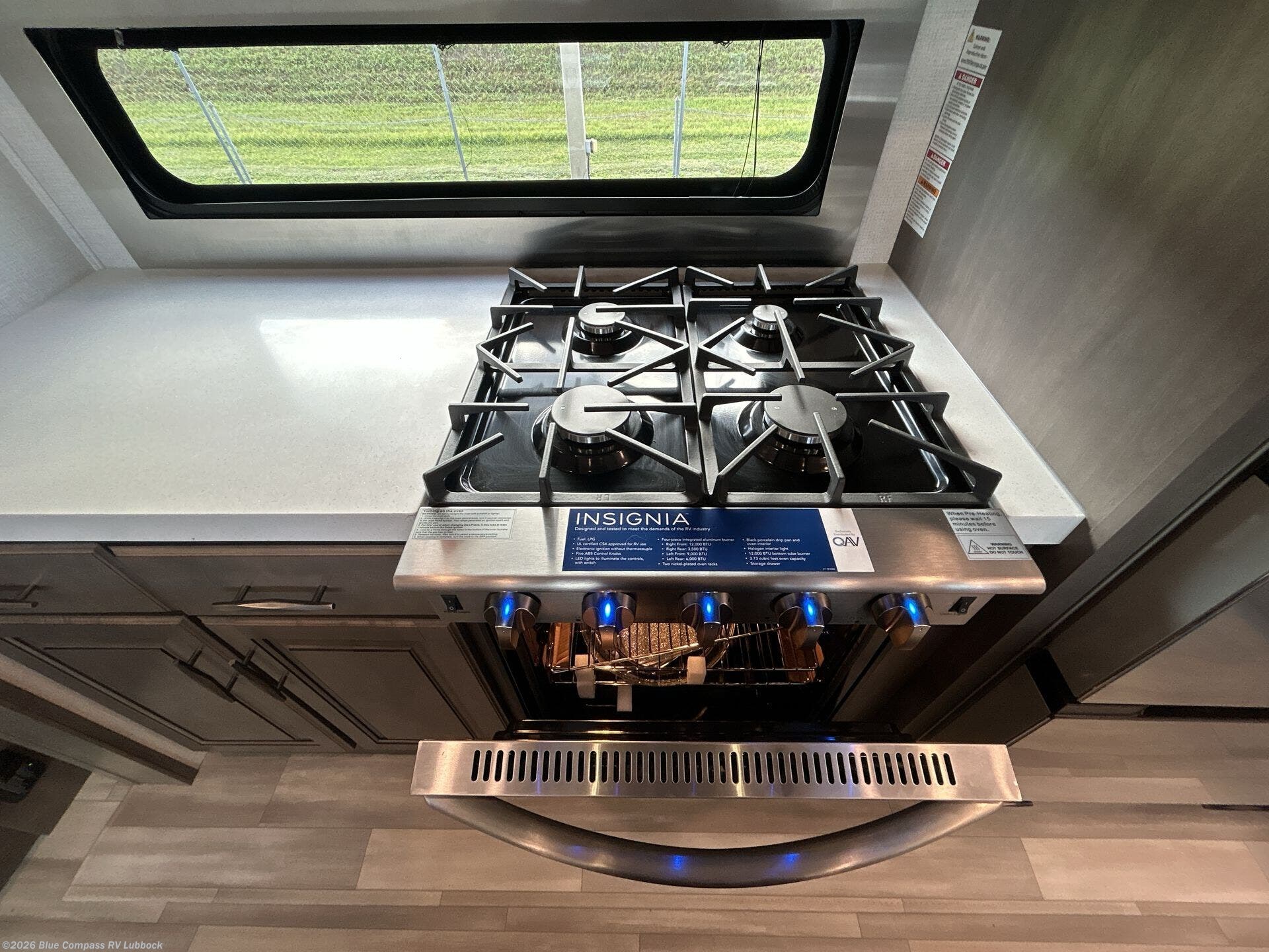 Each minute spent in this spacious fifth wheel will feel just like home! The rear living area includes a rear entertainment center with an LED Smart TV and a fireplace, overhead cabinets, theater seating, plus two tri-fold sofas for your guests to sleep on. You will have the front private bedroom all to yourselves with a queen bed slide out that can be switched out for an optional king bed, and the front closet provides all the space you need to store your belongings. This model includes a spacious full bath plus dual bath sinks for ultimate convenience. The chef of your group will love the middle kitchen with its convenient island including double sinks, a residential cooktop and built-in oven, 20 cu. ft. refrigerator, and free-standing dinette. Head outdoors to find a 16' power awning with LED lights and middle pass through storage along with rear storage including a sliding tray, and you might want to add the optional pull-out kitchen.