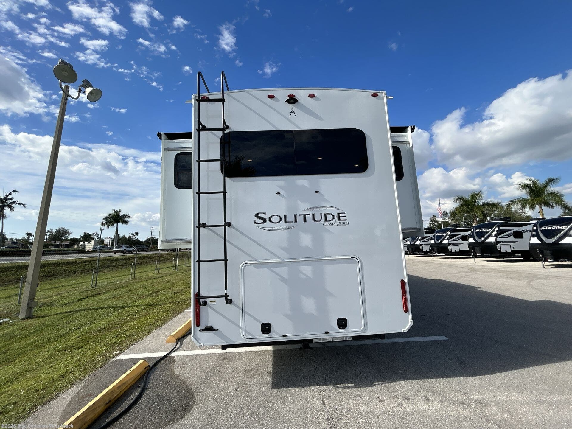 Each Solitude fifth wheel by Grand Design features a 101" wide-body construction, heavy duty 8,000 lb. axles, frameless tinted windows, and high-gloss gel coat sidewalls. You can camp during harsh weather thanks to the Weather-Tek Package that includes a 35K BTU high-capacity furnace, an all-in-one enclosed and heated utility center, and a fully enclosed underbelly with heated tanks and storage. Inside, you'll love the premium roller shades, hardwood cabinet doors, solid surface countertops, plus residential finishes throughout to make you truly feel at home. Each model also includes a MORryde CRE3000 suspension system, and a MORryde pin box that will provide smooth towing from home to campground. Affordable luxury is possible with the Solitude fifth wheels; choose yours today!
