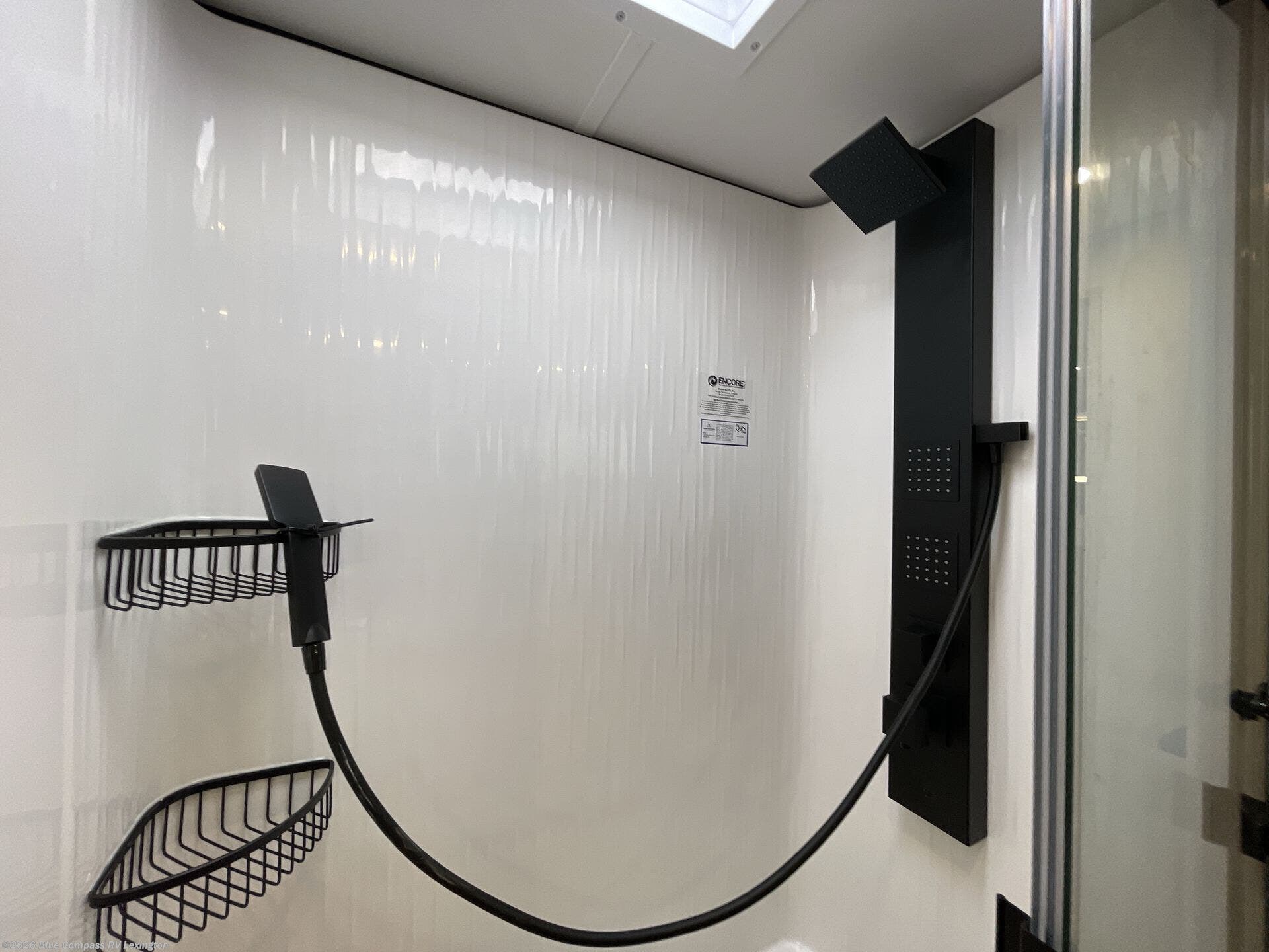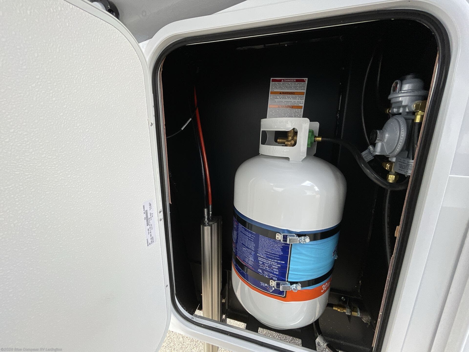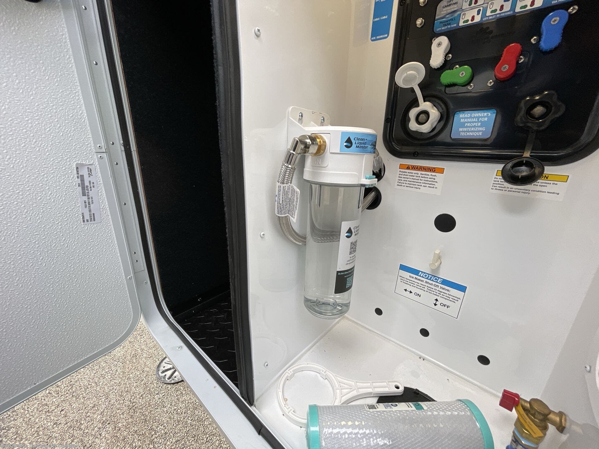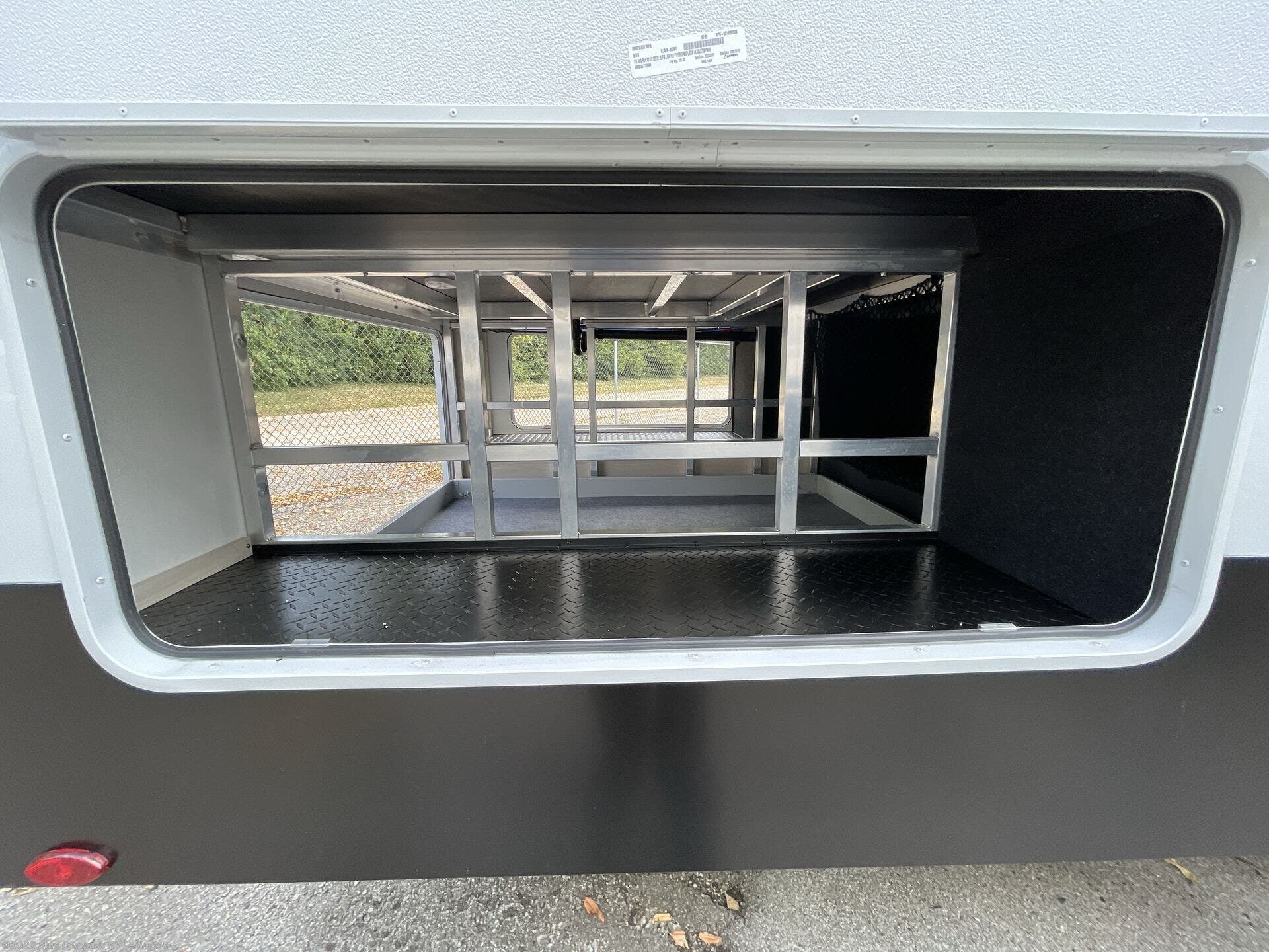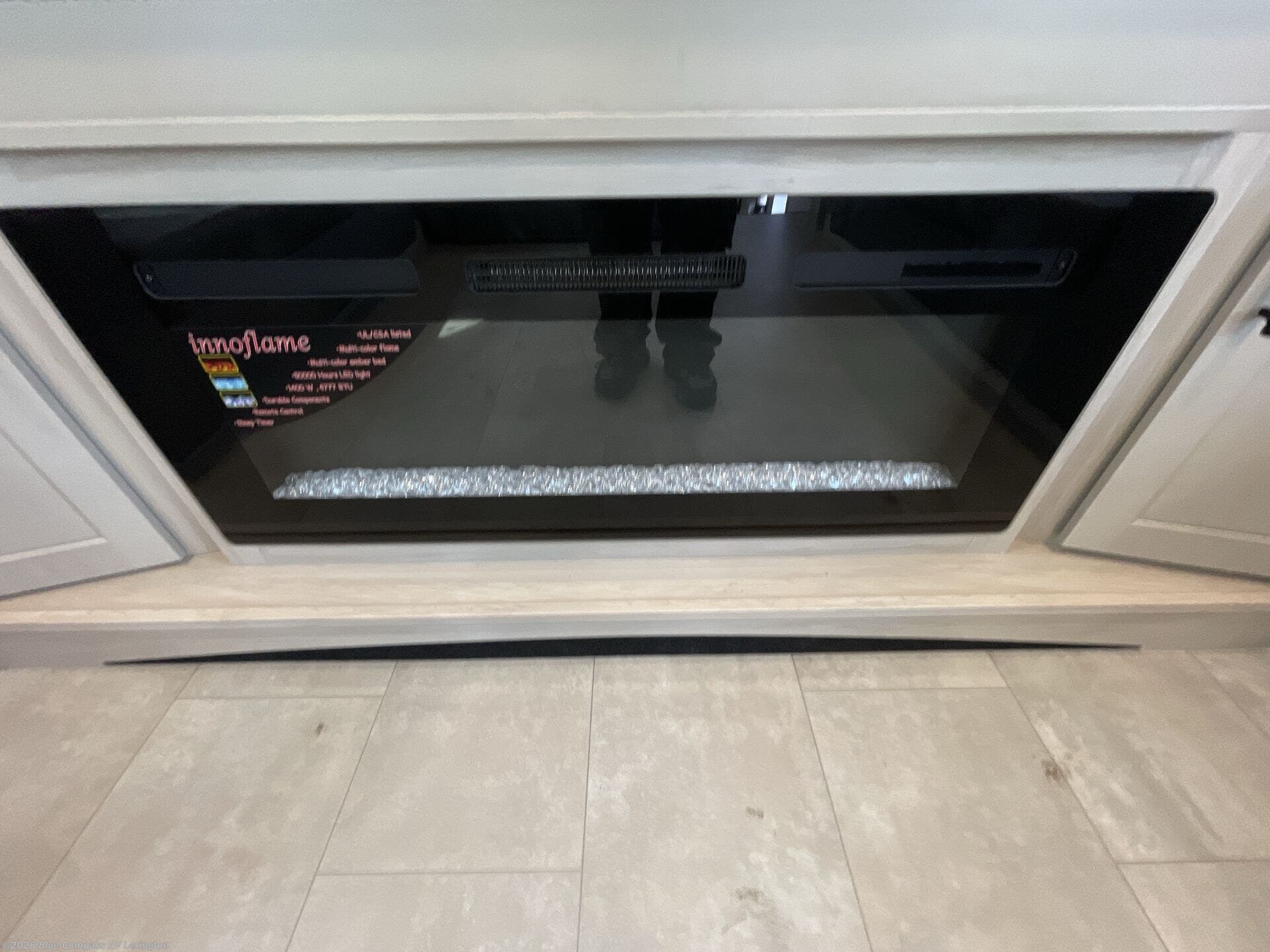 Five slide outs, a full bathroom with dual sinks, a half bath off of the kitchen, and a separate front living room and entertainment area are a few reasons you will enjoy your time spent in this fifth wheel! The separate kitchen is a dream with stainless steel appliances including a built-in oven, a pantry and hutch with counter space, a kitchen island plus a free-standing dinette slide with windows for great views. The entertainment center offers an LED Smart TV with a fireplace below and storage, and the dual opposing tri-fold sofas provide added sleeping space at night. The master bedroom includes a queen bed plus space savings sliding doors that lead you to the rear full bathroom with dual sinks, linen storage, and washer/dryer prep. The exterior has several storage choices as well including a pass-through compartment for fishing poles and such, plus the unique sliding tray in the rear allows you to bring along larger items such as camping tables, portable grills, golf clubs, totes and more.