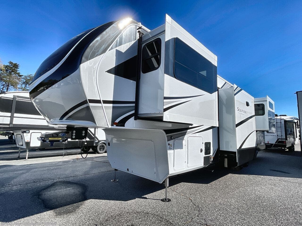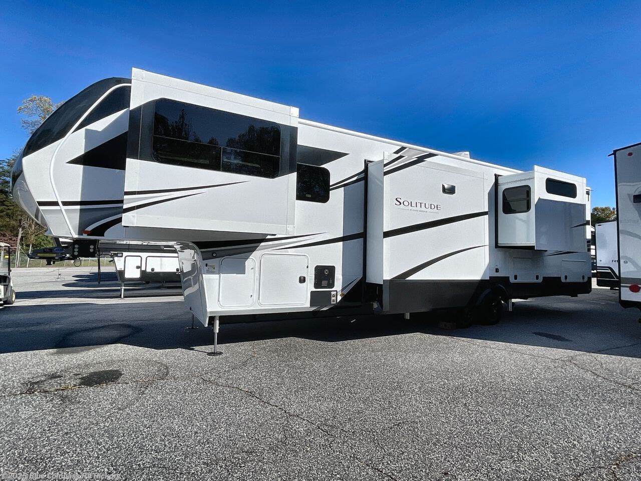 Each Solitude fifth wheel by Grand Design features a 101" wide-body construction, heavy duty 8,000 lb. axles, frameless tinted windows, and high-gloss gel coat sidewalls. You can camp year around thanks to the Weather-Tek Package that includes a 35K BTU high-capacity furnace, an all-in-one enclosed and heated utility center, and a fully enclosed underbelly with heated tanks and storage. Inside, you'll love the premium roller shades, hardwood cabinet doors, solid surface countertops, plus residential finishes throughout to make you truly feel at home. Each model also includes a MORryde CRE3000 suspension system, self adjusting brakes, and a MORryde pin box that will provide smooth towing from home to campground. Affordable luxury is possible with the Solitude fifth wheels; choose yours today!