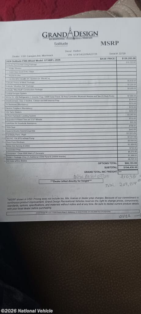 Request More Info on this 2026 Grand Design Solitude 380FL Offered for sale by National Vehicle