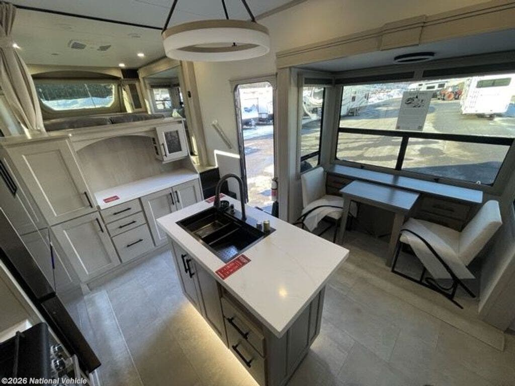 At the heart of the coach, the gourmet kitchen is both functional and elegant. It offers solid-surface countertops, a large island with deep sink, residential refrigerator, four-burner cooktop, oven, convection microwave, and abundant pantry and cabinet storage. A freestanding dinette provides a comfortable space for meals, work, or gatherings, while the open layout keeps the entire main level connected and inviting.