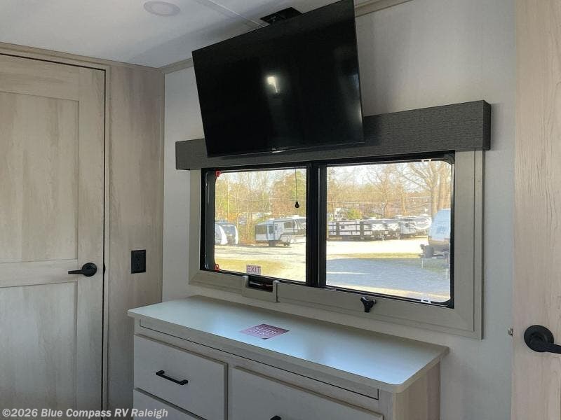 The whole gang will love camping in this spacious fifth wheel for five to six! You'll have your own bedroom up front with a queen bed slide out, a large front closet with a hamper and washer and dryer prep, plus a private entry door into the dual entry bath. Your guest can take the middle bedroom that includes a tri-fold sofa with a bunk above, a dresser/desk, plus a 50" TV for entertainment. A full kitchen includes an L-shaped counter, a 20 cu. ft. refrigerator, pull-out trash cans plus many more convenient features. And don't overlook the rear living area with its L-shaped sofa, theater seating, and free-standing dinette. There is also an entertainment center with a telescoping TV and a fireplace plus an electronics drawer to charge your phone or laptop.