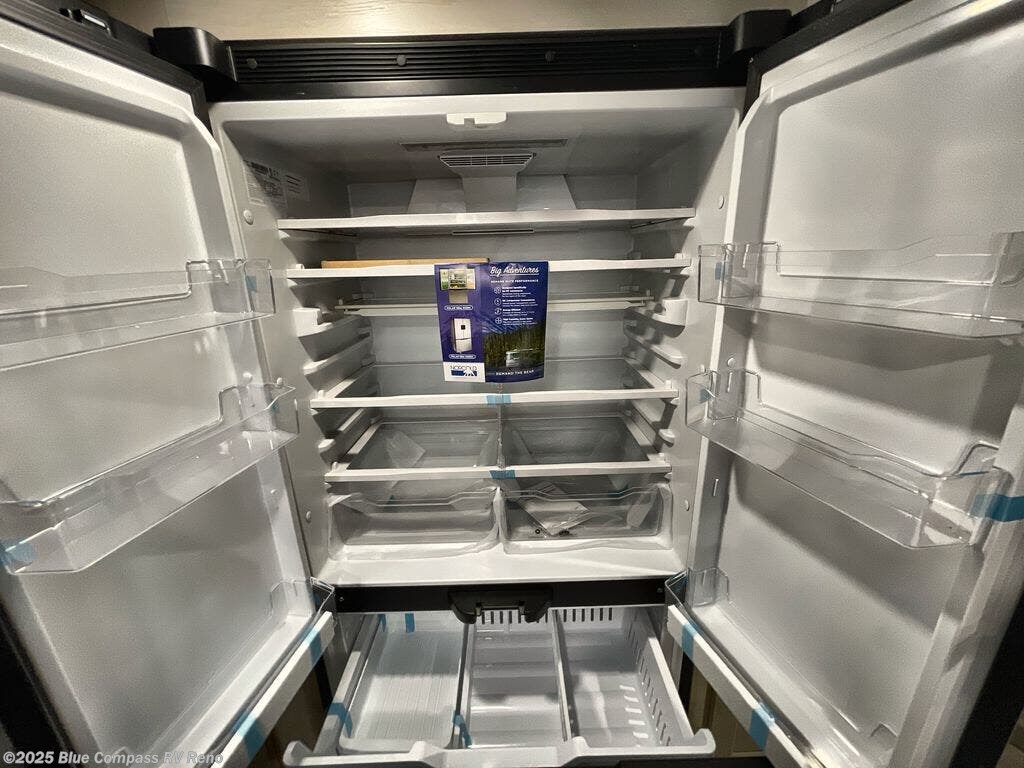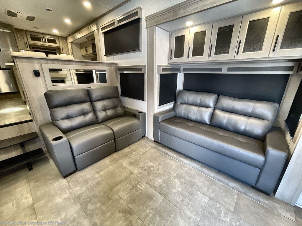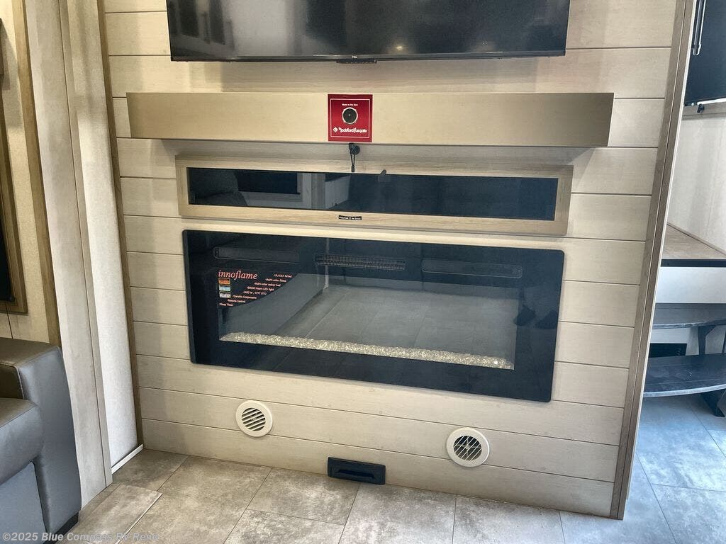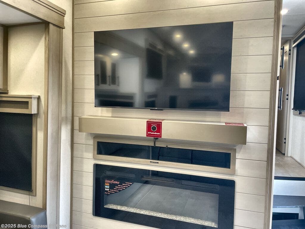 Enjoy each and every vacation, month-long trips, or even extended stays at an RV park in this spacious fifth wheel! The raised rear kitchen gives the cook plenty of room to whip up any type of meal using the stainless steel appliances including a built-in oven, an oversized pantry, and the raised bar top will provide you even more counter space on top of dining with two chairs that overlook the middle living area. Relaxing is made easy thanks to two tri-fold sofas and theatre seating while watching the big game on the LED Smart TV and enjoying the fireplace below. At night, retire to your own queen bed which slides out to provide more floor space, and you can store your clothes in the slide top dresser and front closet with washer and dryer prep.