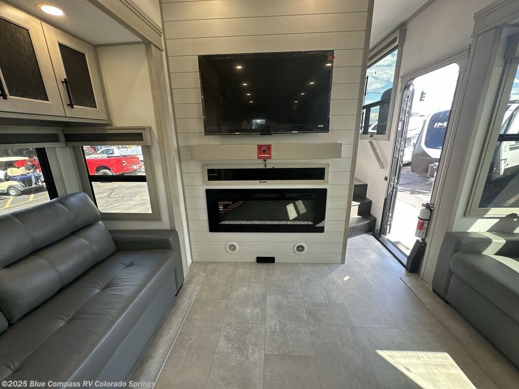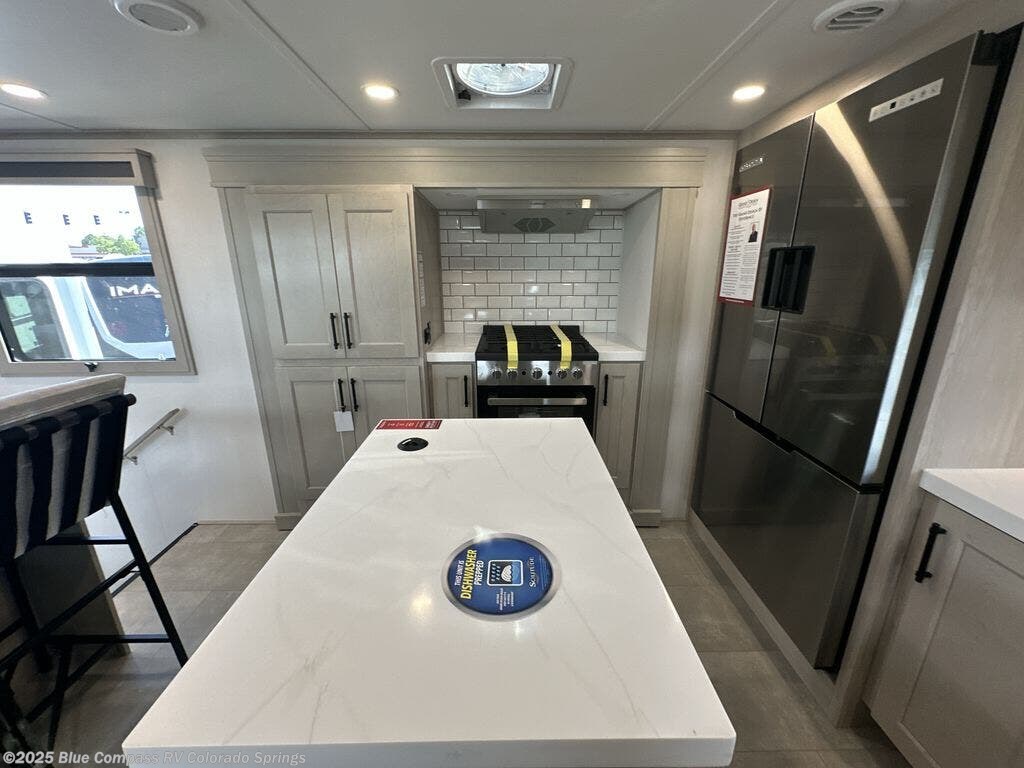 Enjoy each and every vacation, month-long trips, or even extended stays at an RV park in this spacious fifth wheel! The raised rear kitchen gives the cook plenty of room to whip up any type of meal using the stainless steel appliances including a built-in oven, an oversized pantry, and the raised bar top will provide you even more counter space on top of dining with two chairs that overlook the middle living area. Relaxing is made easy thanks to two tri-fold sofas and theatre seating while watching the big game on the LED Smart TV and enjoying the fireplace below. At night, retire to your own queen bed which slides out to provide more floor space, and you can store your clothes in the slide top dresser and front closet with washer and dryer prep.