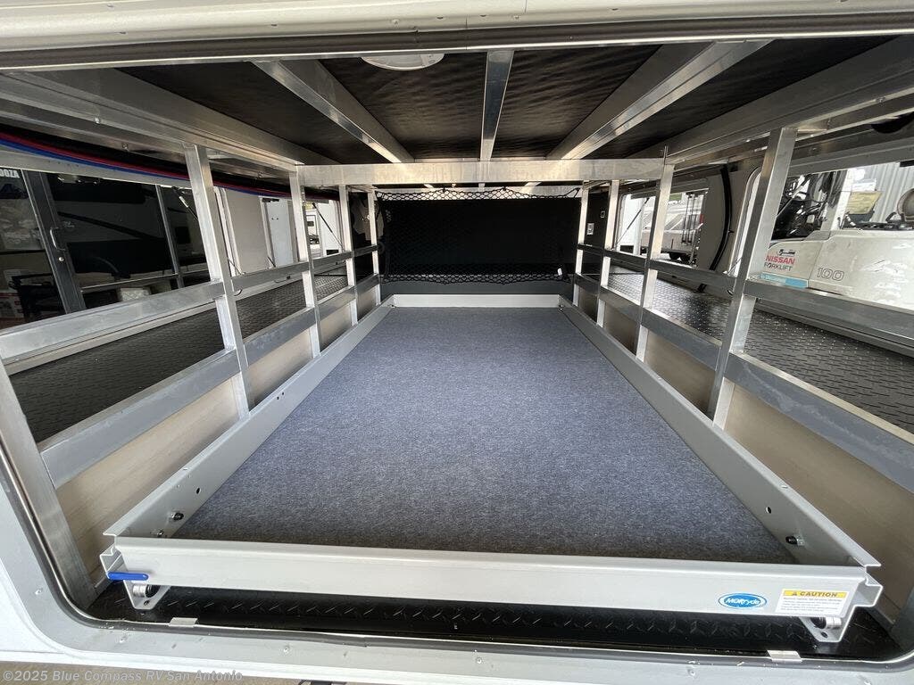 Enjoy each and every vacation, month-long trips, or even extended stays at an RV park in this spacious fifth wheel! The raised rear kitchen gives the cook plenty of room to whip up any type of meal using the stainless steel appliances including a built-in oven, an oversized pantry, and the raised bar top will provide you even more counter space on top of dining with two chairs that overlook the middle living area. Relaxing is made easy thanks to two tri-fold sofas and theatre seating while watching the big game on the LED Smart TV and enjoying the fireplace below. At night, retire to your own queen bed which slides out to provide more floor space, and you can store your clothes in the slide top dresser and front closet with washer and dryer prep.