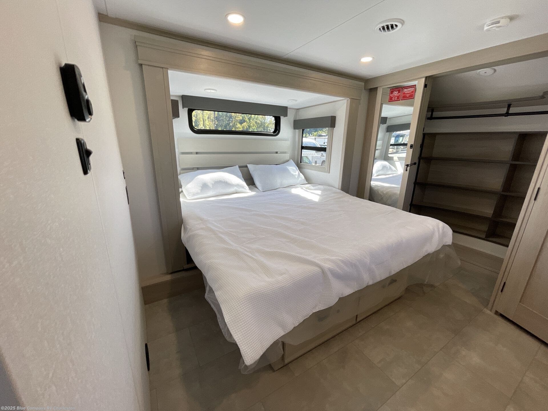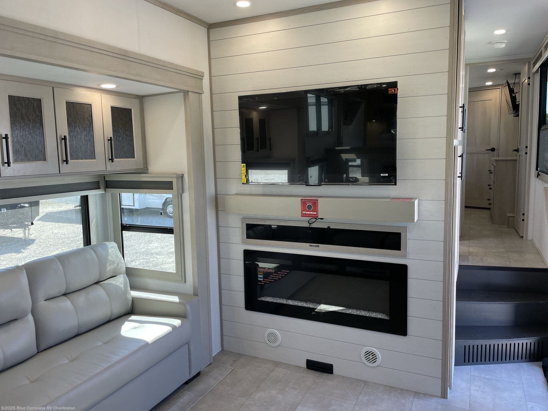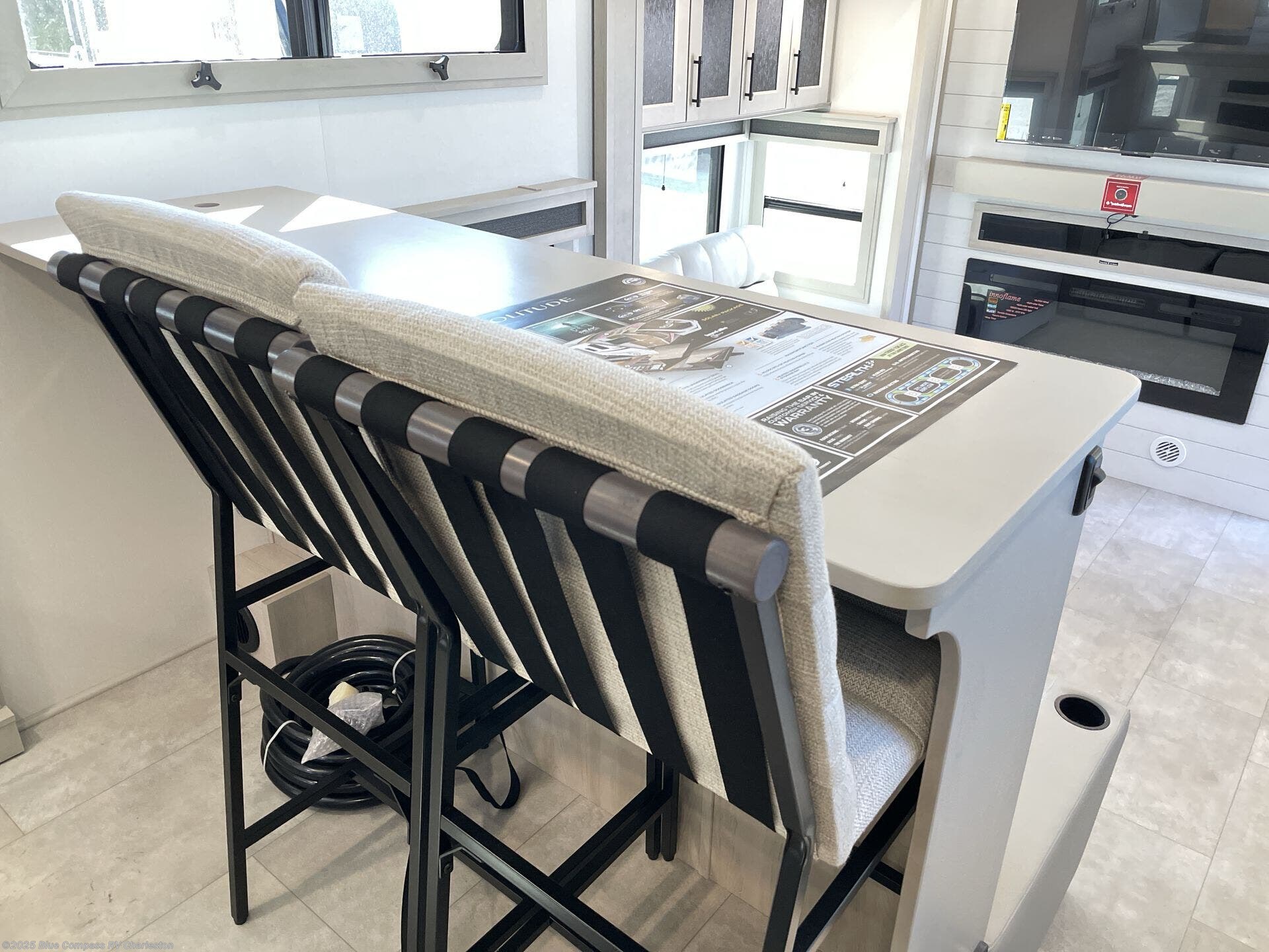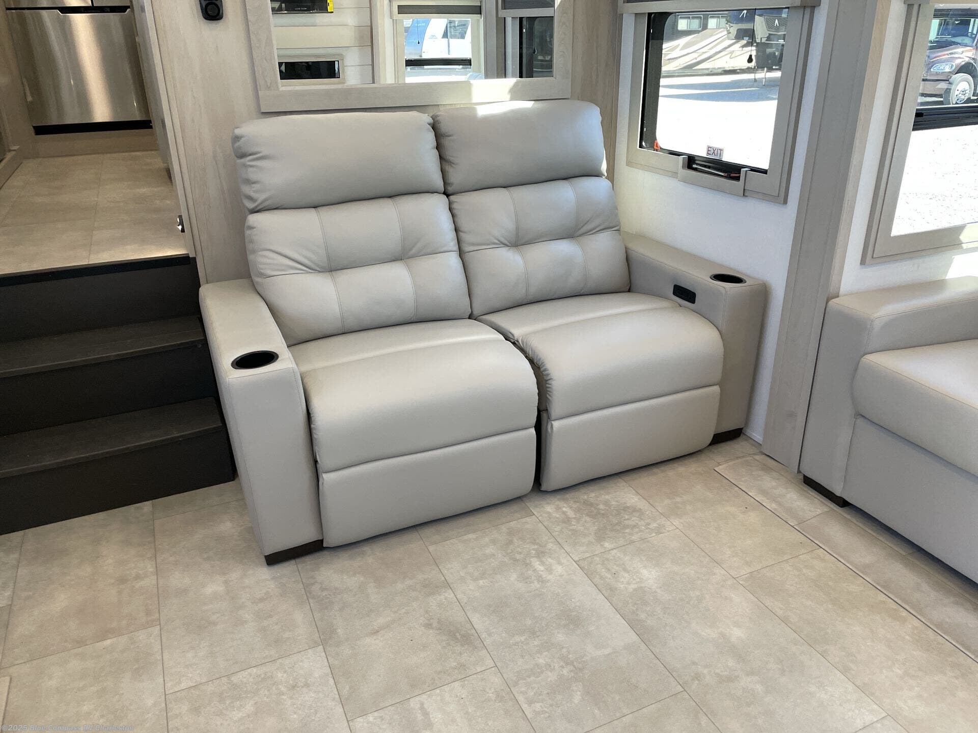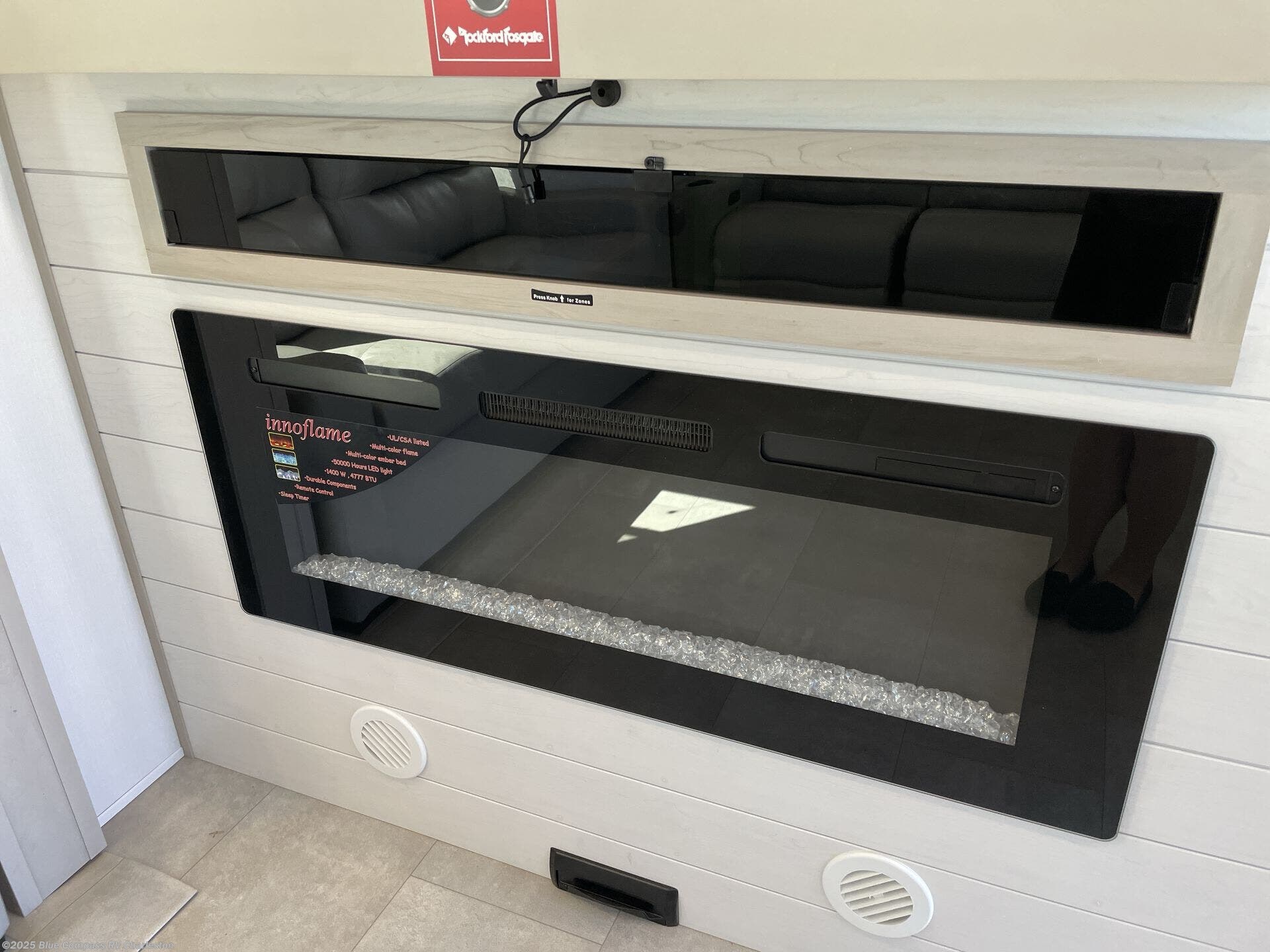 Enjoy each and every vacation, month-long trips, or even extended stays at an RV park in this spacious fifth wheel! The raised rear kitchen gives the cook plenty of room to whip up any type of meal using the stainless steel appliances including a built-in oven, an oversized pantry, and the raised bar top will provide you even more counter space on top of dining with two chairs that overlook the middle living area. Relaxing is made easy thanks to two tri-fold sofas and theatre seating while watching the big game on the LED Smart TV and enjoying the fireplace below. At night, retire to your own queen bed which slides out to provide more floor space, and you can store your clothes in the slide top dresser and front closet with washer and dryer prep.