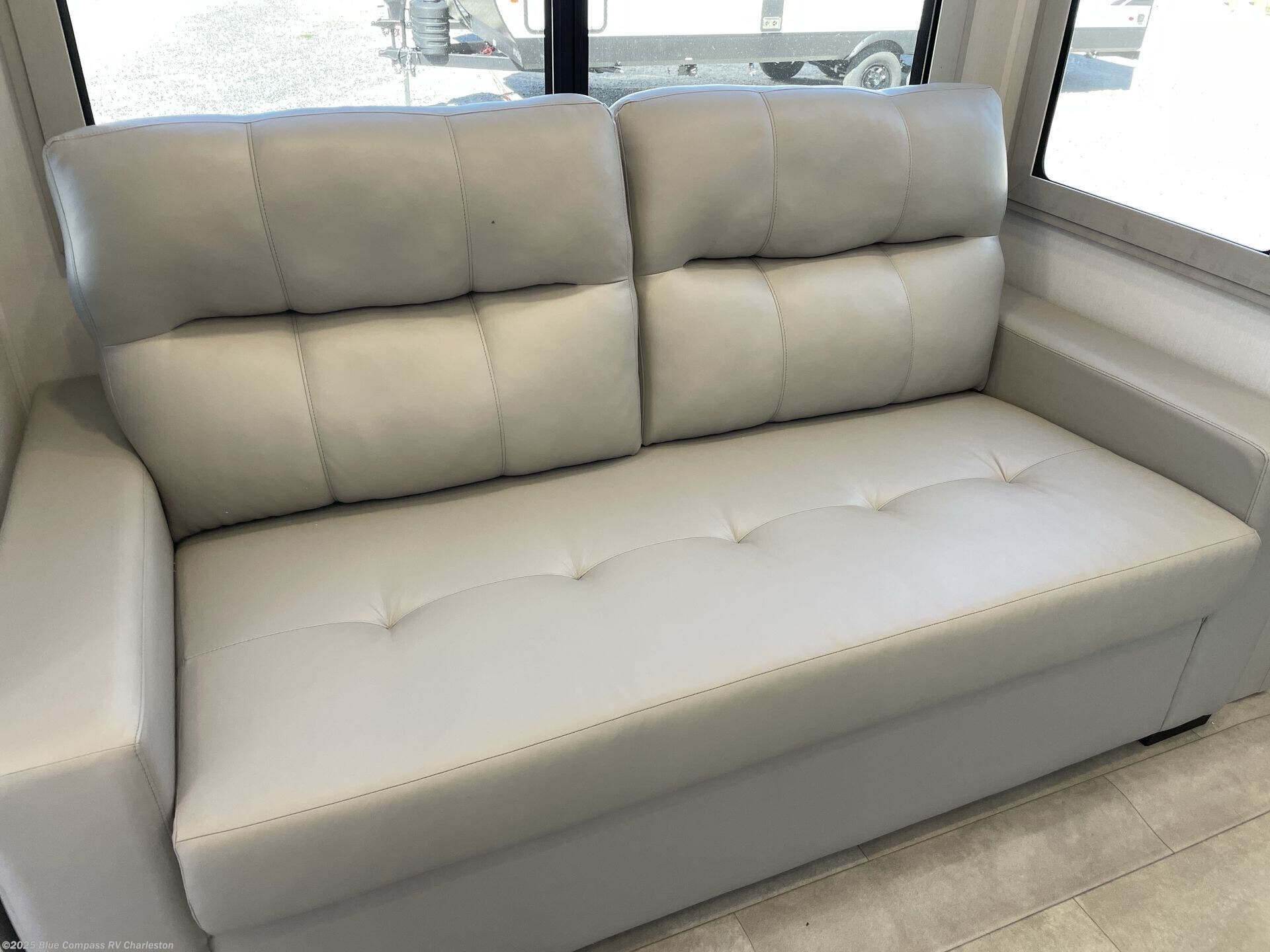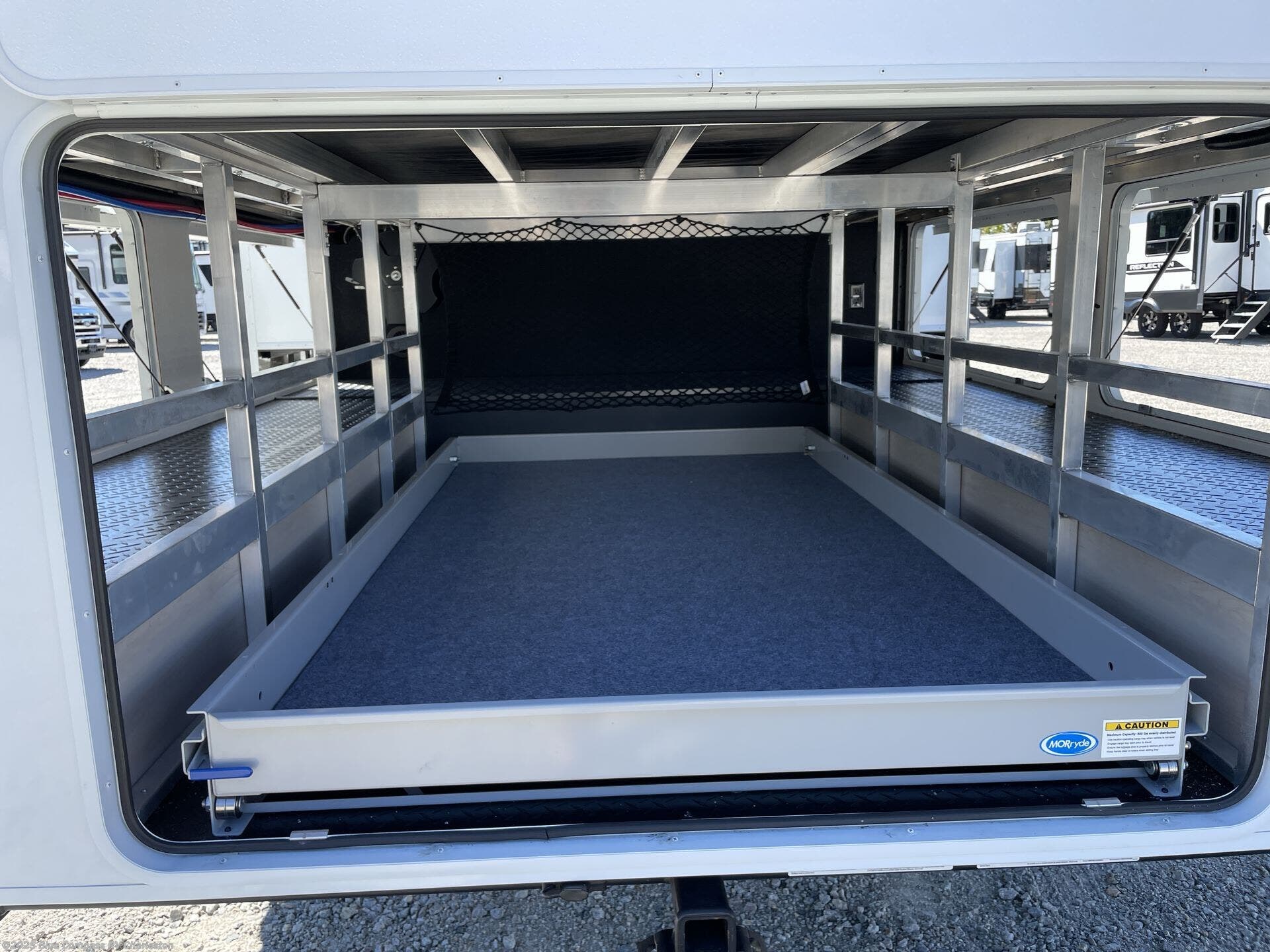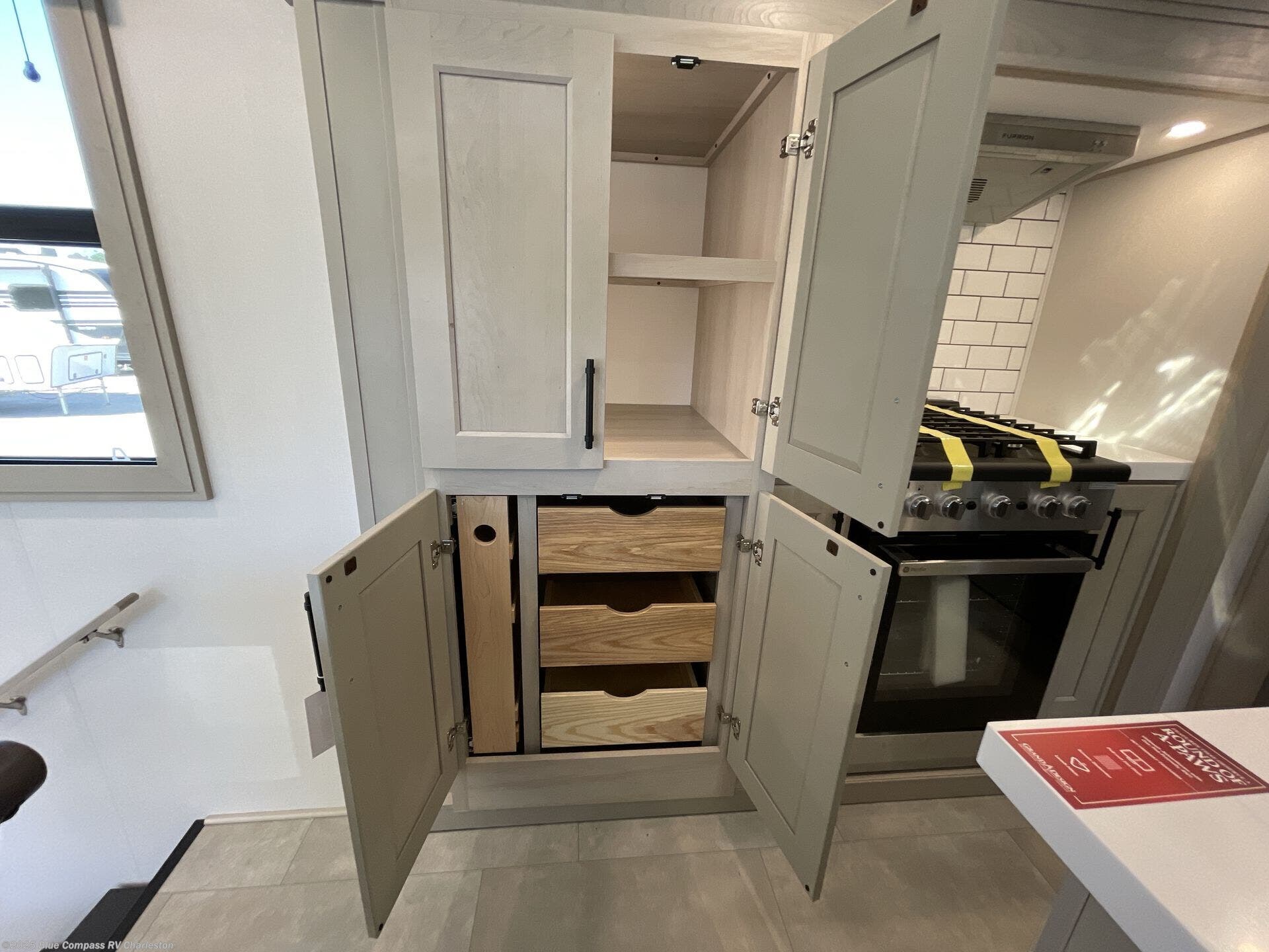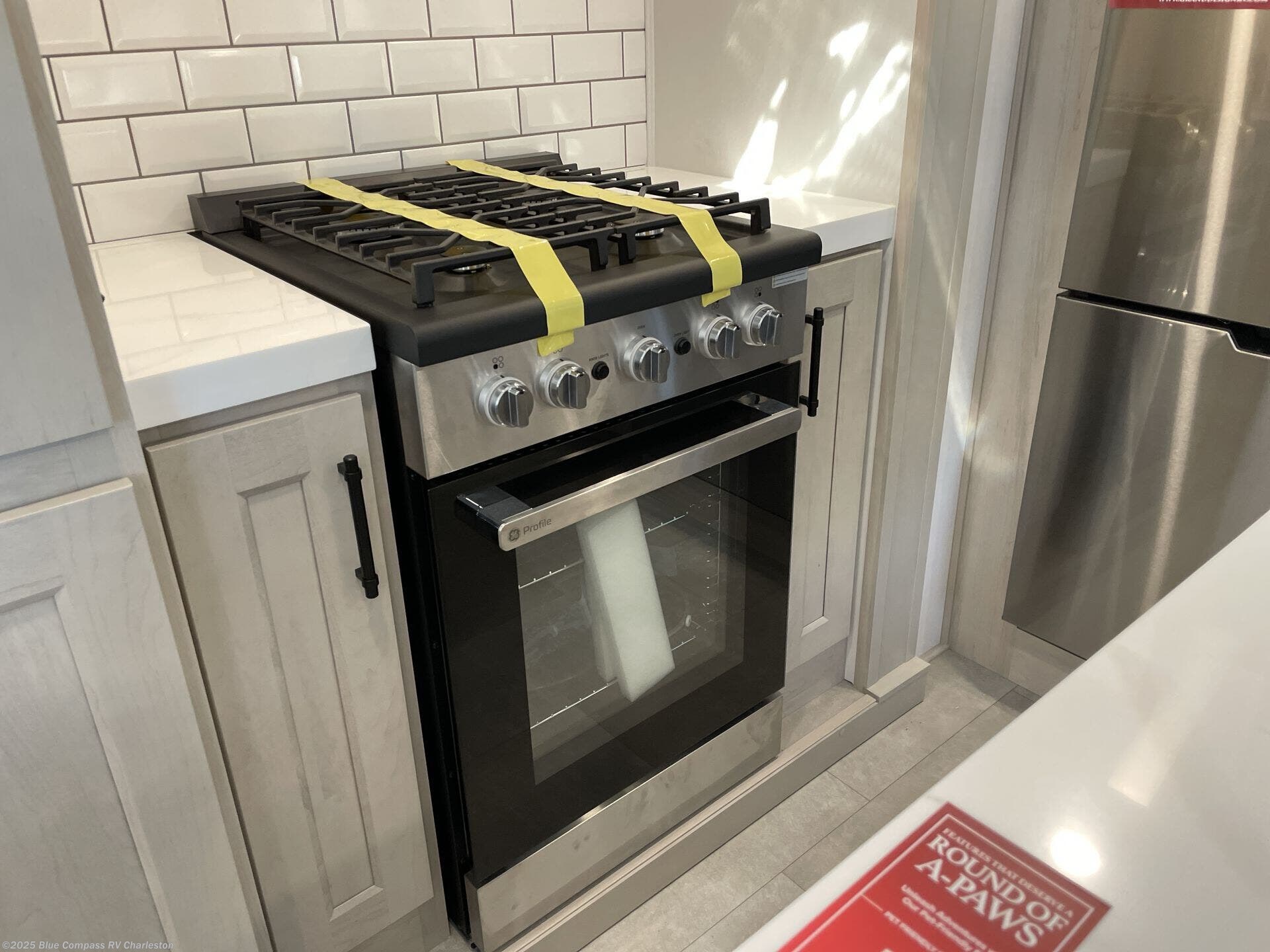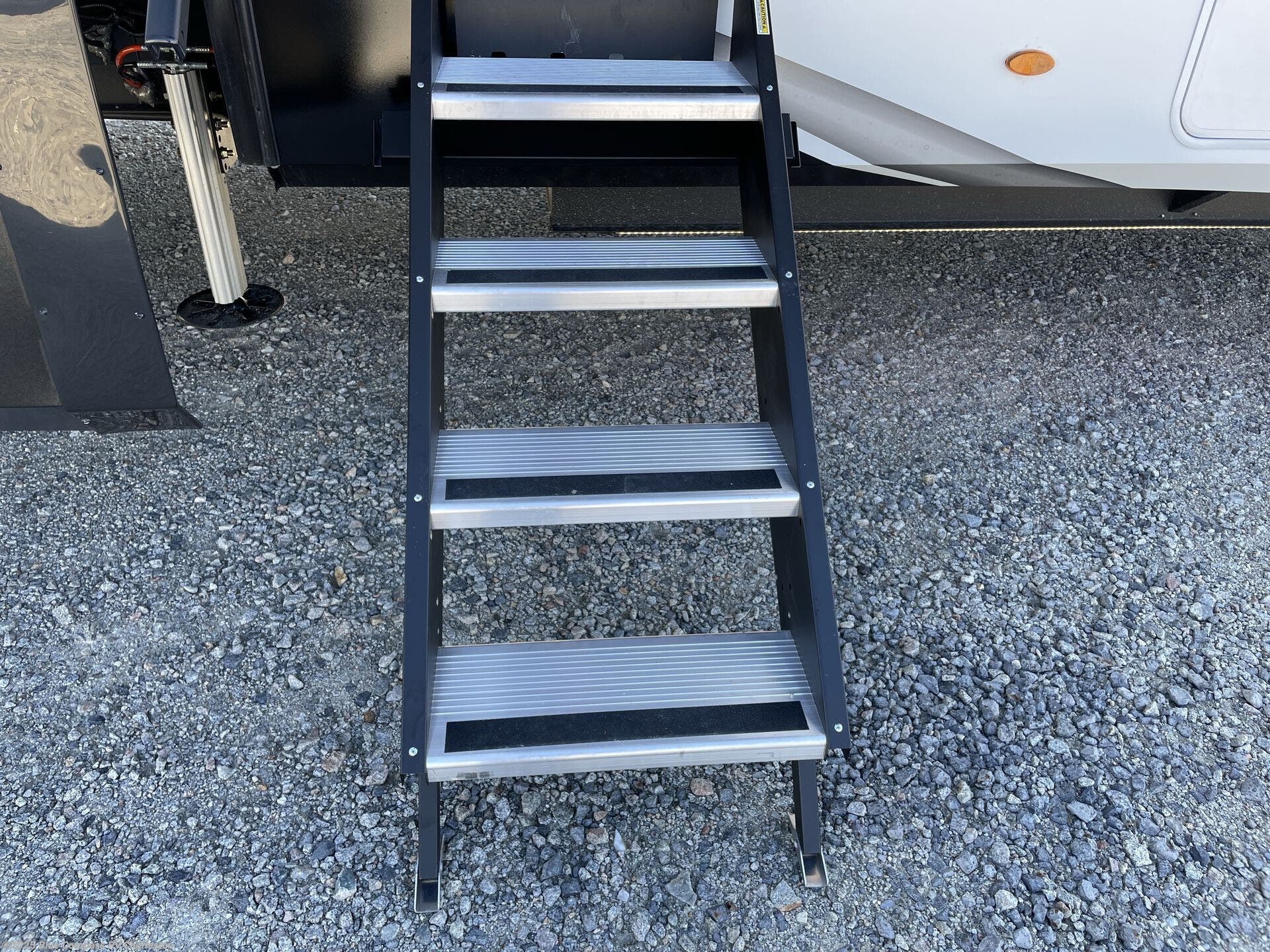 Enjoy each and every vacation, month-long trips, or even extended stays at an RV park in this spacious fifth wheel! The raised rear kitchen gives the cook plenty of room to whip up any type of meal using the stainless steel appliances including a built-in oven, an oversized pantry, and the raised bar top will provide you even more counter space on top of dining with two chairs that overlook the middle living area. Relaxing is made easy thanks to two tri-fold sofas and theatre seating while watching the big game on the LED Smart TV and enjoying the fireplace below. At night, retire to your own queen bed which slides out to provide more floor space, and you can store your clothes in the slide top dresser and front closet with washer and dryer prep.