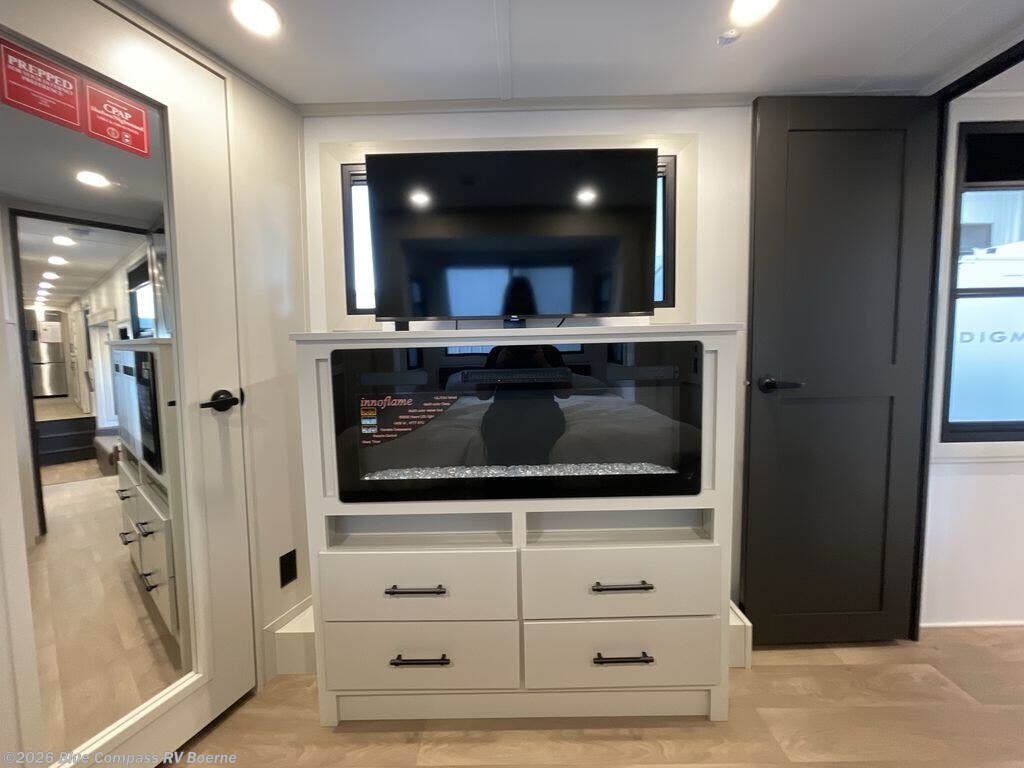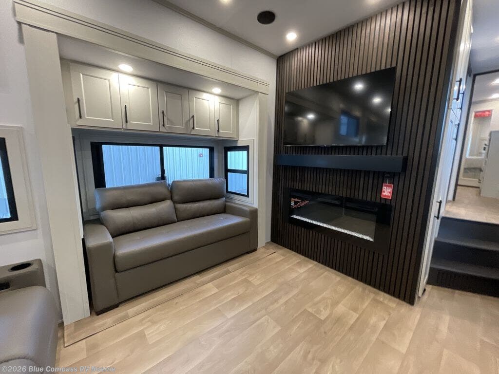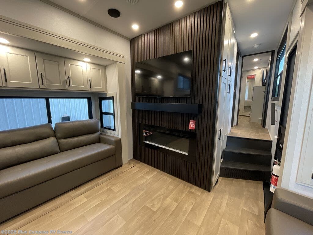 Enjoy each and every vacation, month-long trips, or even extended stays at an RV park in this spacious fifth wheel! The raised rear kitchen gives the cook plenty of room to whip up any type of meal using the stainless steel appliances including a built-in oven, an oversized pantry, and the raised bar top will provide you even more counter space on top of dining with two chairs that overlook the middle living area. Relaxing is made easy thanks to two tri-fold sofas and theatre seating while watching the big game on the LED Smart TV and enjoying the fireplace below. At night, retire to your own queen bed which slides out to provide more floor space, and you can store your clothes in the slide top dresser and front closet with washer and dryer prep.